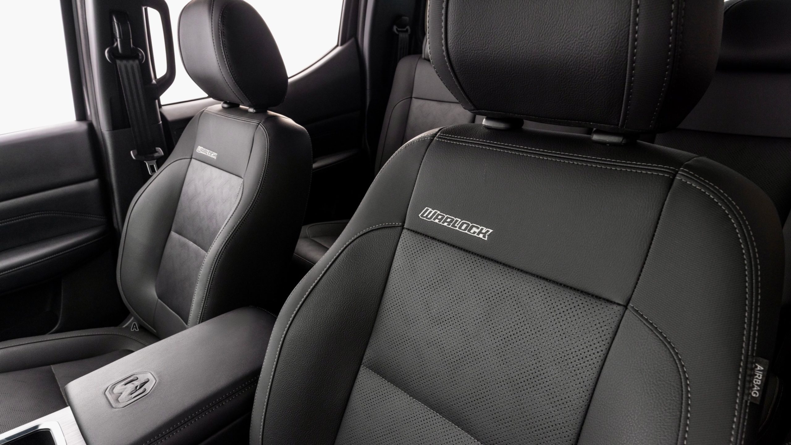 The Warlock trim gives the truck a more rugged personality with matte-black 17-inch alloy wheels, diamond-cut accents, all-terrain tires, tubular side steps, and a signature Rambar in the bed for added utility and visual punch. Warlock graphics along the rear fenders add to its tough, adventurous stance.