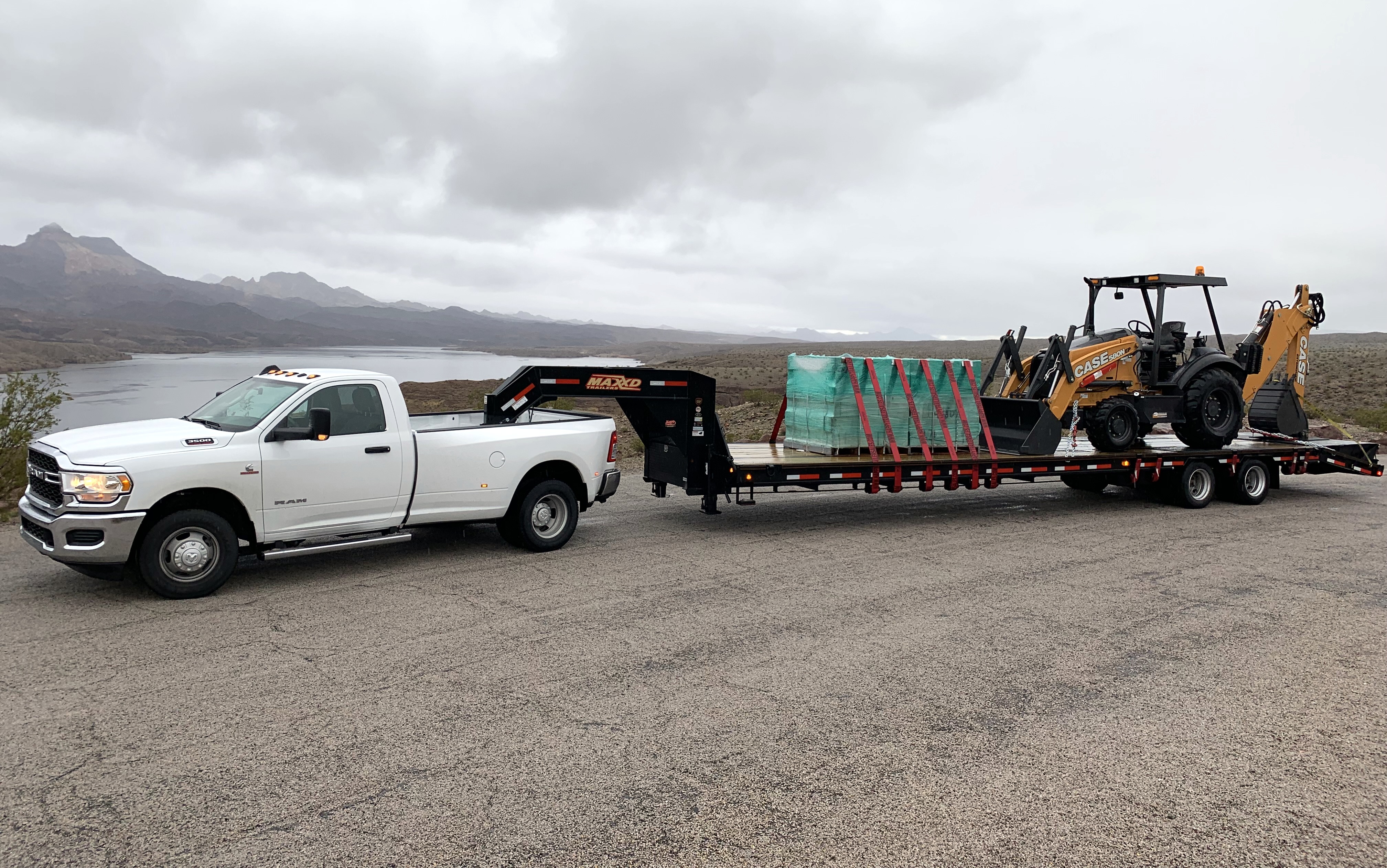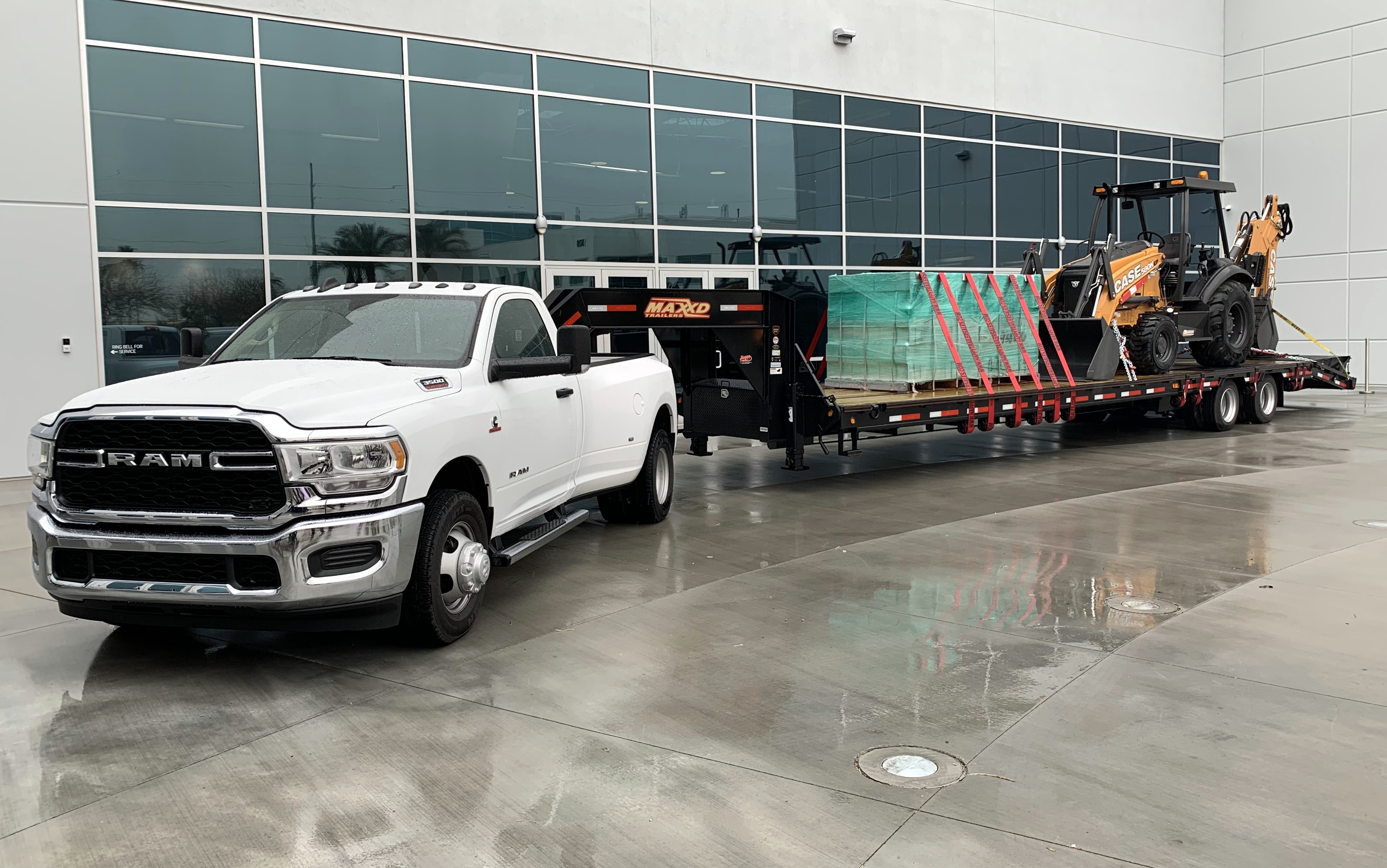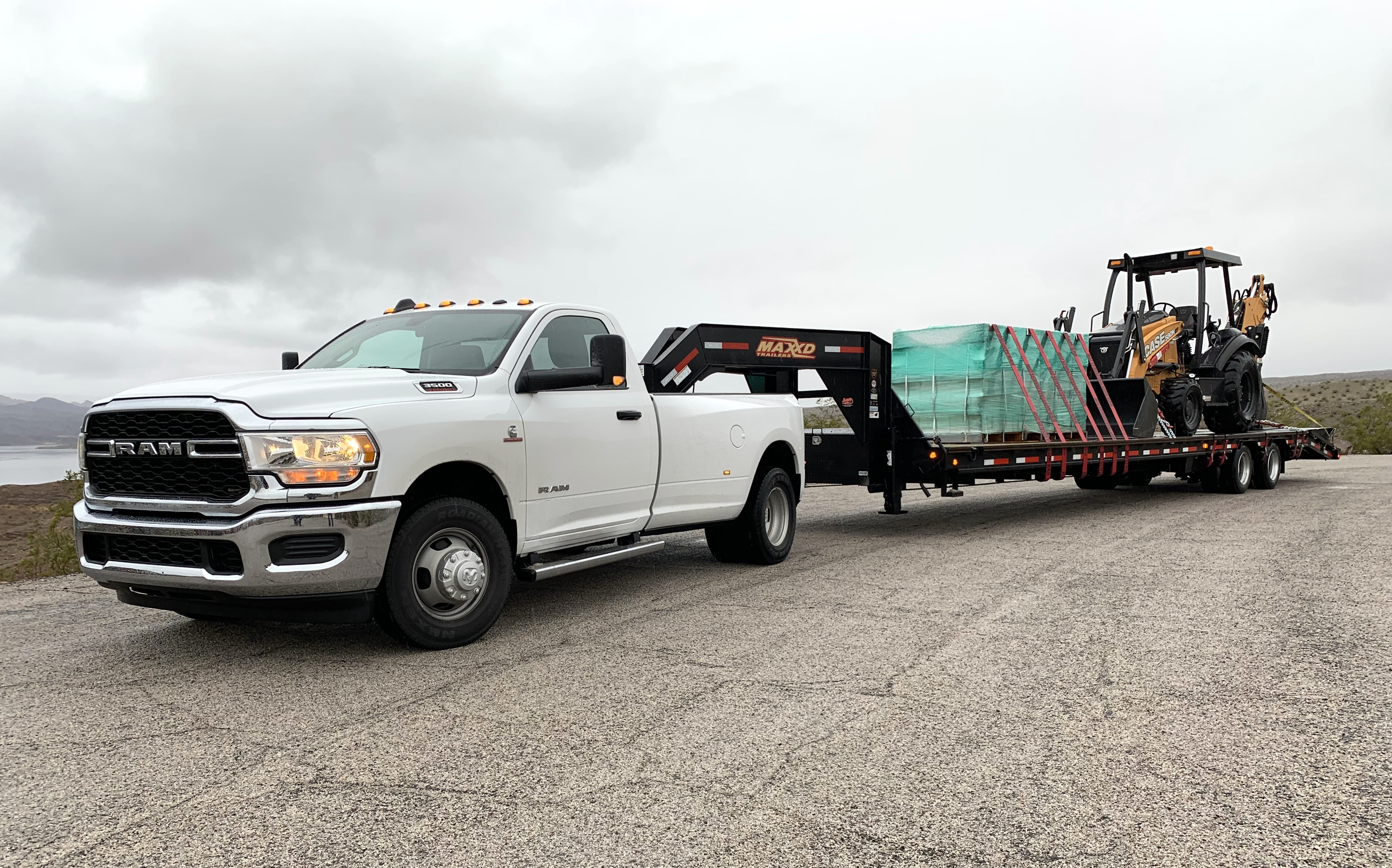 Ram was kind enough to load this truck to the max with 35,100 lbs. of Case backhoe and two pallets of weight hitched to the back of it. The new 6.7-liter H.O. Cummins had no trouble pulling the load. With a very aggressive engine brake and the optional Max Tow Package which gives the Ram 3500 a 4:10 rear axle ratio, this truck felt like it could pull anything. The 6-speed Aisin transmission provided swift shifting up the 6% grade with ease. The Max Tow Package also gave us the auto-leveling rear air suspension which allowed the trailer to stay perfectly level with the truck the whole way up the steep grade.