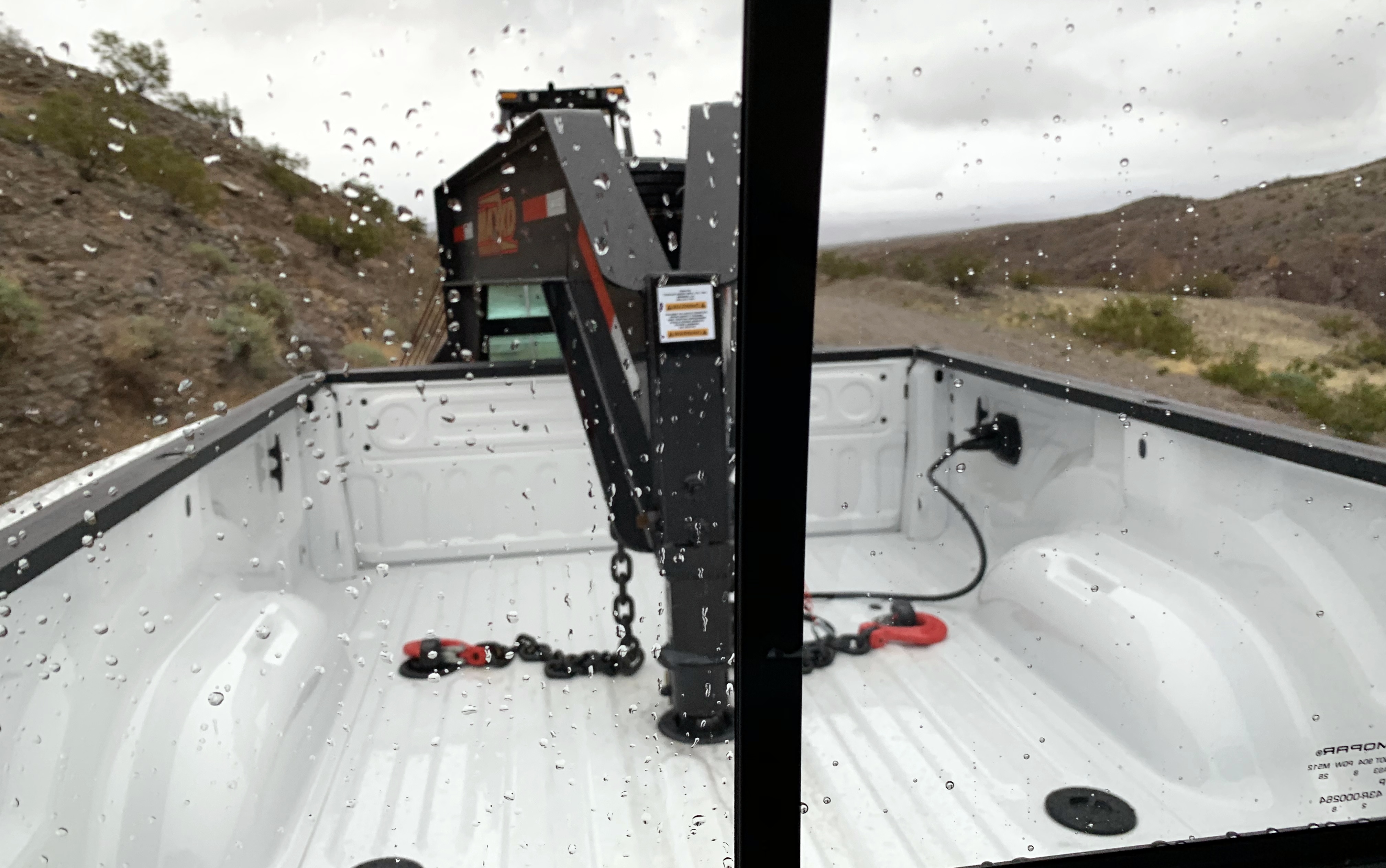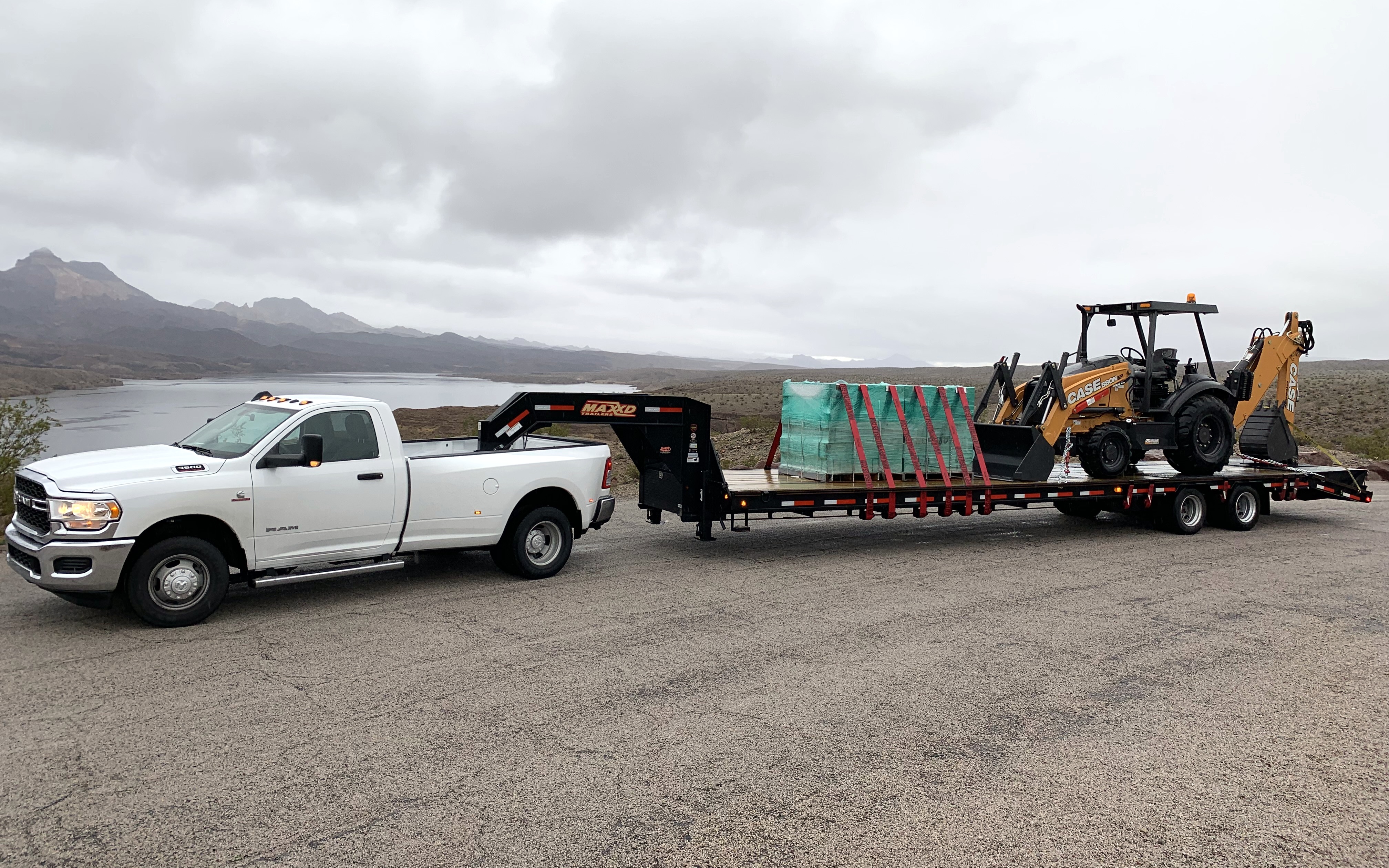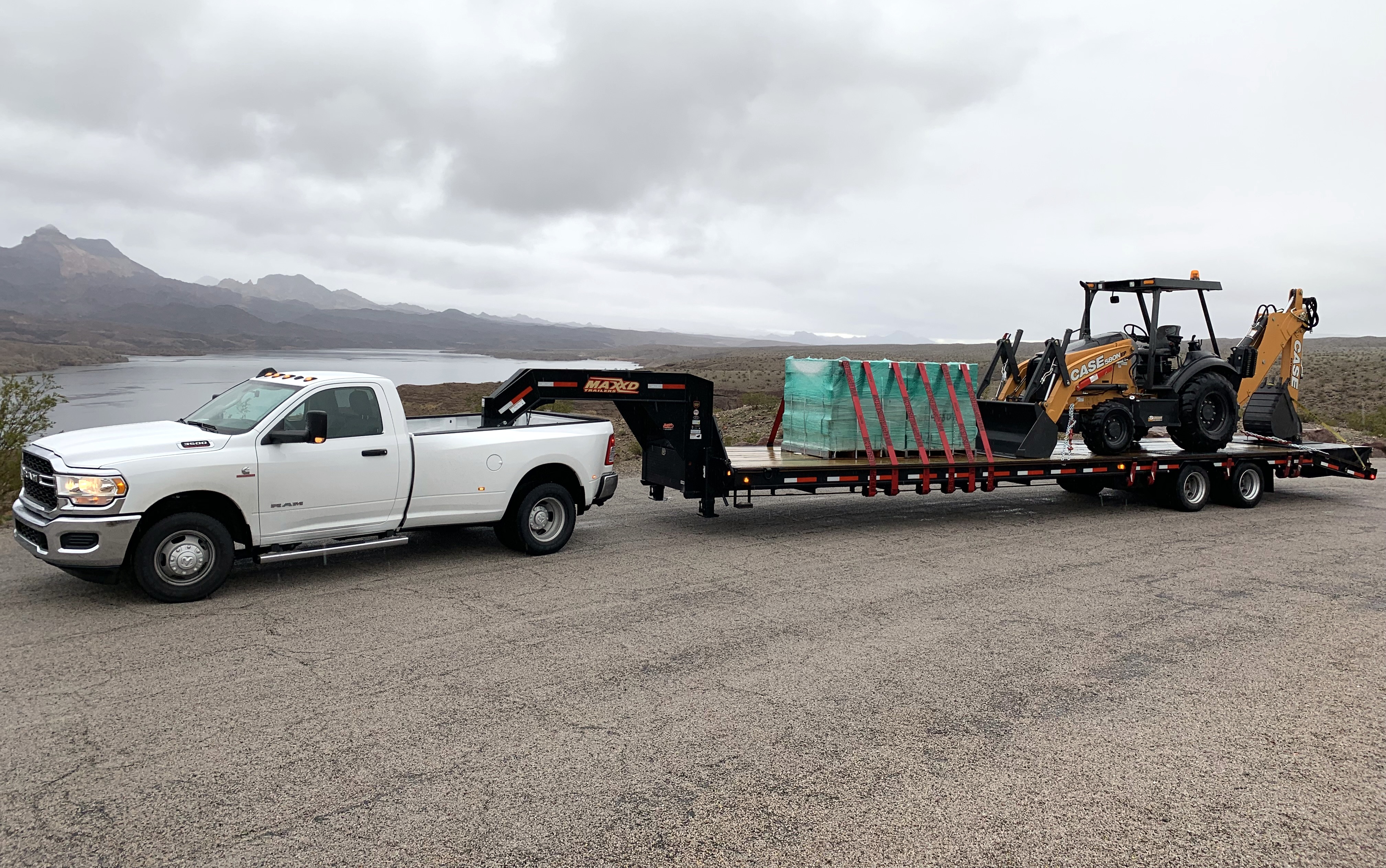 Ram was kind enough to load this truck to the max with 35,100 lbs. of Case backhoe and two pallets of weight hitched to the back of it. The new 6.7-liter H.O. Cummins had no trouble pulling the load. With a very aggressive engine brake and the optional Max Tow Package which gives the Ram 3500 a 4:10 rear axle ratio, this truck felt like it could pull anything. The 6-speed Aisin transmission provided swift shifting up the 6% grade with ease. The Max Tow Package also gave us the auto-leveling rear air suspension which allowed the trailer to stay perfectly level with the truck the whole way up the steep grade.