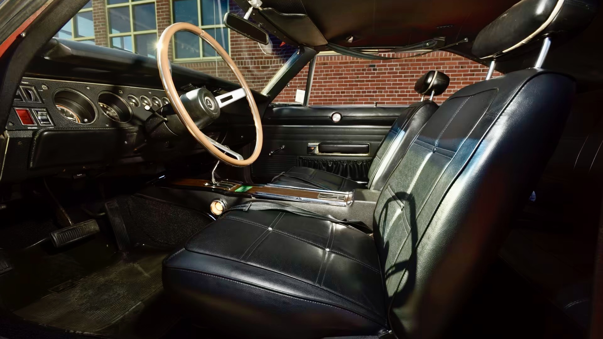 The exterior of the car is finished in the iconic HEMI® Orange (EV2) color, complemented by black accents, including a prominent rear wing. The interior is equally impressive, featuring reupholstered bucket seats with the original materials included, a C16 console with a shift handle, and a Tic-Toc-Tach. The car also retains its AM radio and functional hood pins.