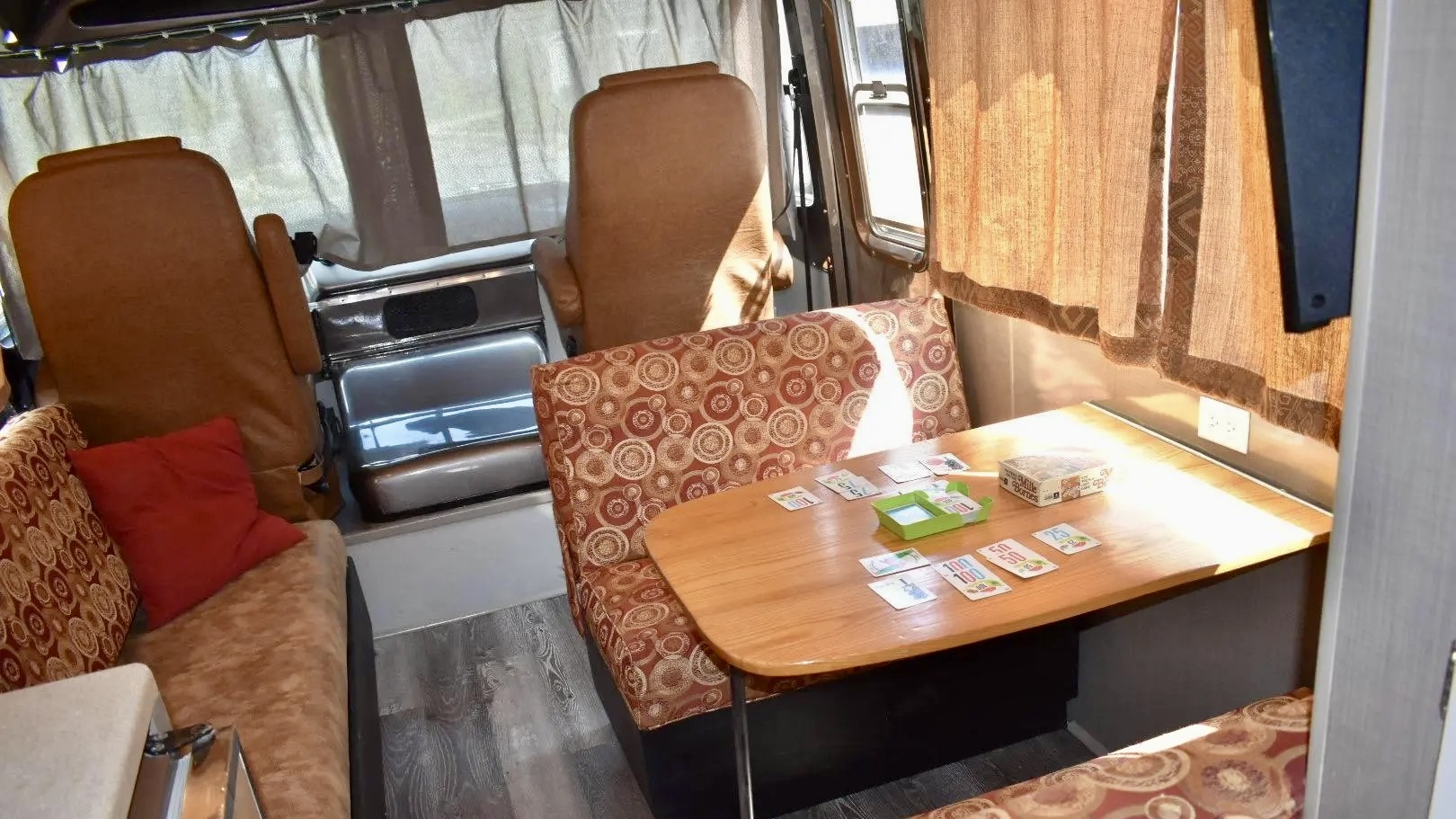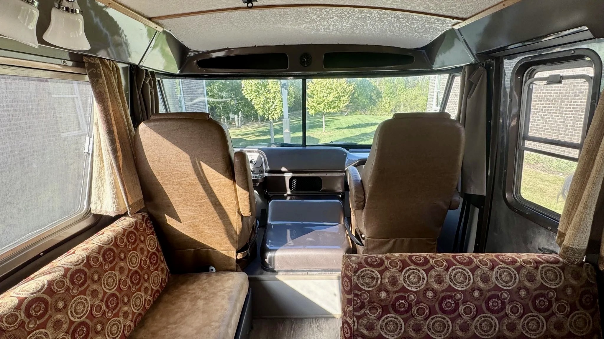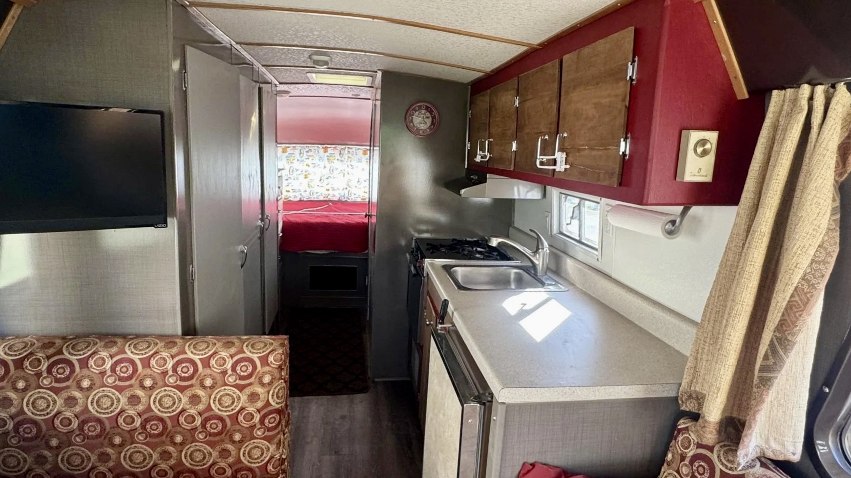 Inside, the living quarters feature woodgrain laminate flooring, updated lighting, and reupholstered seats with classic patterned cloth. The kitchenette offers a refrigerator, sink, and a three-burner range, while the wet bath has been reworked with a new toilet and sprayer. The rear bedroom even features automotive-themed drapes — a nod to the Travco’s Dodge roots. Up front, new captain’s chairs trimmed in tan vinyl complement a refreshed dash with a metallic gray finish. The iconic banjo-style steering wheel and vintage gauges complete the retro look.