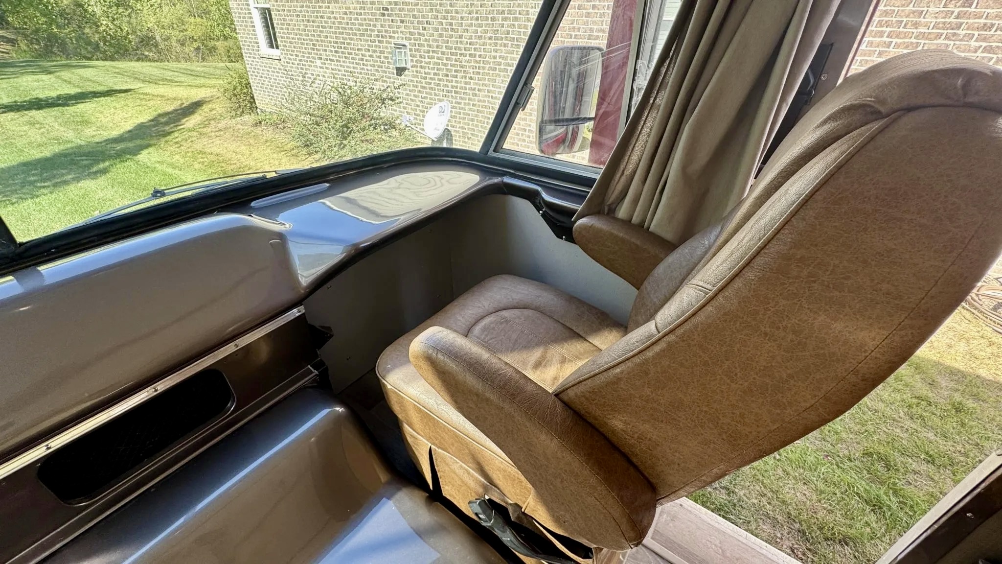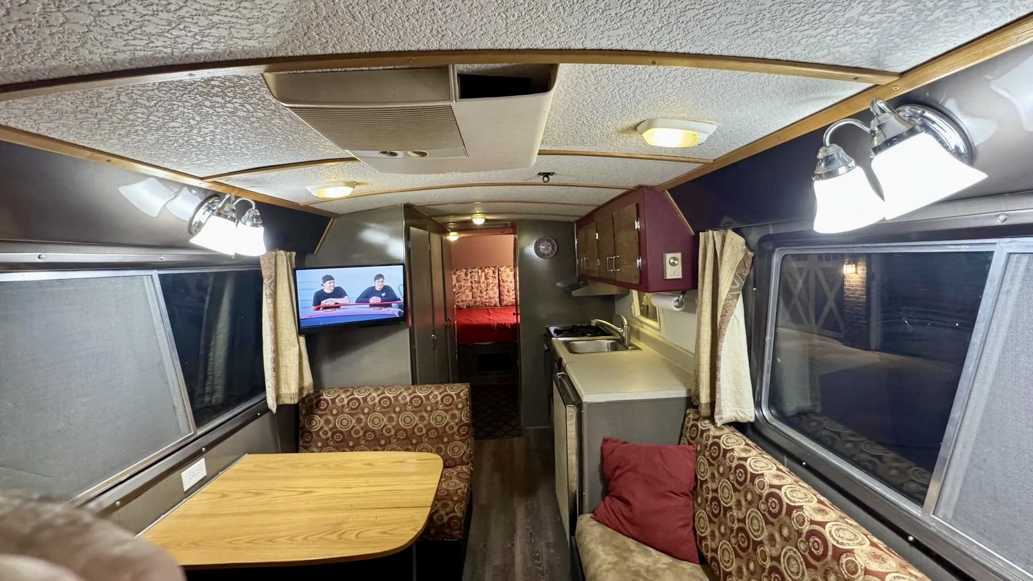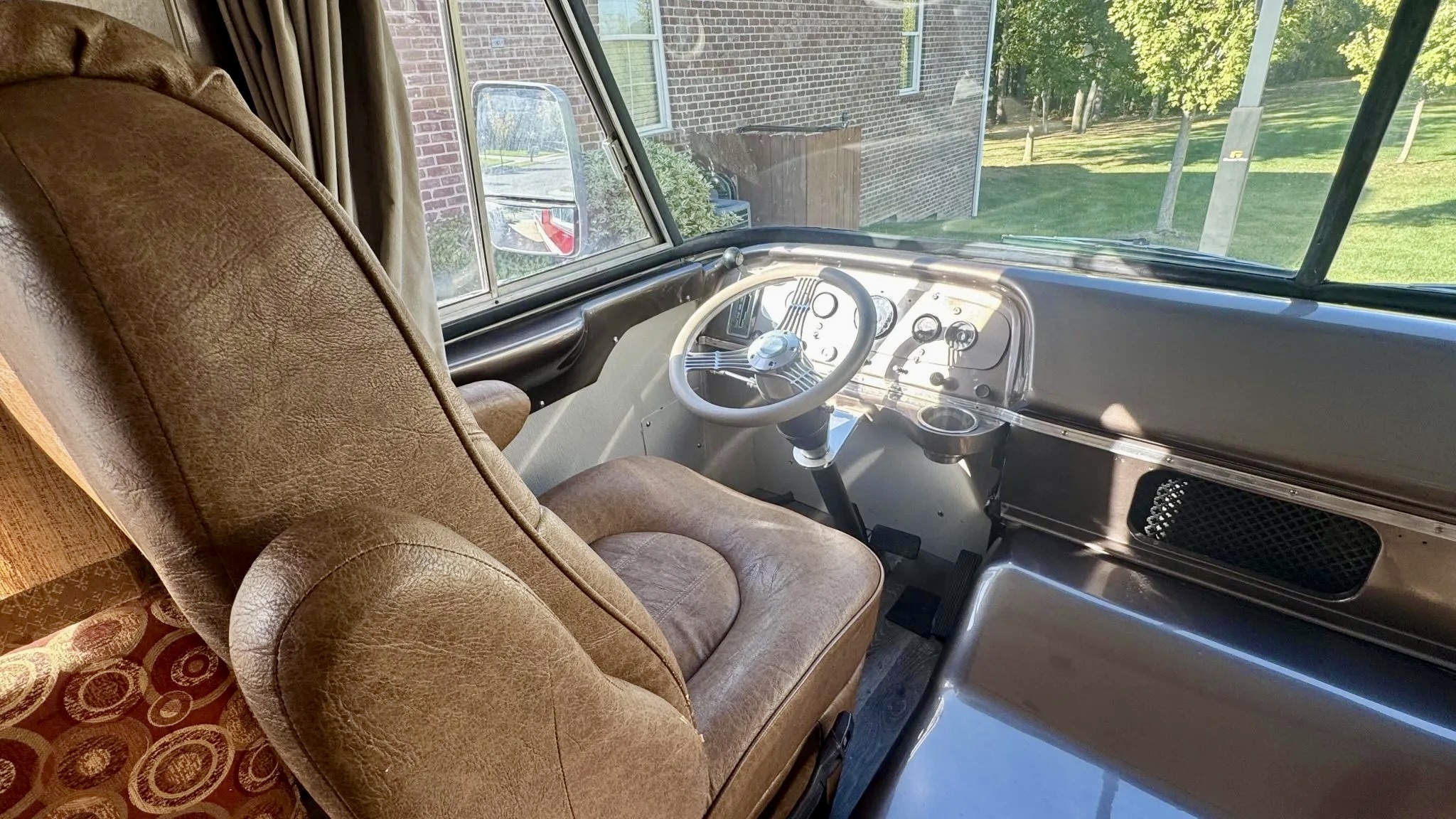 Inside, the living quarters feature woodgrain laminate flooring, updated lighting, and reupholstered seats with classic patterned cloth. The kitchenette offers a refrigerator, sink, and a three-burner range, while the wet bath has been reworked with a new toilet and sprayer. The rear bedroom even features automotive-themed drapes — a nod to the Travco’s Dodge roots. Up front, new captain’s chairs trimmed in tan vinyl complement a refreshed dash with a metallic gray finish. The iconic banjo-style steering wheel and vintage gauges complete the retro look.