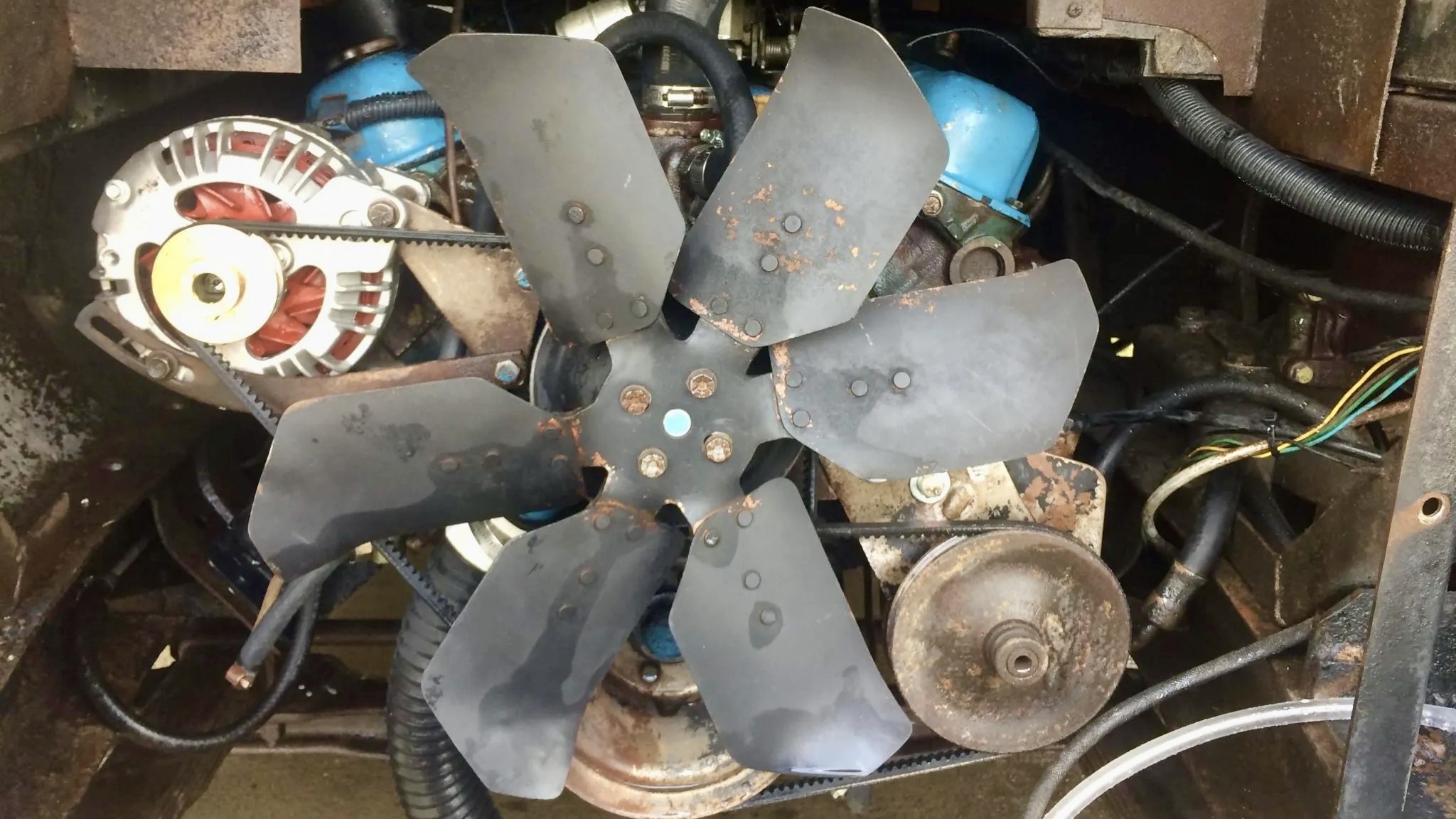 Power comes from a rebuilt 5.9-liter (360 cubic-inch) LA V8 engine, paired with a three-speed automatic transmission, which sends power to the rear wheels. The rig rides on a heavy-duty Class A chassis with leaf springs, dual rear wheels, and drum brakes on all corners — a setup built to handle serious road trips.