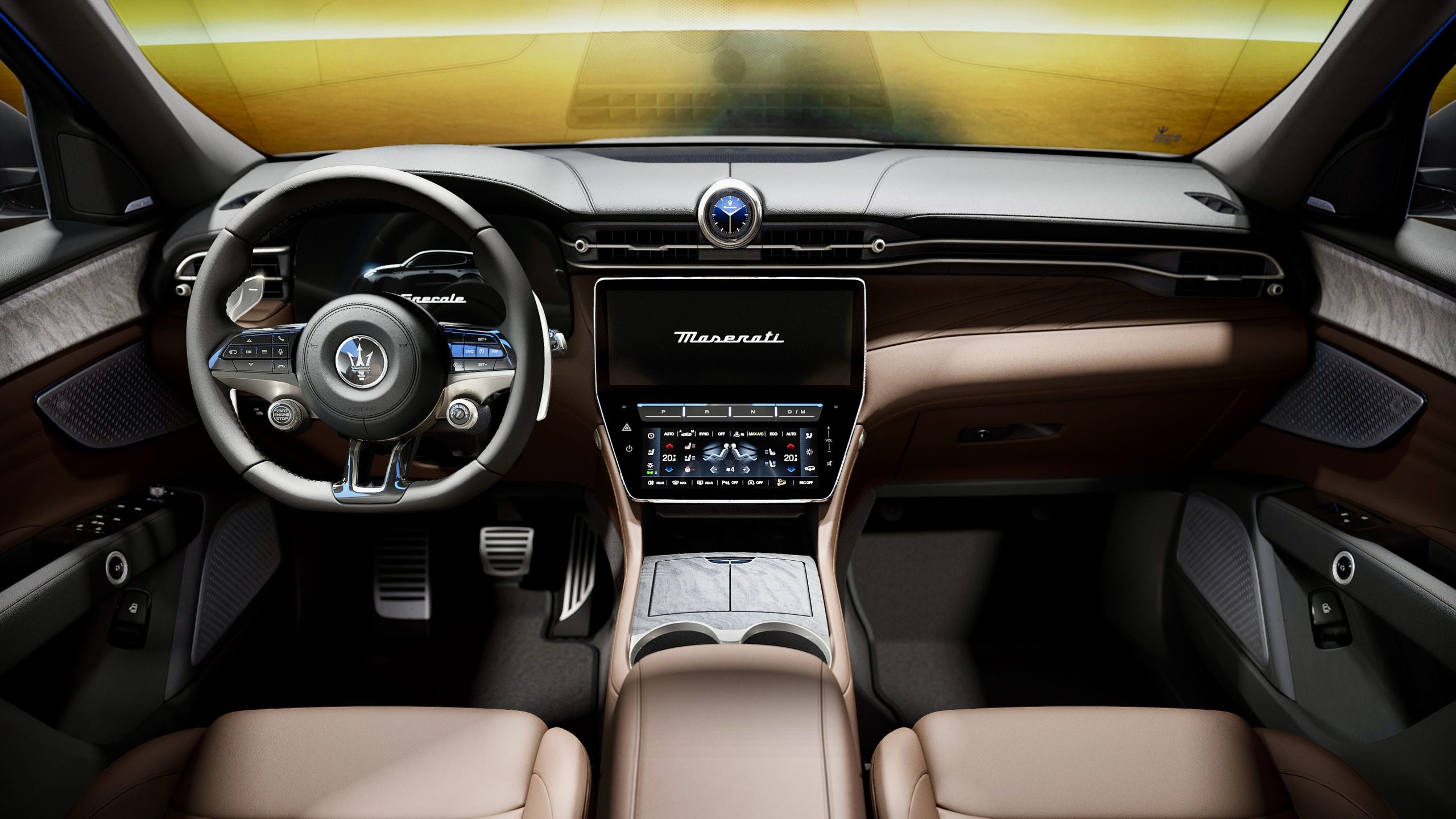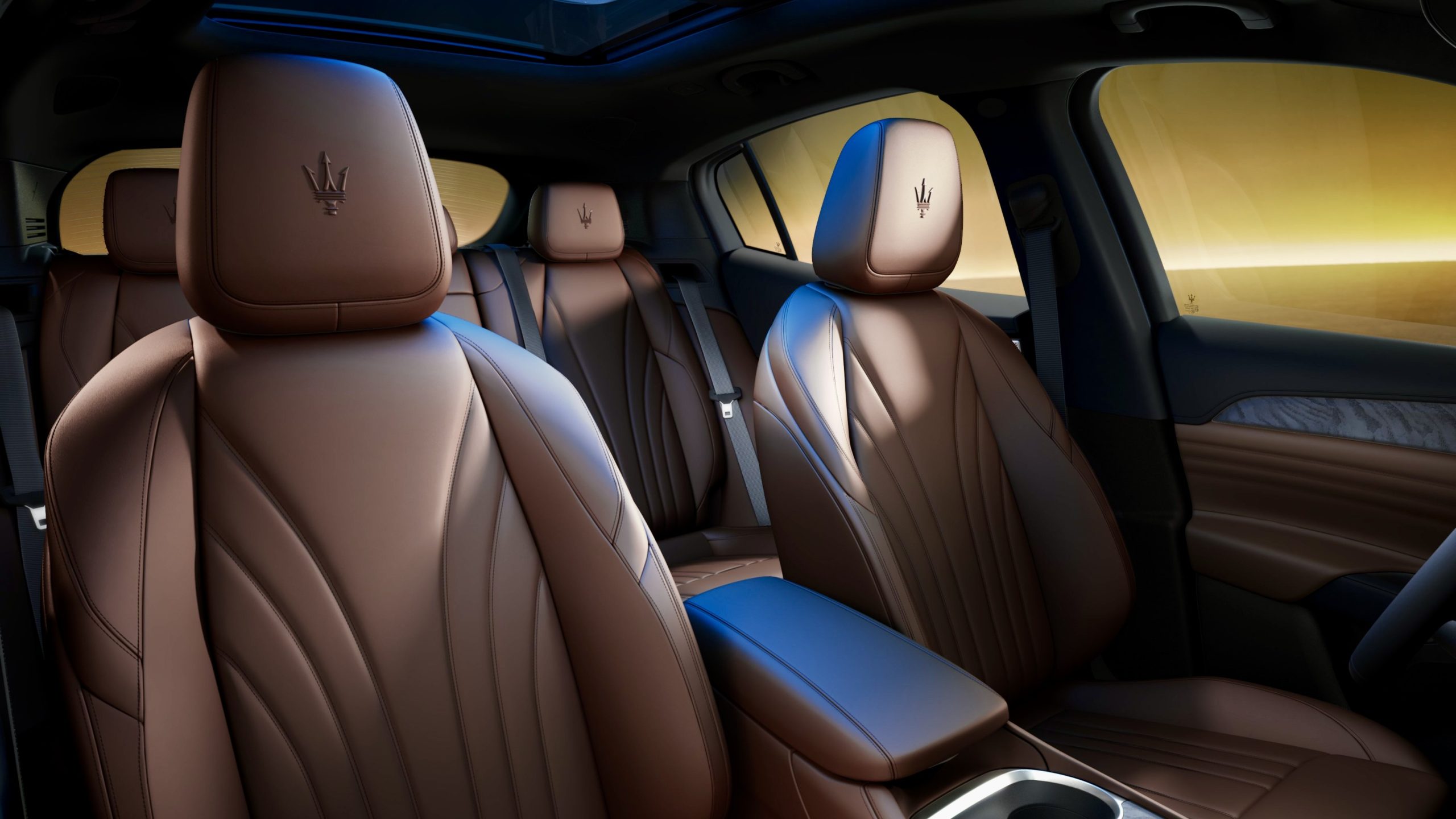 Inside, Maserati leans hard into Italian craftsmanship. Buyers can choose from Chocolate premium leather or a lighter Ghiaccio leather interior, both accented by open-pore burl wood trim and sporty steel pedals. The mix of natural materials and modern tech is where this cabin shines. Everything feels intentionally placed, from the stitching on the seats to the textures on the dash. It’s a space built for people who appreciate old-school luxury but want modern convenience.