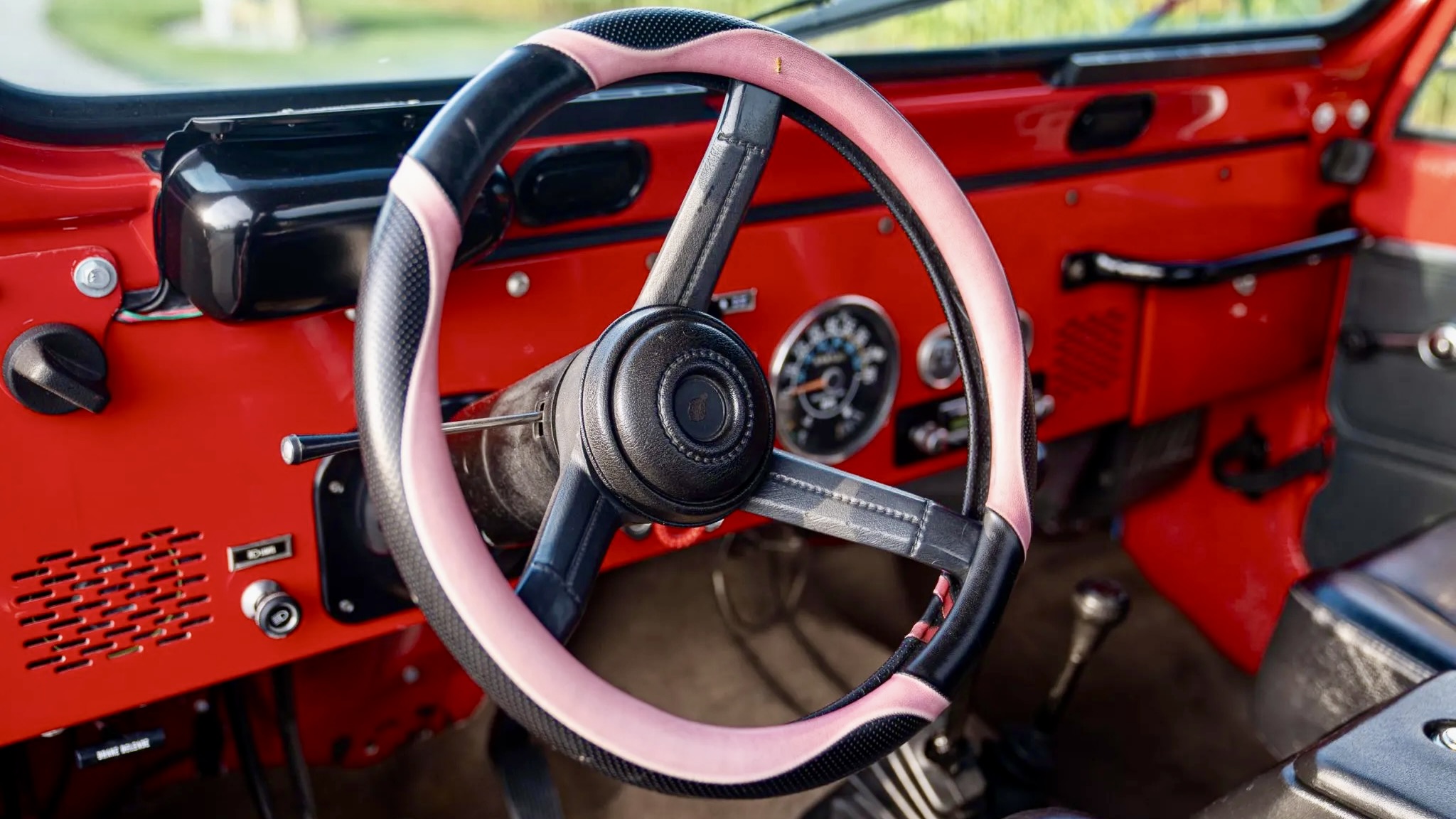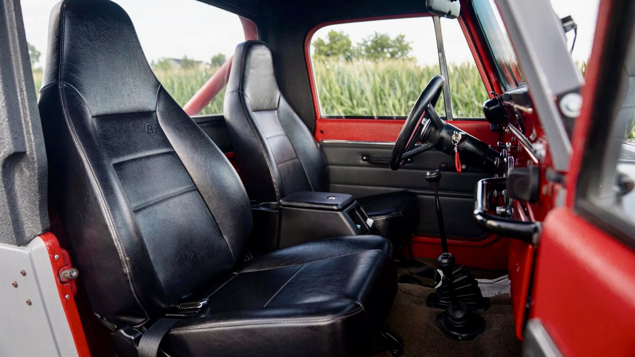 Exterior features include a removable fiberglass hardtop, a roll bar, hard doors, a drop-down tailgate, and a fold-down windshield with custom braces. Its stance is enhanced by 33×10.5-inch BFGoodrich All-Terrain T/A tires, wrapped around 15-inch wheels. Power steering and power-assisted front disc brakes make it more user-friendly, while rear drums maintain some of the original feel.