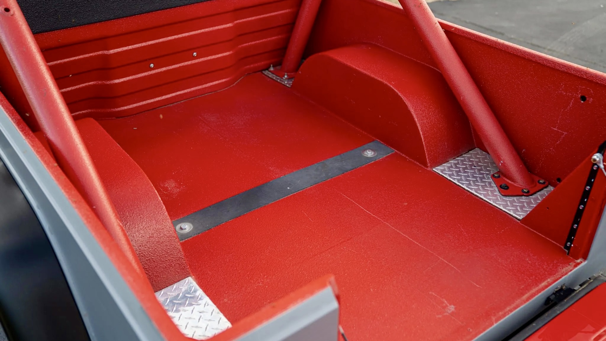 Like many Jeeps of its era, this CJ-8 didn’t escape rust issues. In 1999, the body was replaced with a fiberglass tub, and by 2012, a Throttle Down Kustoms frame had replaced the original steel one. Those upgrades gave the Scrambler a solid foundation. The body was refinished in red in 2016, but it now wears a gray vinyl wrap for a modernized look. The grille and dash were also replaced during that restoration.