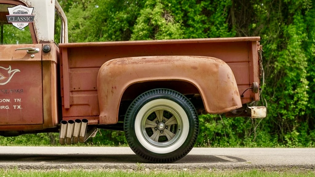 This truck doesn’t just run strong—it looks the part too. The frame is boxed up front, and the bed floor has been redone in real wood. A custom Cherry Bomb logo in a vintage patina style, created by Brian Papa Studios, lends it that old-school vibe. Inside, it’s got aftermarket gauges and a big tach, so you always know what that HEMI’s doing.