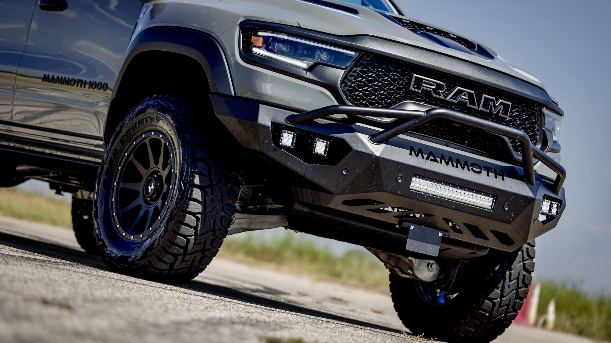 Moreover, the MAMMOTH 1000 package incorporates the Mammoth Off-Road Stage 1 package, a selection of off-road enhancements that include a 2.5-inch lift, a custom front bumper equipped with integrated LED lights, 20-inch Hennessey 10-spoke wheels, rugged 35-inch off-road tires, and a front suspension leveling kit. Additionally, it comes with a retractable electronic bed cover and power fold-out steps for added convenience.