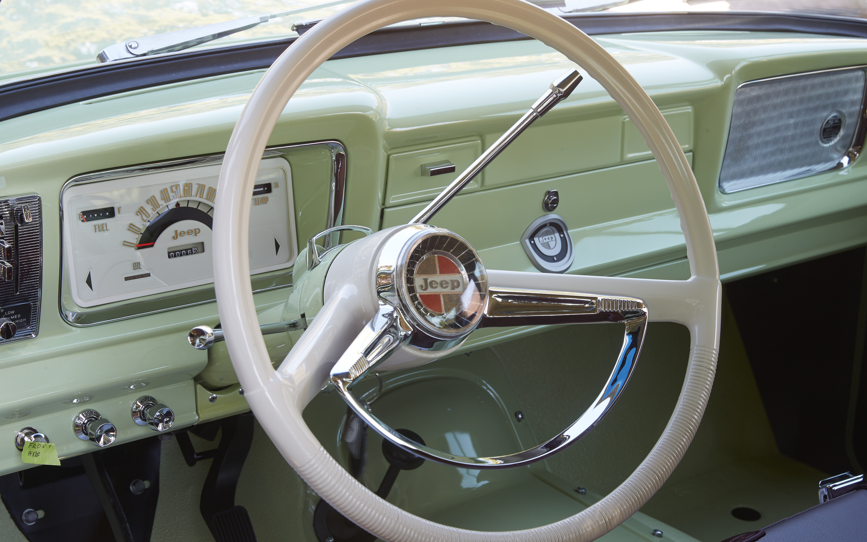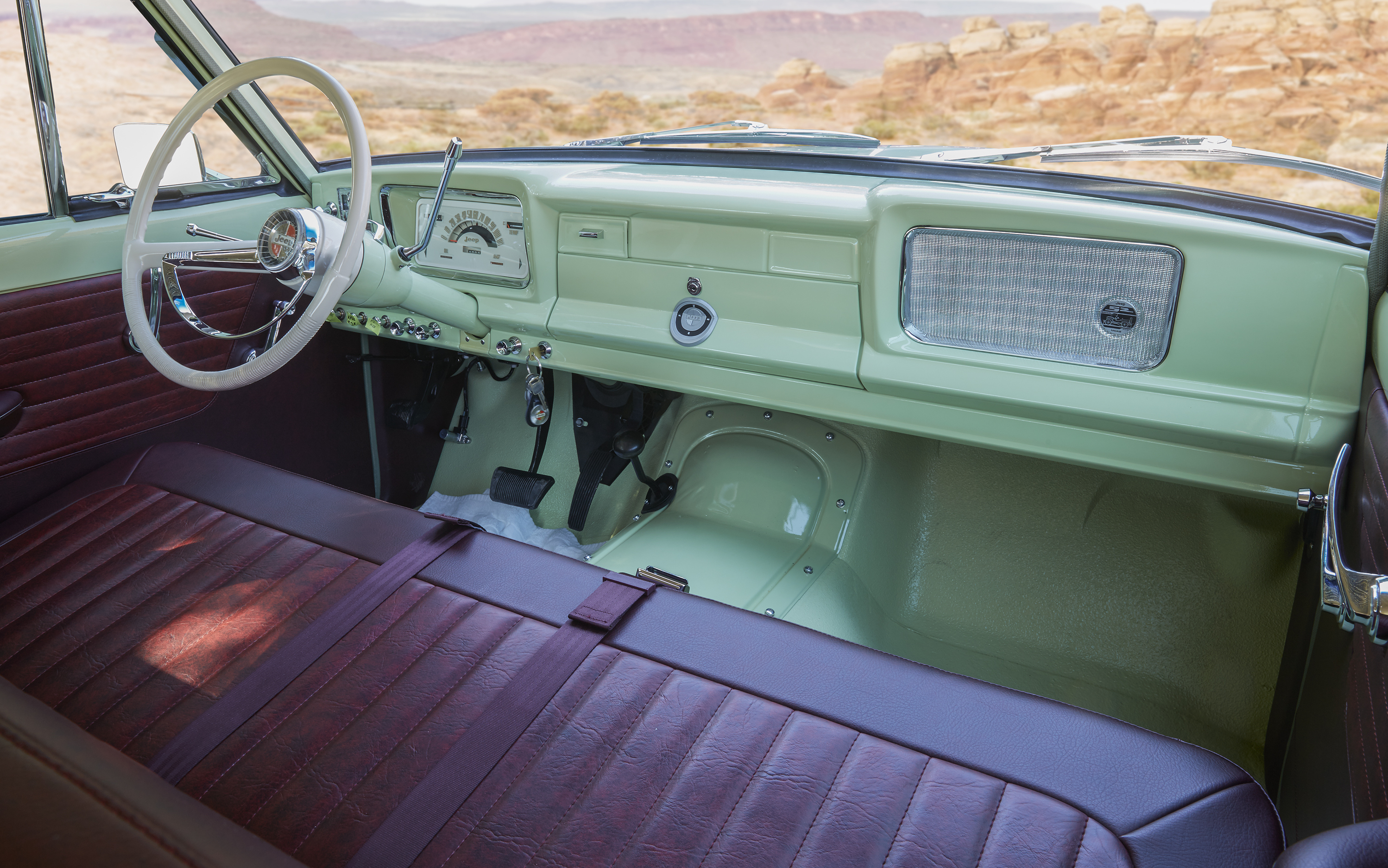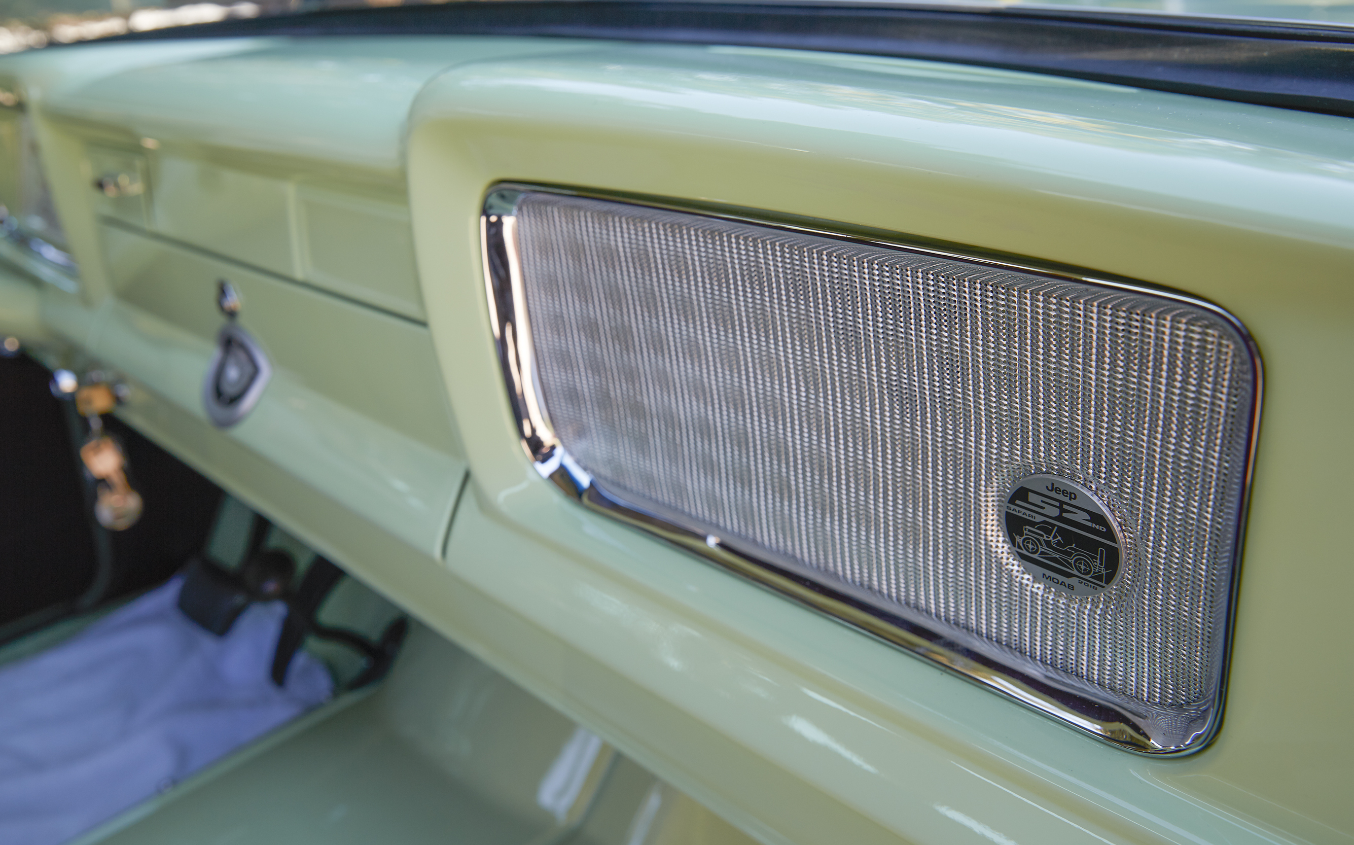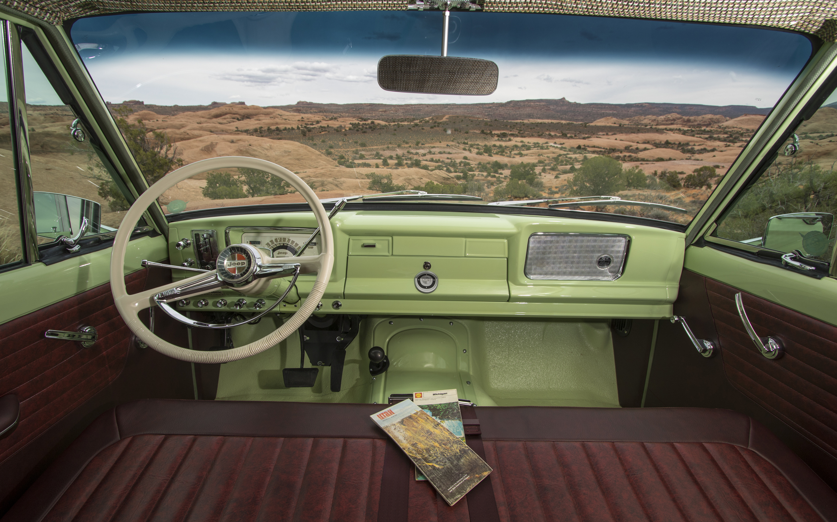Inside, the Wagoneer features original front and rear bench seats, door panels, kick and rear panels, all trimmed in Oxblood-colored leather. A wicker headliner gives the Wagoneer an open, lighter feel and the floor has been bedlined. Additional interior details include a custom cooler fashioned from period-correct luggage, and a tool box created from the valve cover of this Wagoneer’s original 230 Tornado OHC-6 engine.