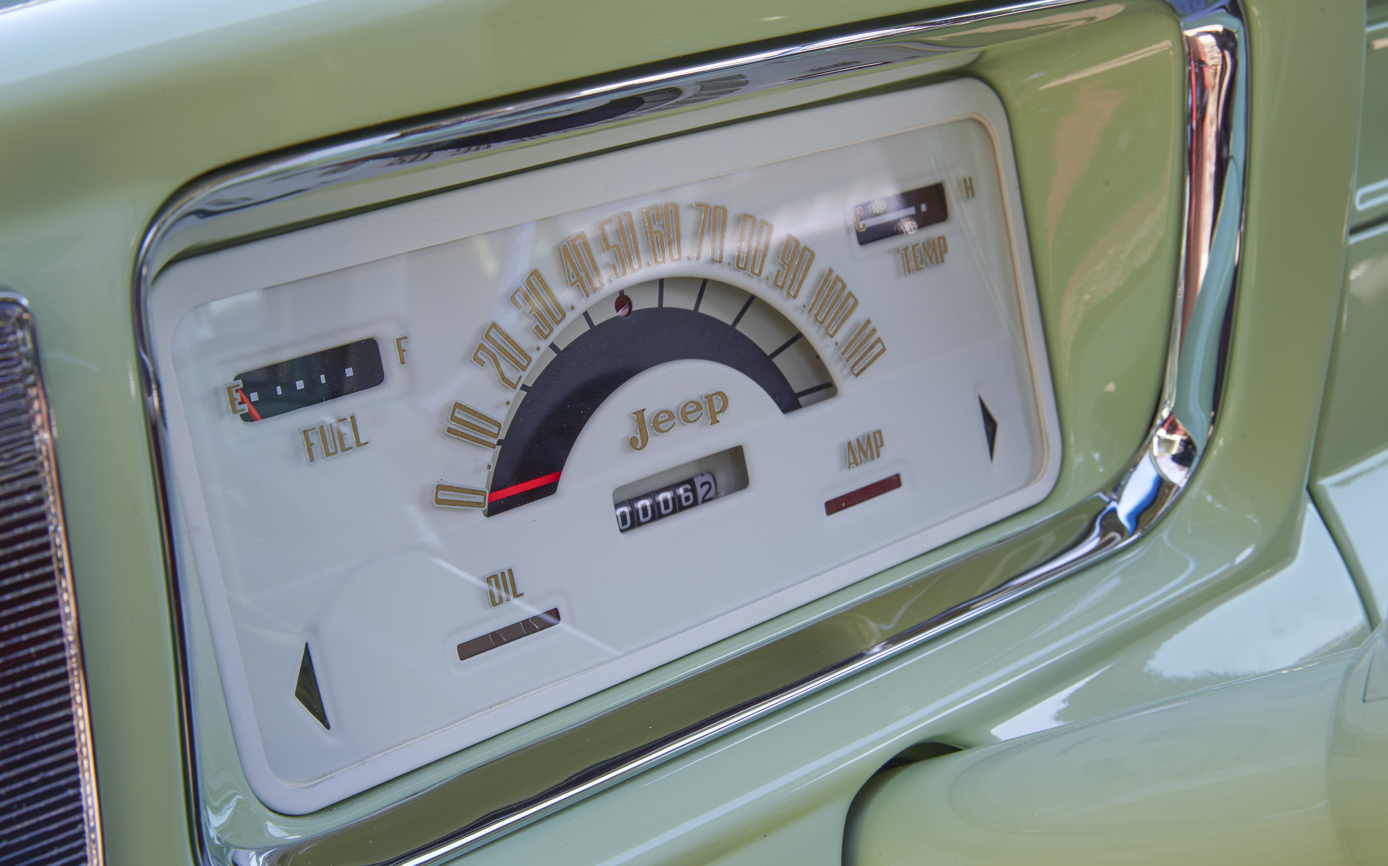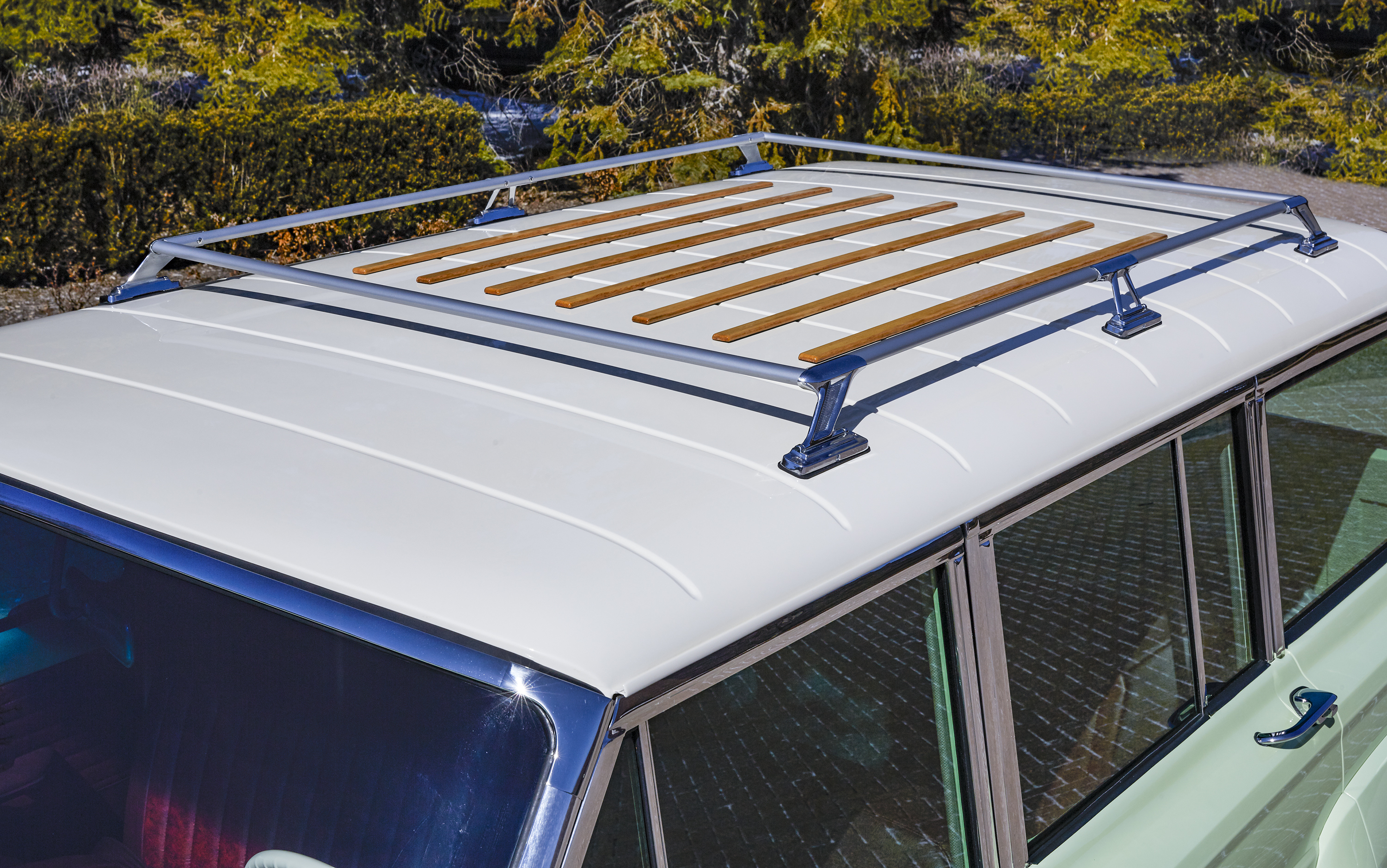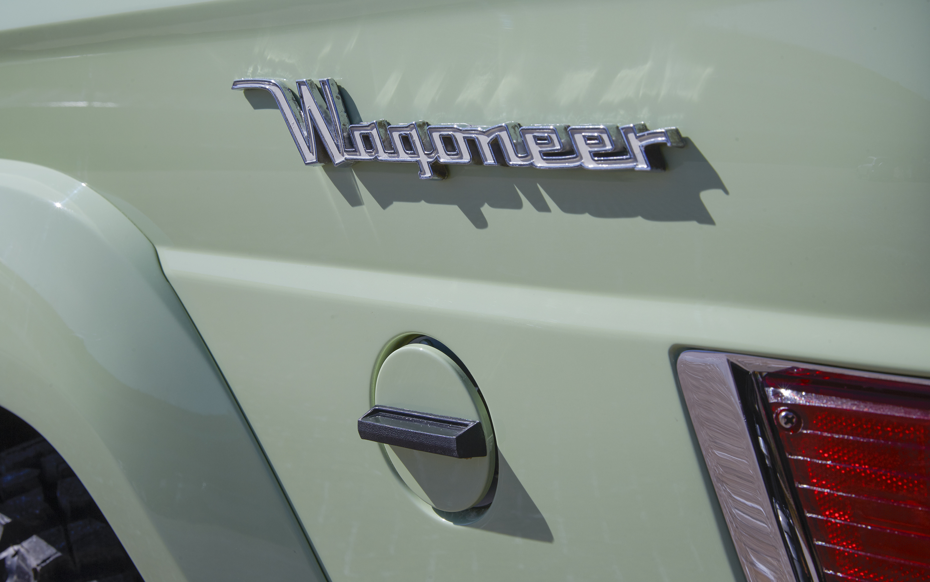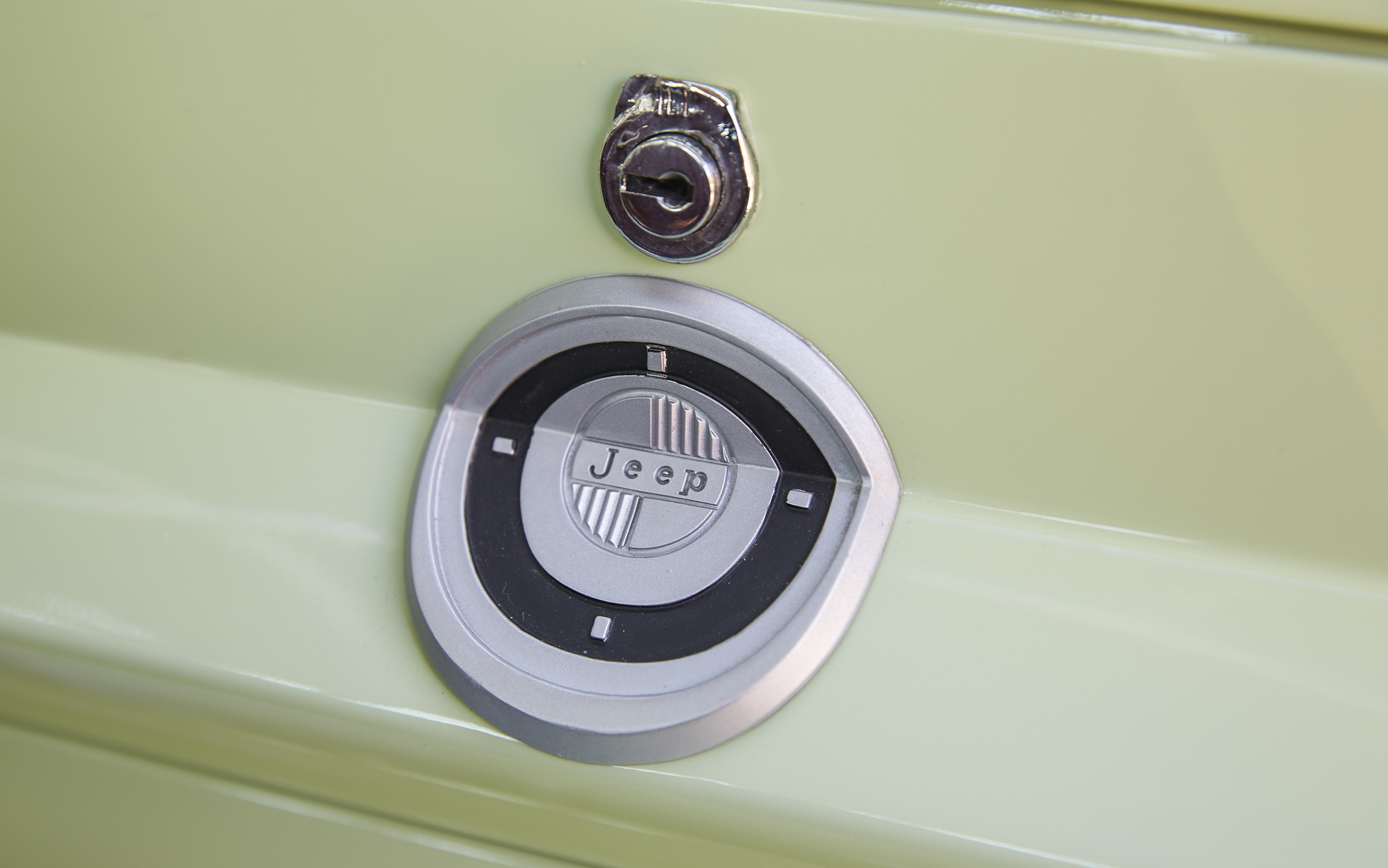Inside, the Wagoneer features original front and rear bench seats, door panels, kick and rear panels, all trimmed in Oxblood-colored leather. A wicker headliner gives the Wagoneer an open, lighter feel and the floor has been bedlined. Additional interior details include a custom cooler fashioned from period-correct luggage, and a tool box created from the valve cover of this Wagoneer’s original 230 Tornado OHC-6 engine.