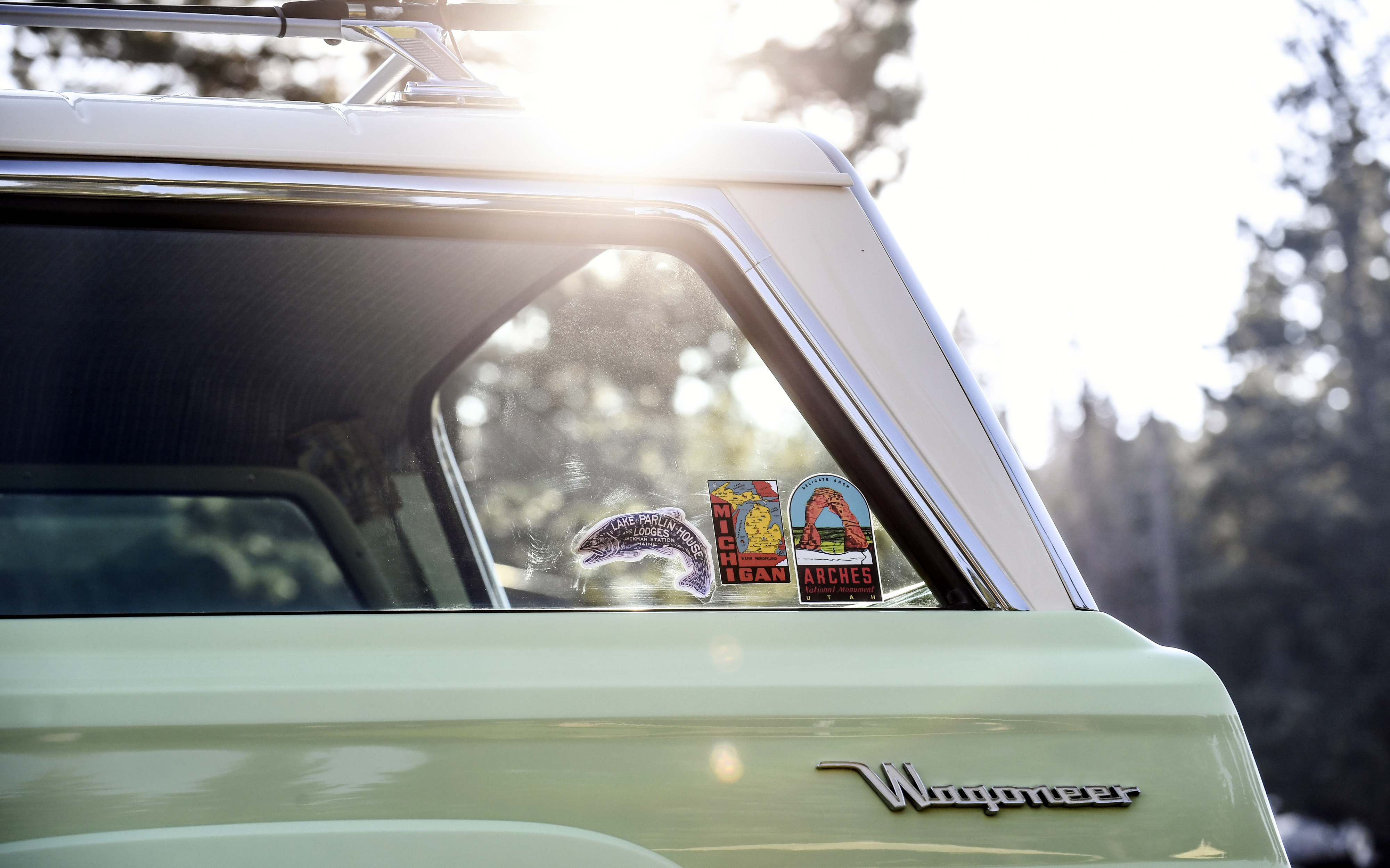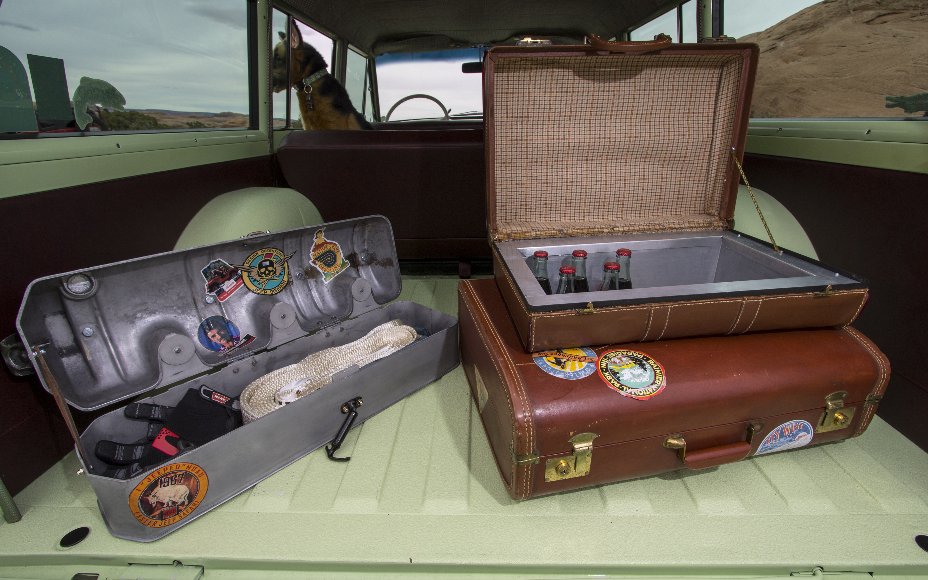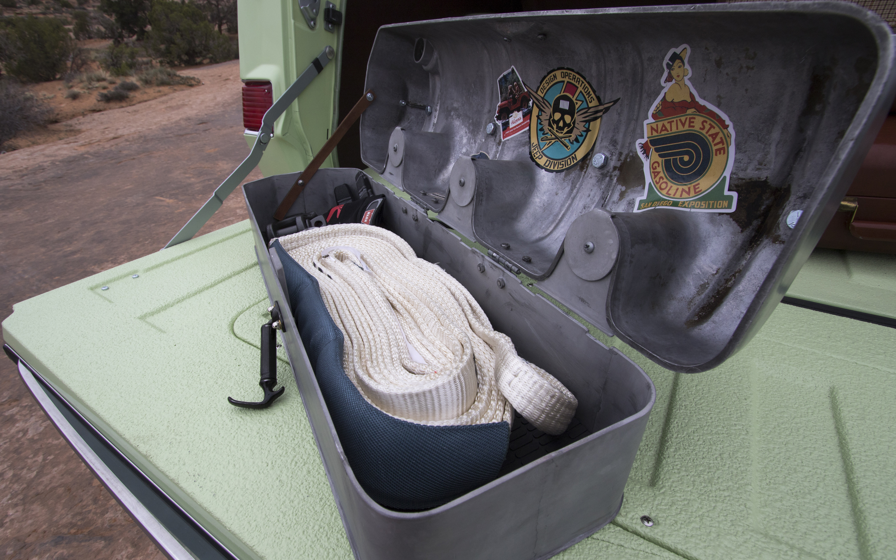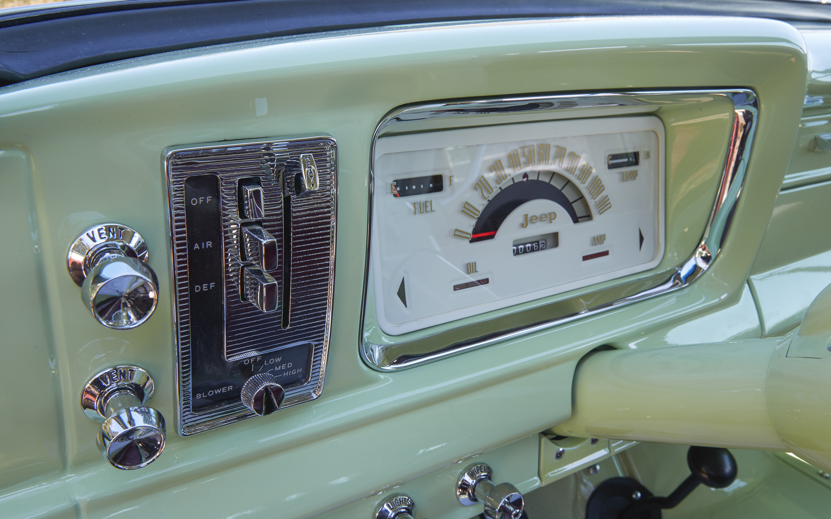 Inside, the Wagoneer features original front and rear bench seats, door panels, kick and rear panels, all trimmed in Oxblood-colored leather. A wicker headliner gives the Wagoneer an open, lighter feel and the floor has been bedlined. Additional interior details include a custom cooler fashioned from period-correct luggage, and a tool box created from the valve cover of this Wagoneer’s original 230 Tornado OHC-6 engine.