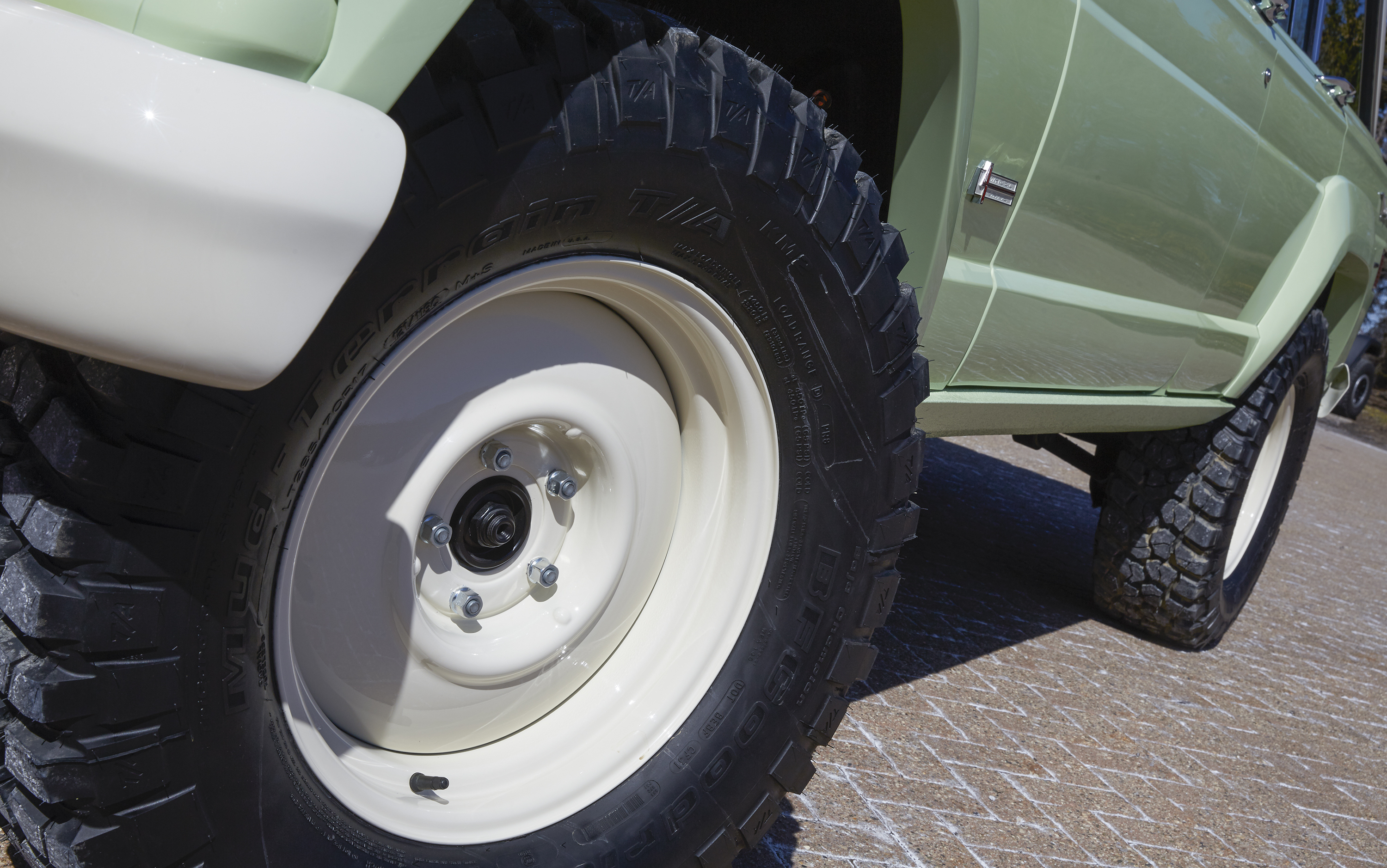 The Wagoneer’s off-road capability has been bolstered courtesy of a boxed and reinforced frame, Dana 44 front and rear axles with lockers, four-link suspension with coilover springs, and 17-inch steel wheels wrapped in 33-inch BFGoodrich Mud-Terrain tires.