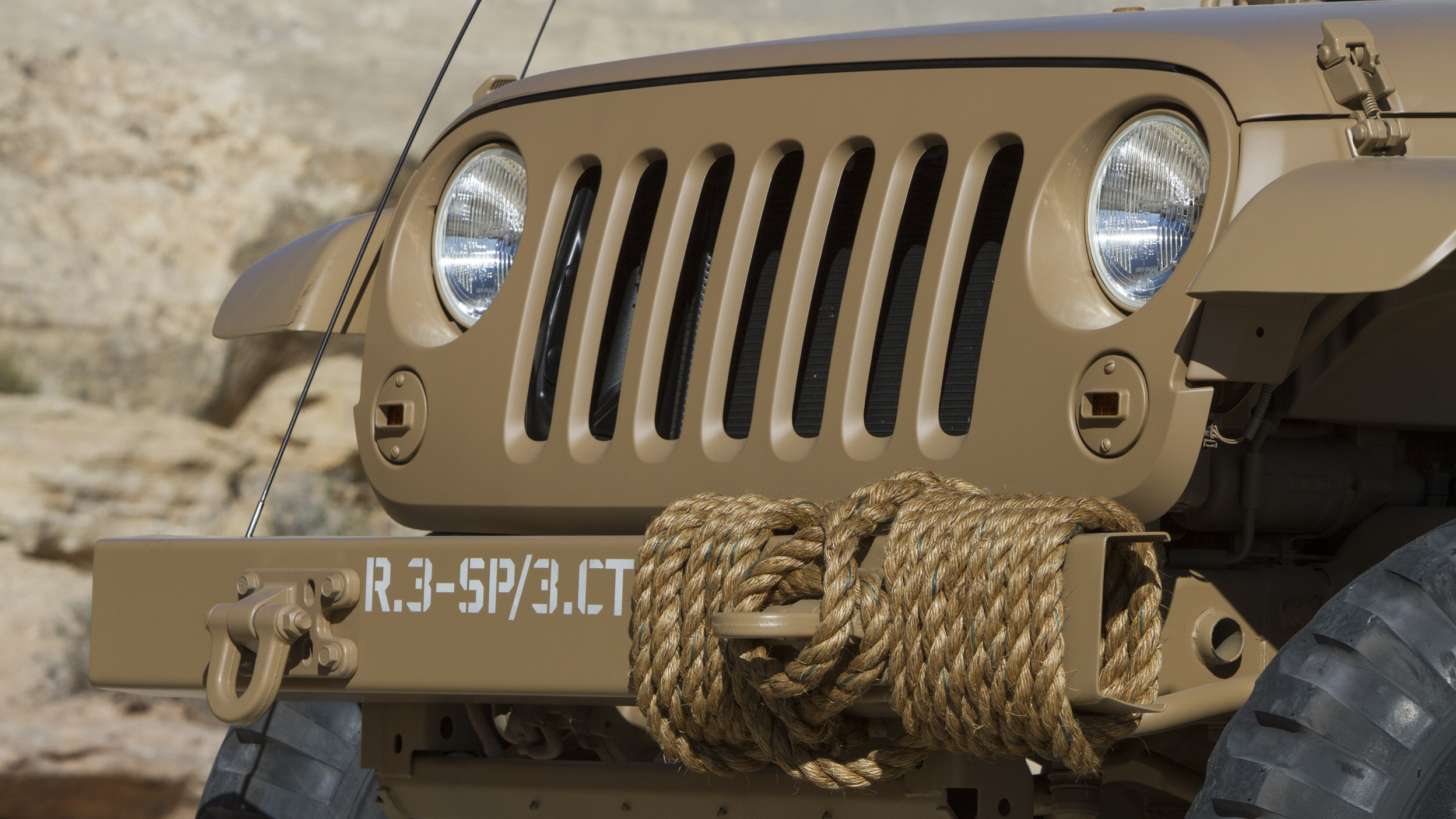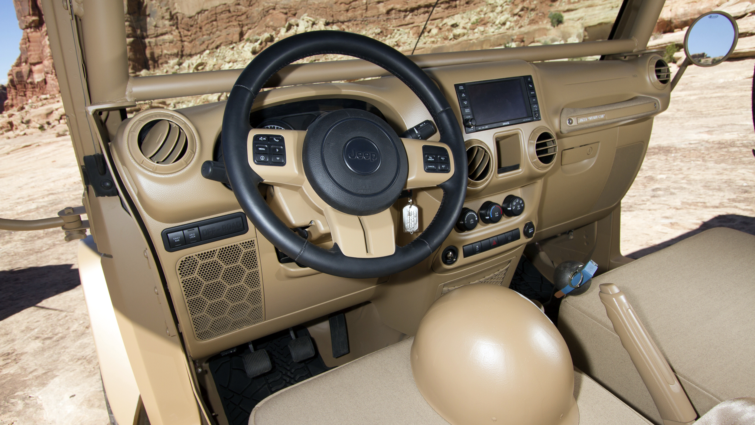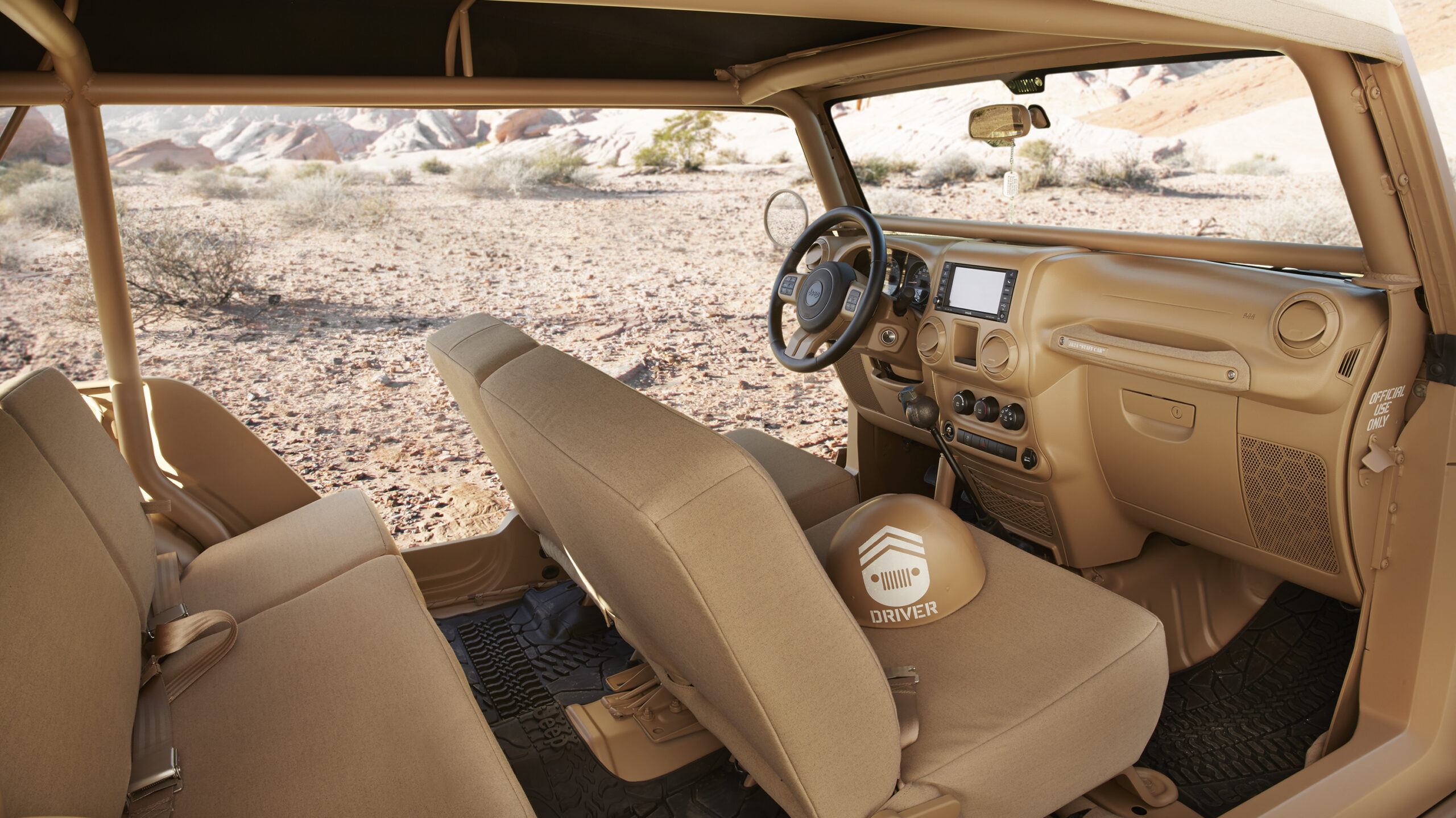 Under the hood, the Staff Car Concept was powered by the 3.6-liter Pentastar V6 engine mated to a 6-speed manual transmission. The Staff Car Concept also featured a Jeep Performance Parts (JPP) 2-inch lift kit with Fox shocks and front and rear Dana 44 axles from Mopar, specifically built for the Wrangler JK.