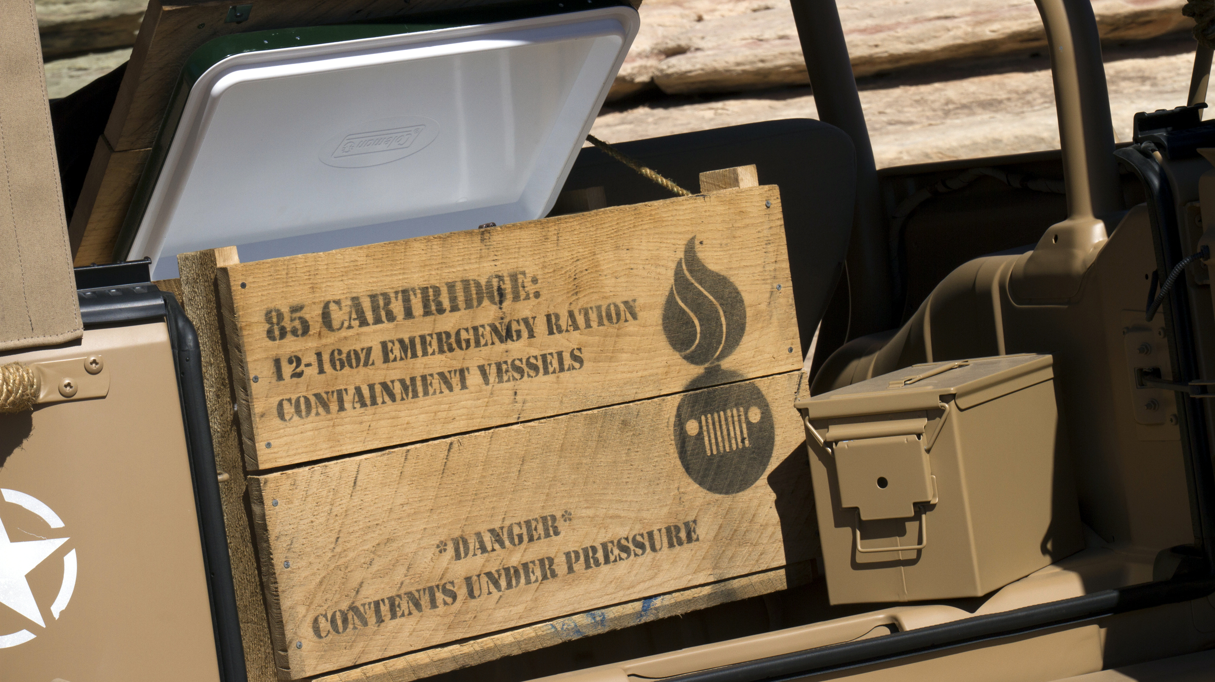 Inside, a minimalist interior featured low-backed bench seats in the first and second row, an integrated roll cage, and a painted steel floor in place of carpet. A built-in cooler drew its inspriation from an old artillery box and could acommodate 85 cans of your favorite beverage.
