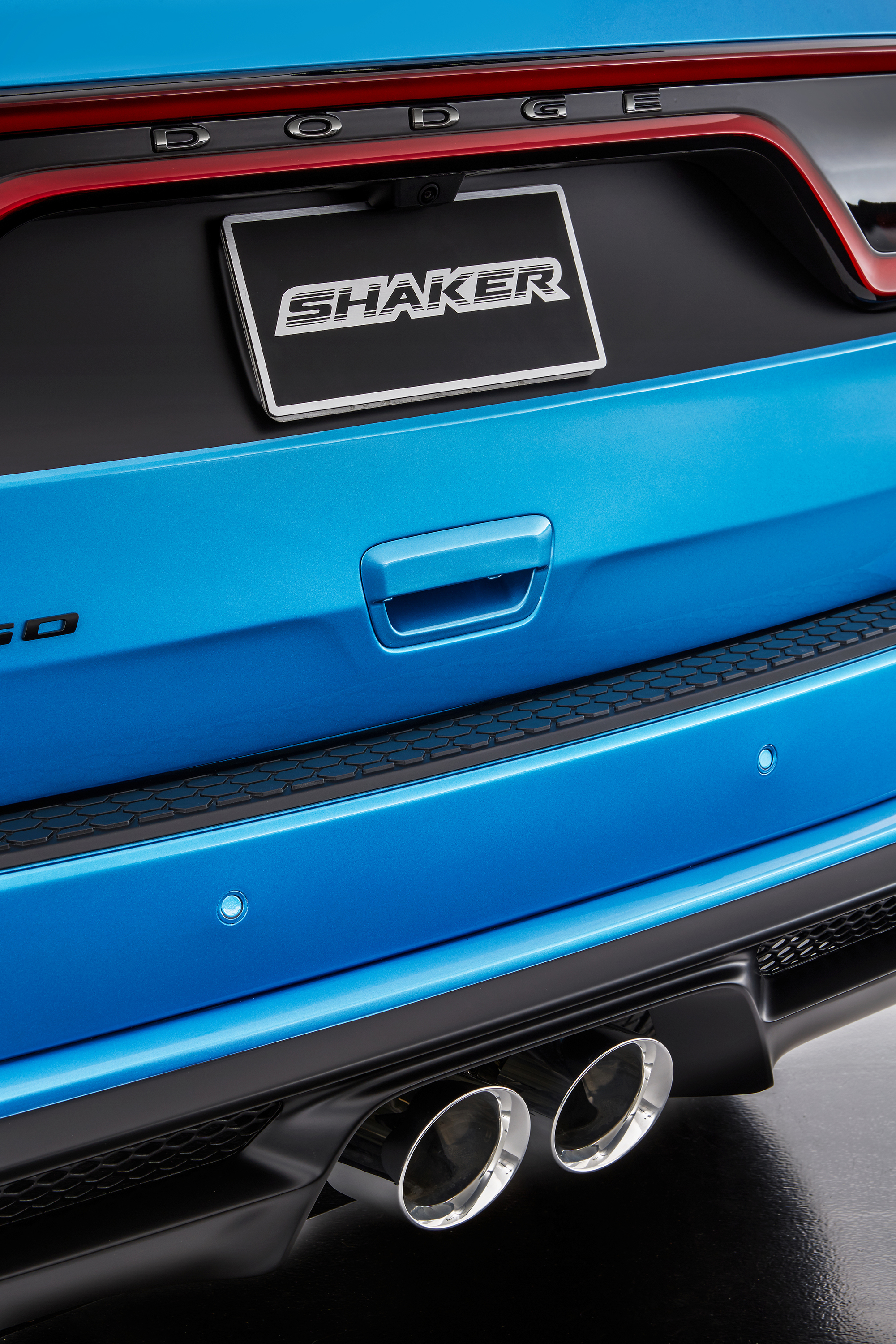 In the performance department, the custom Shaker hood fed a 485 horsepower 6.4-liter SRT HEMI V8 mated to an eight-speed automatic transmission, with further upgrade courtesy of a functional Mopar cold-air intake. In another Dodge Durango first, the rumble of the Shaker was delivered by customized chrome Mopar cat-back dual exhausts located in the center of the vehicle, replacing standard side exhausts. SRT six-piston big Brembo brakes and rotors, cooled by functional brake ducts in the front, reined in the B5 Blue-colored Dodge Durango Shaker Concept.