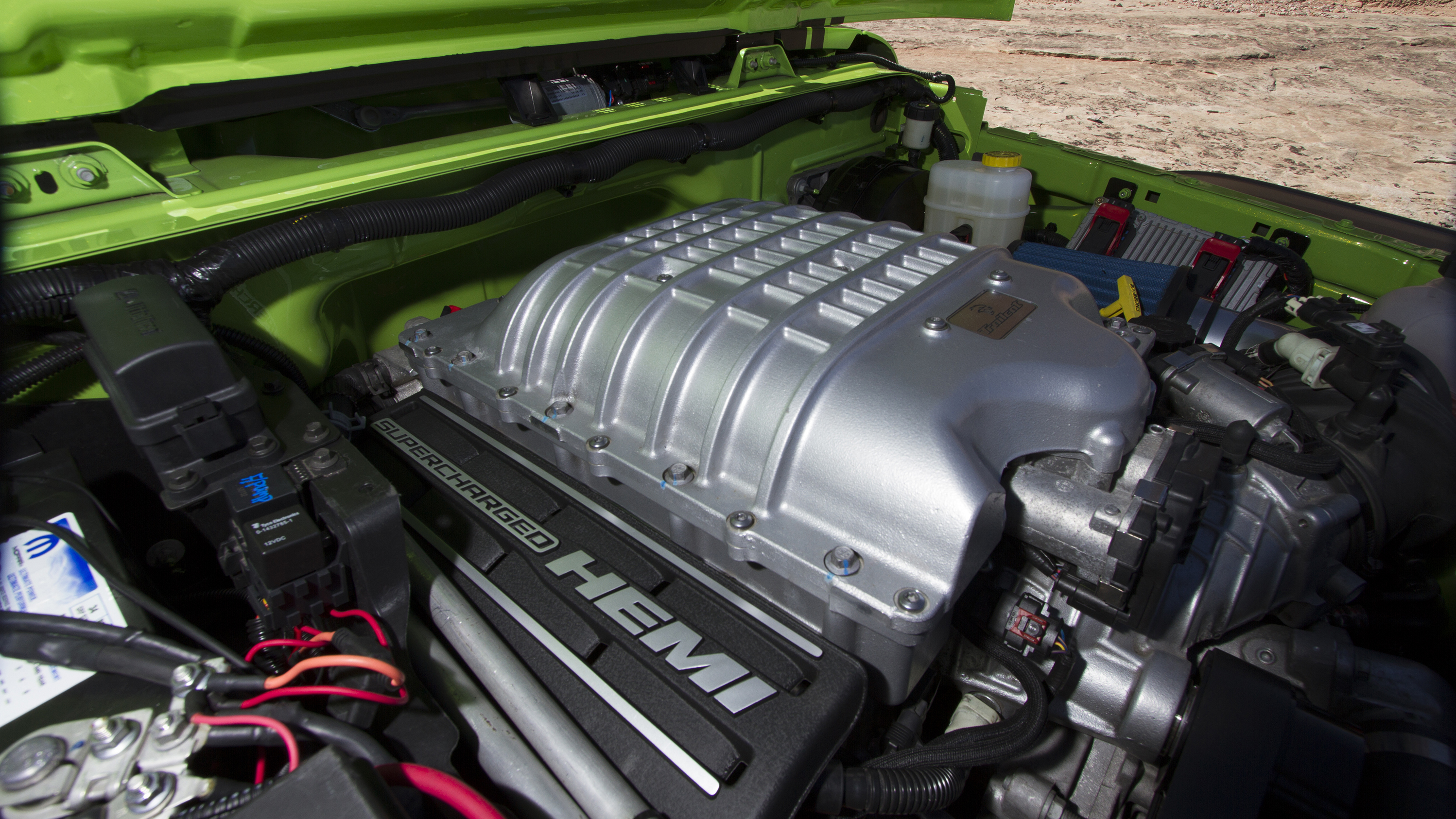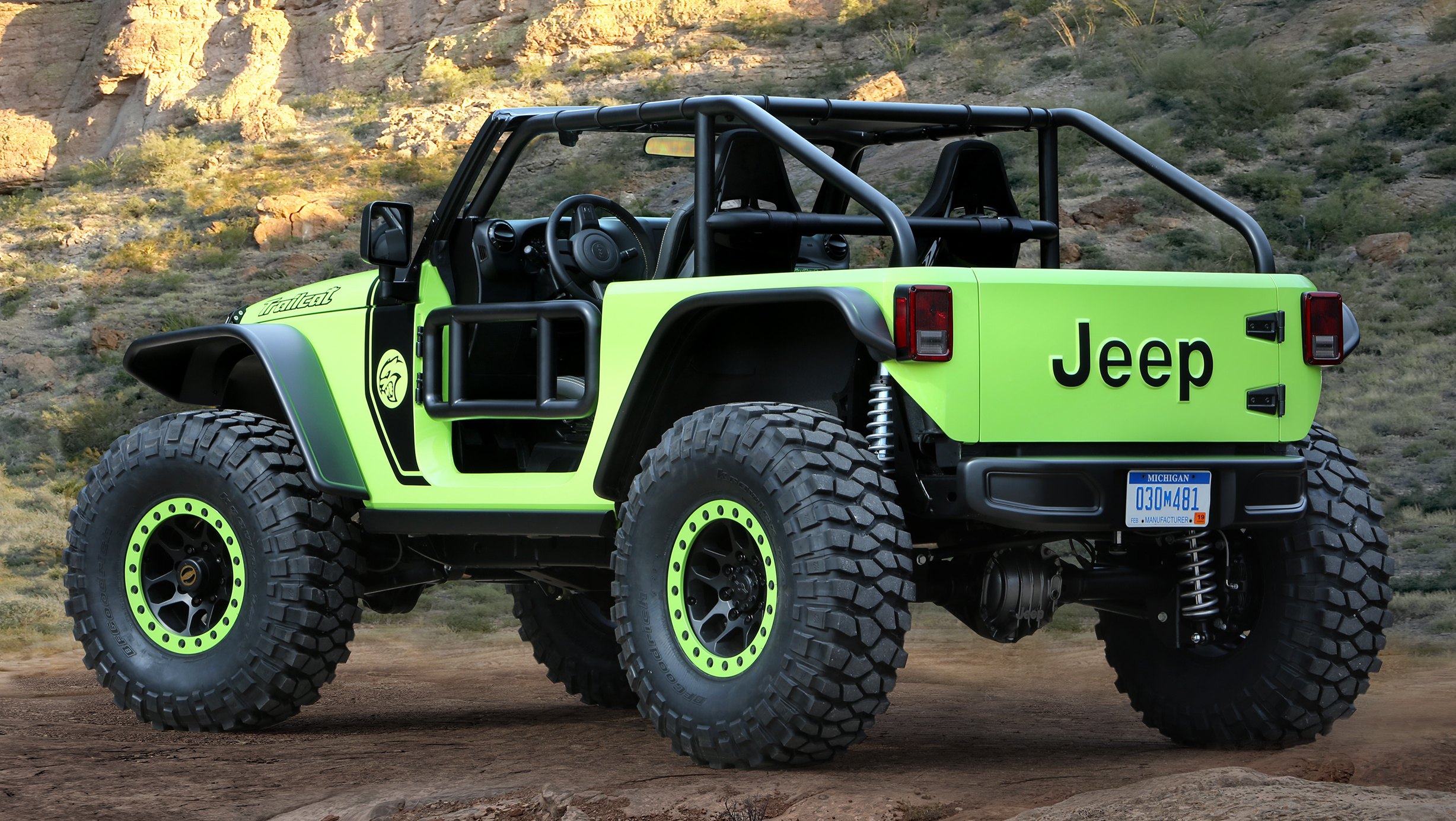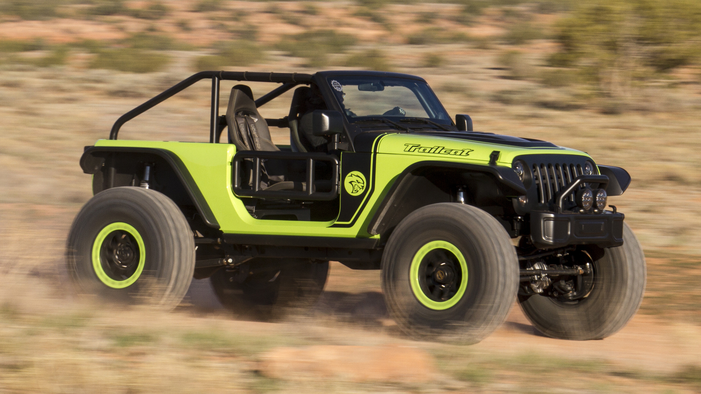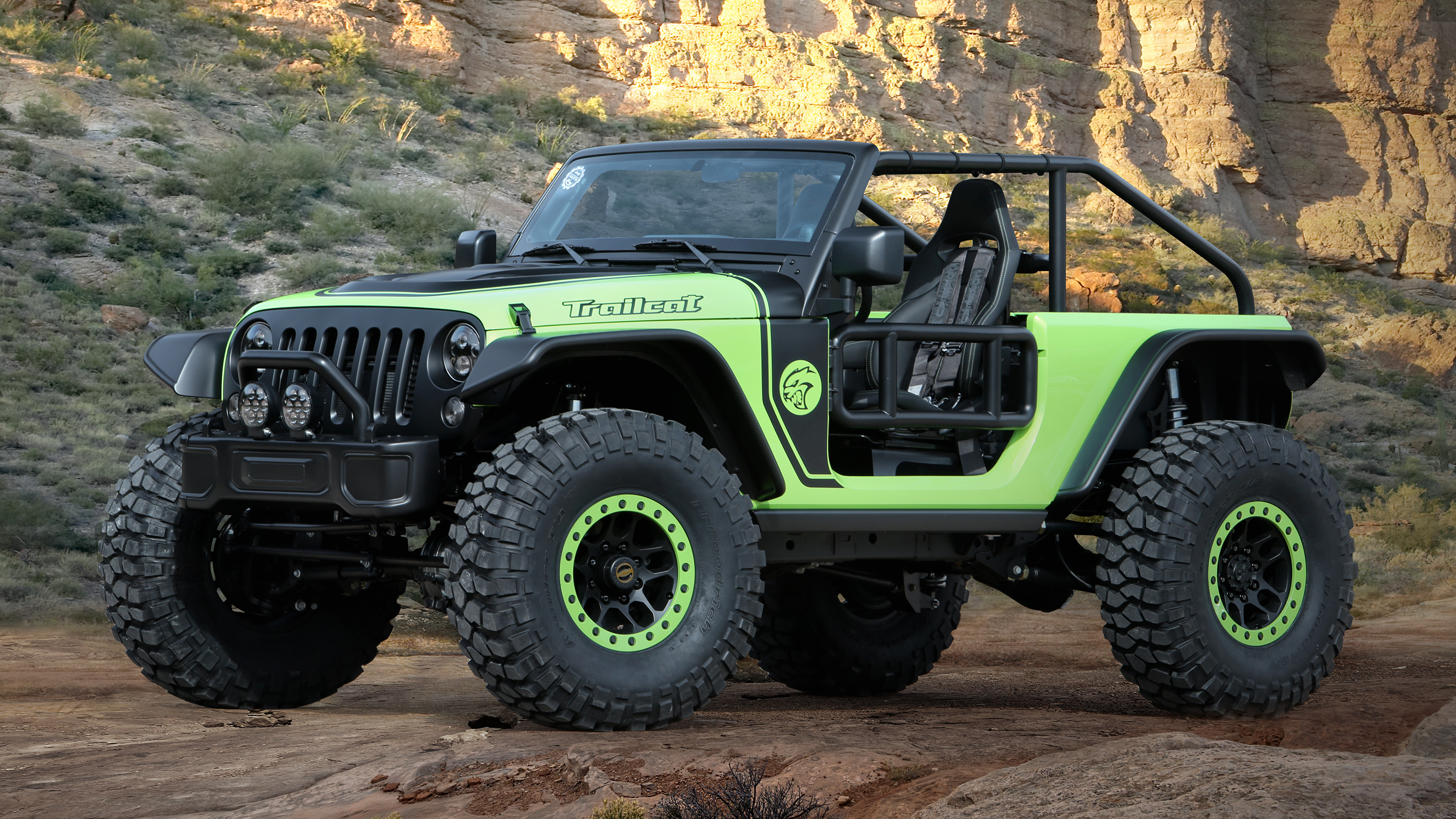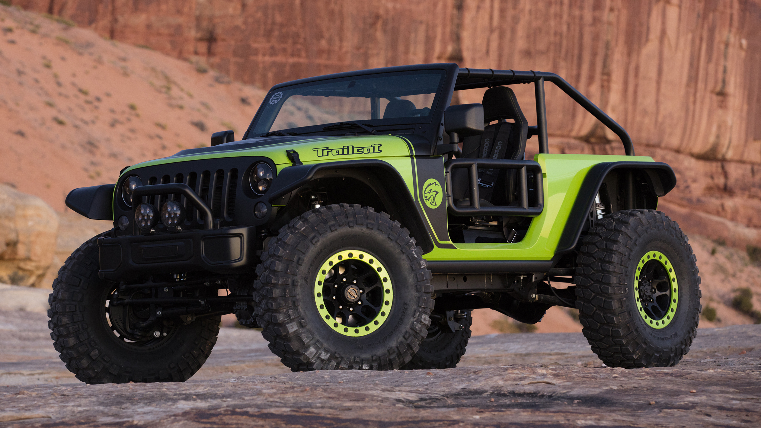 On the exterior of the Trailcat Concept, the team added a bunch of Mopar goodies to the vehicle. Items like a Satin Black grille, LED headlamps, LED fog lamps, custom bumpers, and heavy-duty rock rails. A Wrangler (JK) Rubicon hood was modified to add for more venting for the massive supercharged HEMI. The bright green paint goes well with the custom black decals featuring the “Trailcat” badge on the hood and the “Hellcat” logo on the front quarter panels.