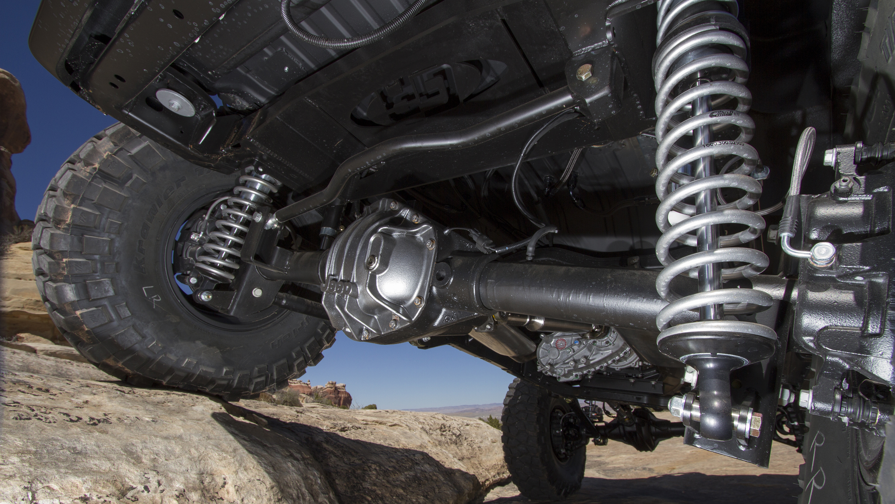 To give it a beefy stance, the Trailcat was given a 2-inch lift, as well as aluminum monotube 2.5-inch FOX Shocks from the Jeep Performance Parts bin. While to back up all that power, the Trailcat Concept was fitted with Dana 60 axles both front and back. To add to its off-road look a set of Jeep Performance Parts 17-inch Beadlock wheels (painted to match the Trailcat) and were wrapped with massive 39.5-inch BFGoodrich T/A KX tires.