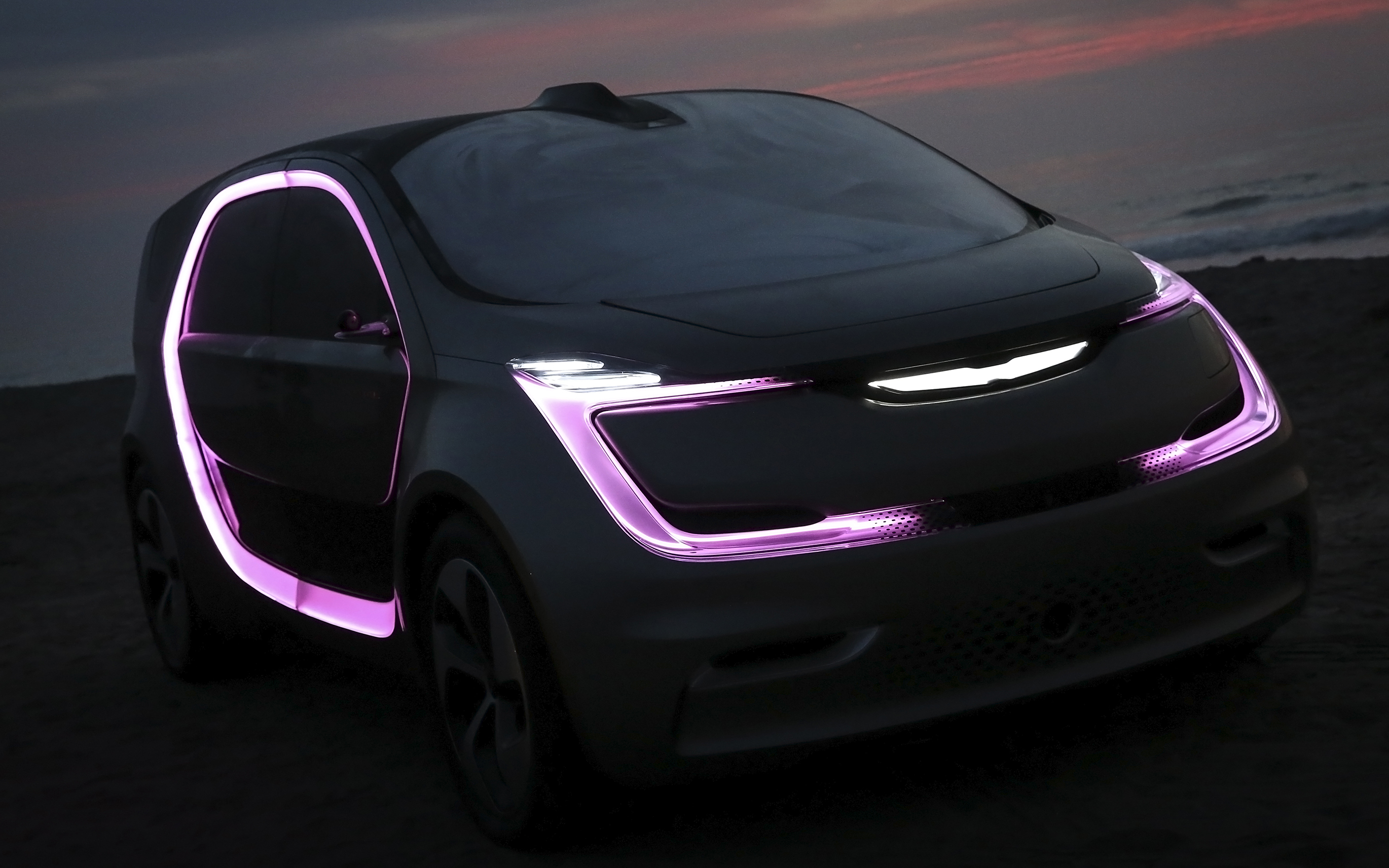 The lighting on the Chrysler Portal concept is an interactive experience, as well as a communication tool. The vehicle is equipped with full-color, changing LED lighting on the front, side portals and rear. Not only can the light take on different colors, it can have a swiping or animated appearance. Interactive ground projection and portal lighting are available in infinite colors that can be tailored for personal, business or drive settings, such as when the vehicle is parked, locked/unlocked or in autonomous mode.