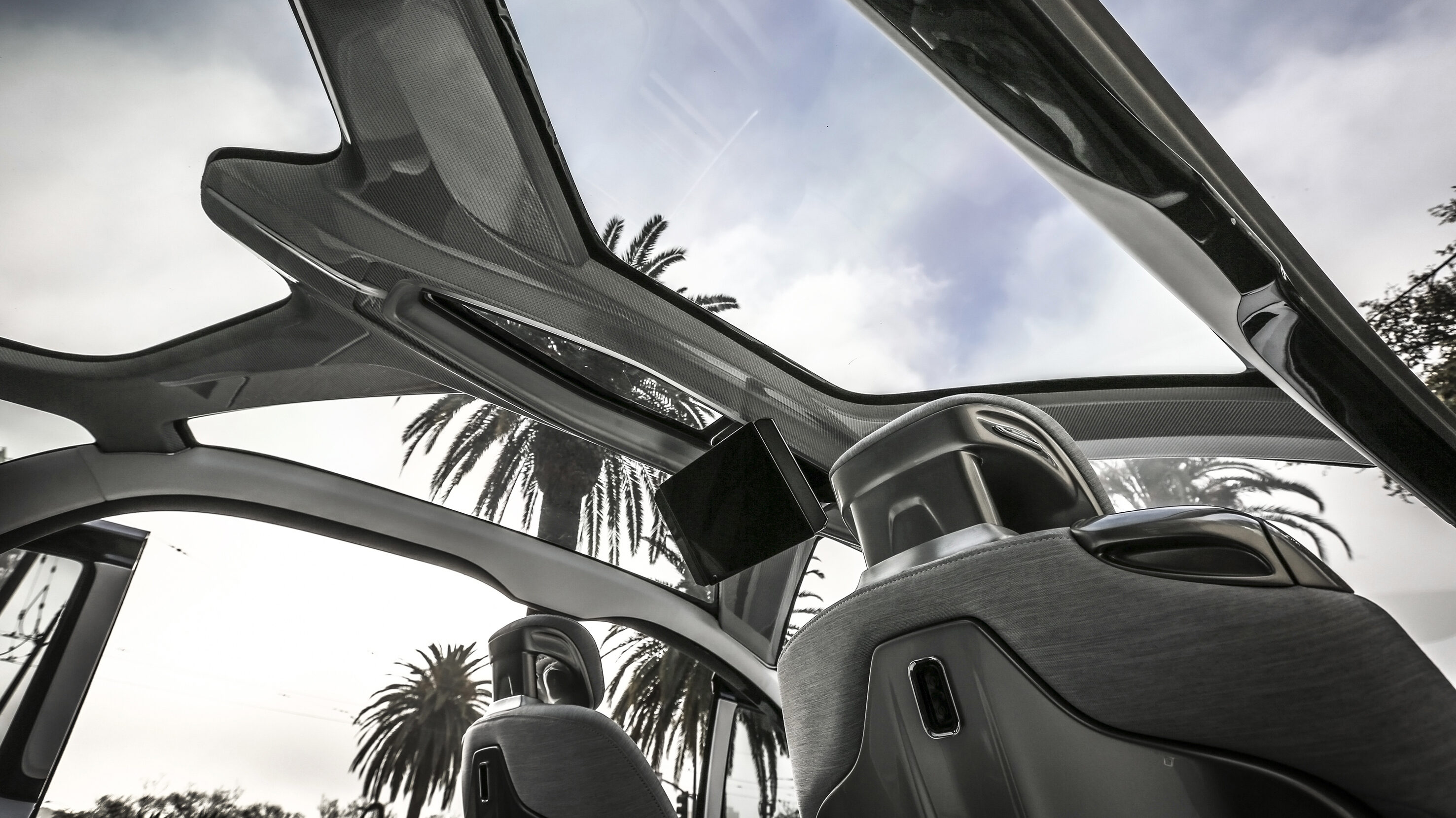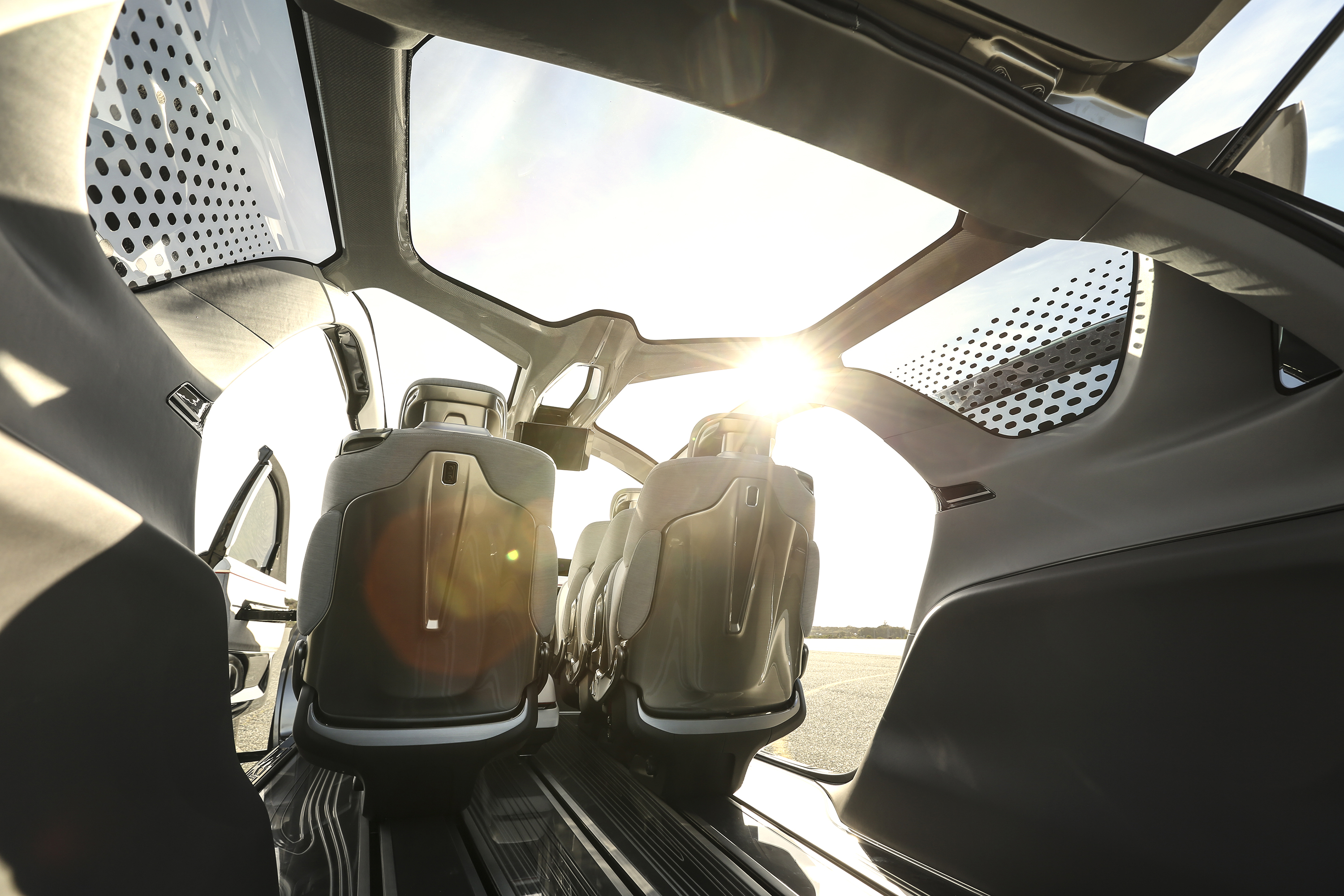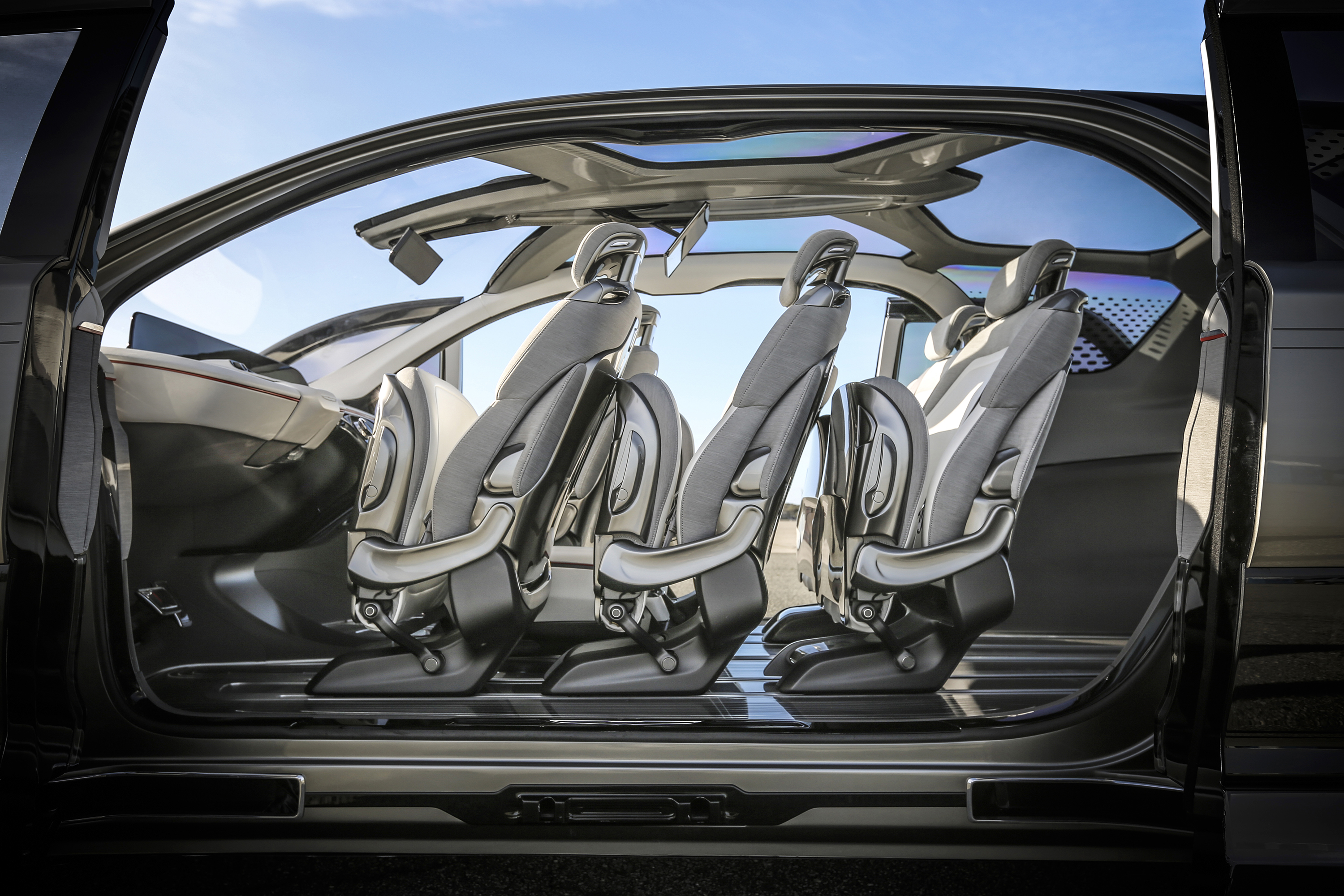 A full-length clear polycarbonate roof panel visually expands the vehicle’s interior space and admits natural light to all occupants.