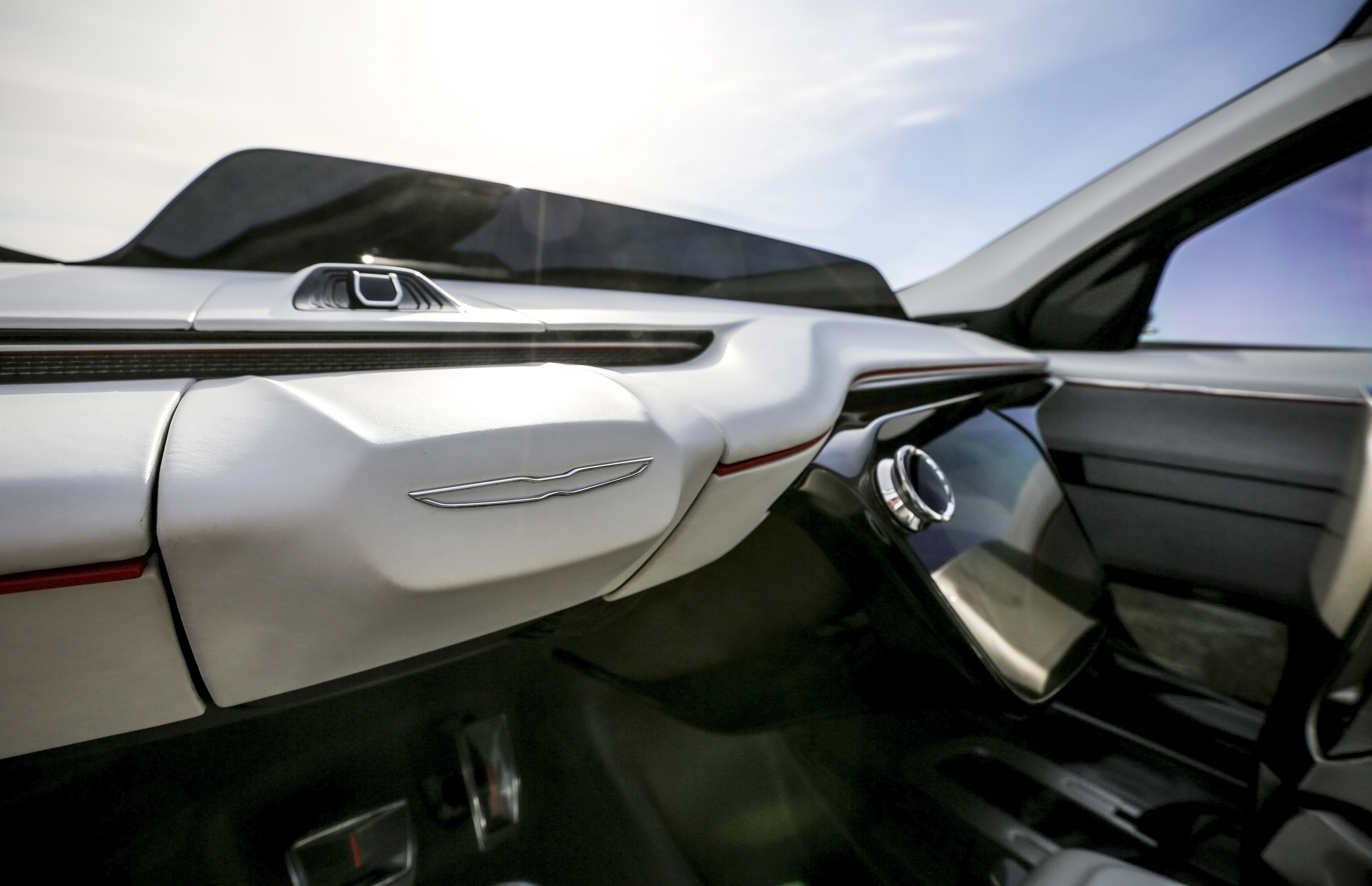 The integrated charging port, located at the front of the vehicle, uses the industry-accepted Combined Charging System (CCS) plug for energy and communication between the vehicle and charging equipment. DC Fast Charging at 350 kW enables the battery pack to be recharged for 150 miles of range in less than 20 minutes. The Chrysler winged badge on the front fascia serves as a charging indicator light.
