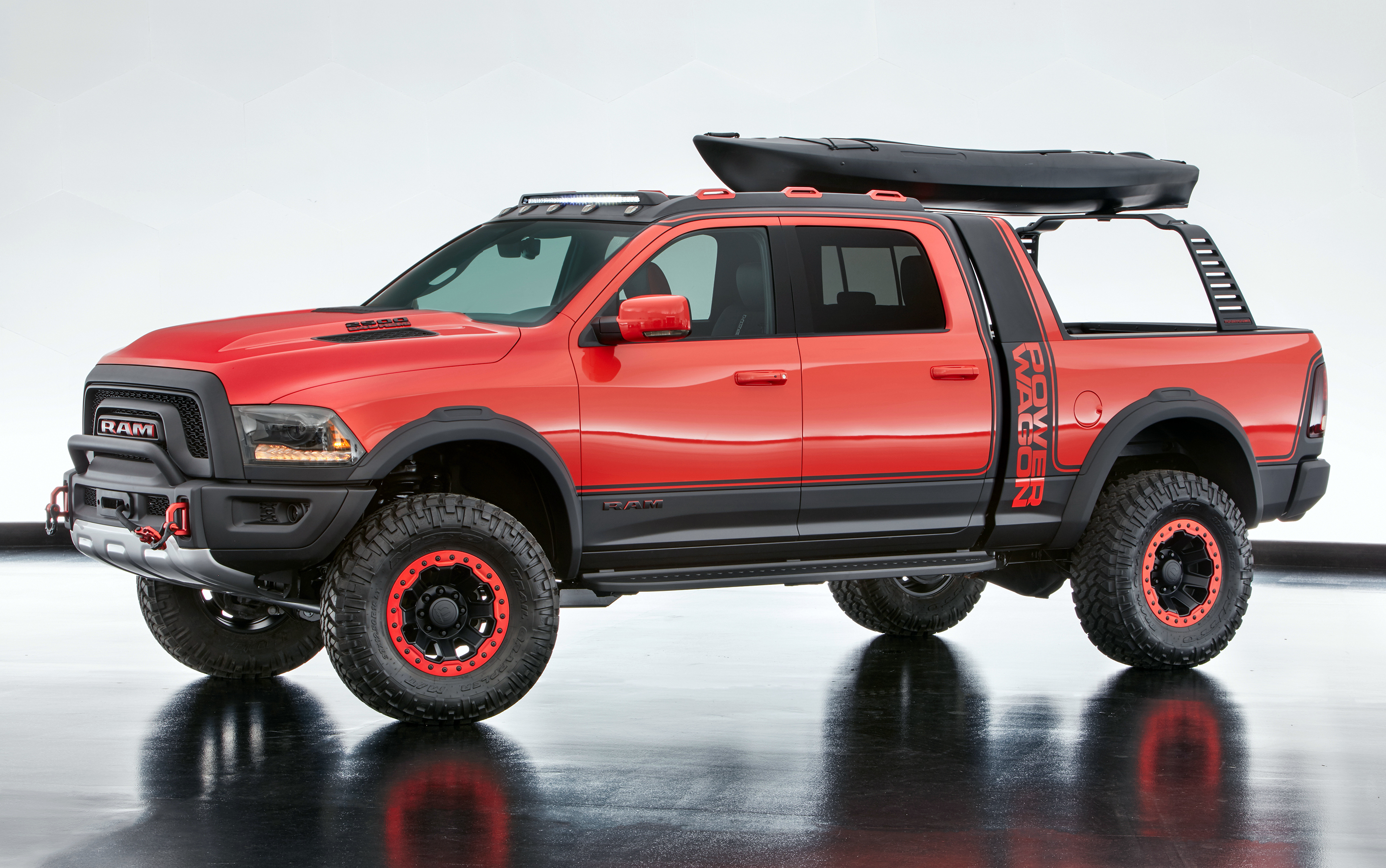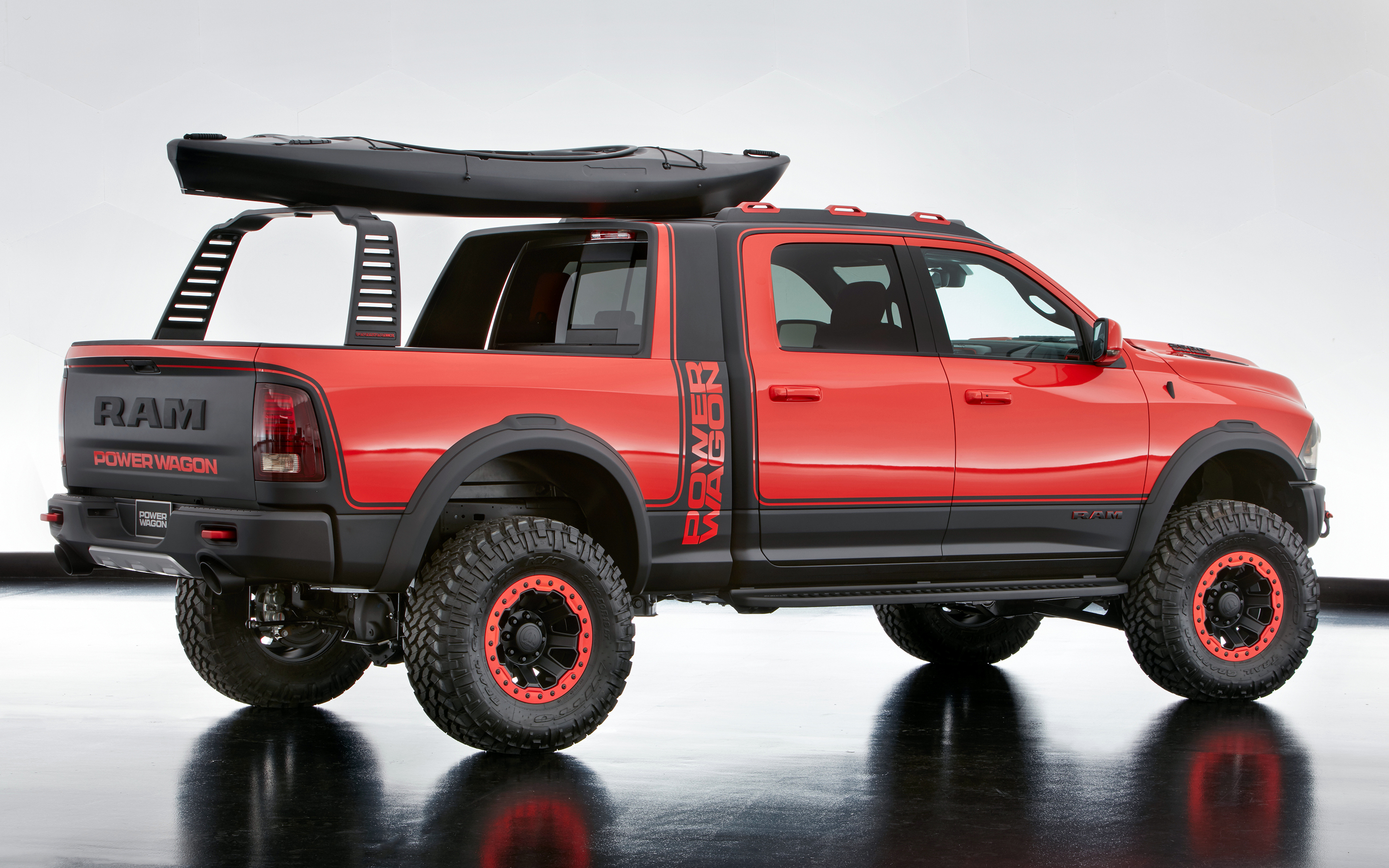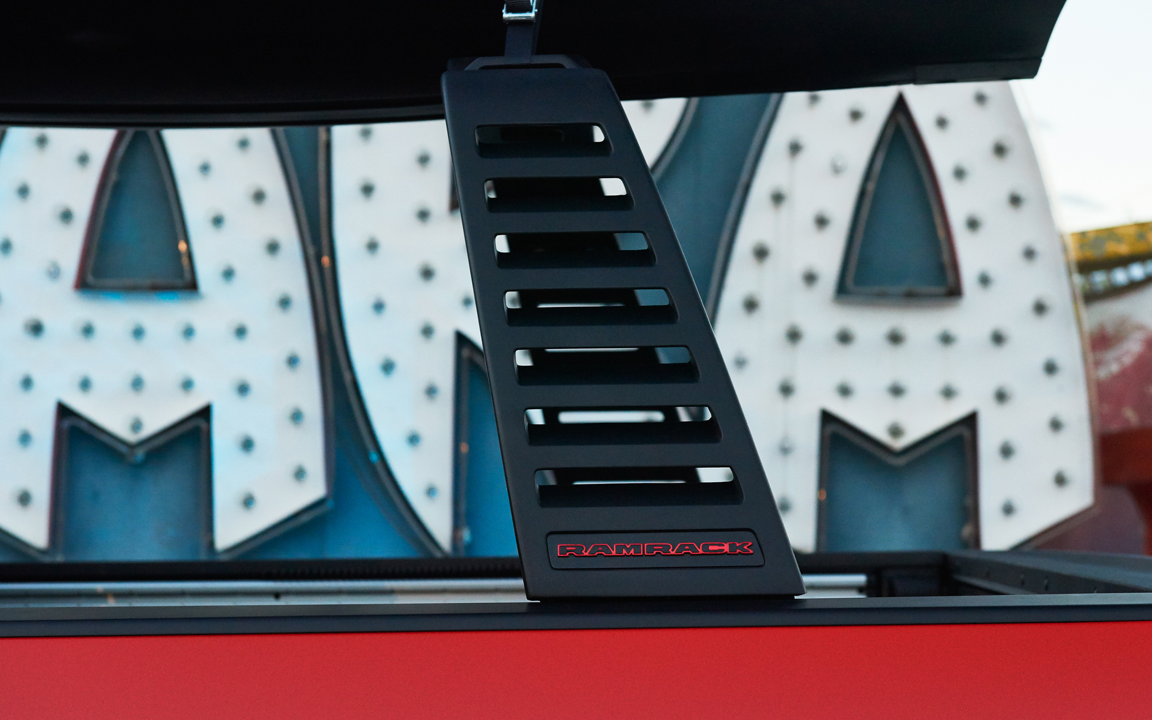That adaptability was showcased in the 6-foot, 4-inch bed of the Macho Power Wagon, where a Mopar concept Satin Black accessory sliding RamRack securely stored toys to fit a variety of lifestyles. The Ram Rack was designed to neatly slide up and stow under the cab’s sail panel when not in use. The bed rack worked in concert with a RamRack roof system that locked down items with six unique tie downs.
