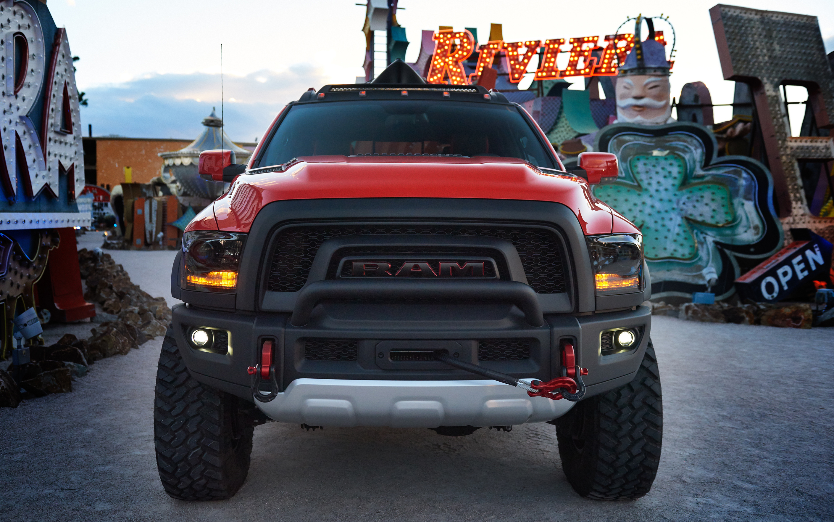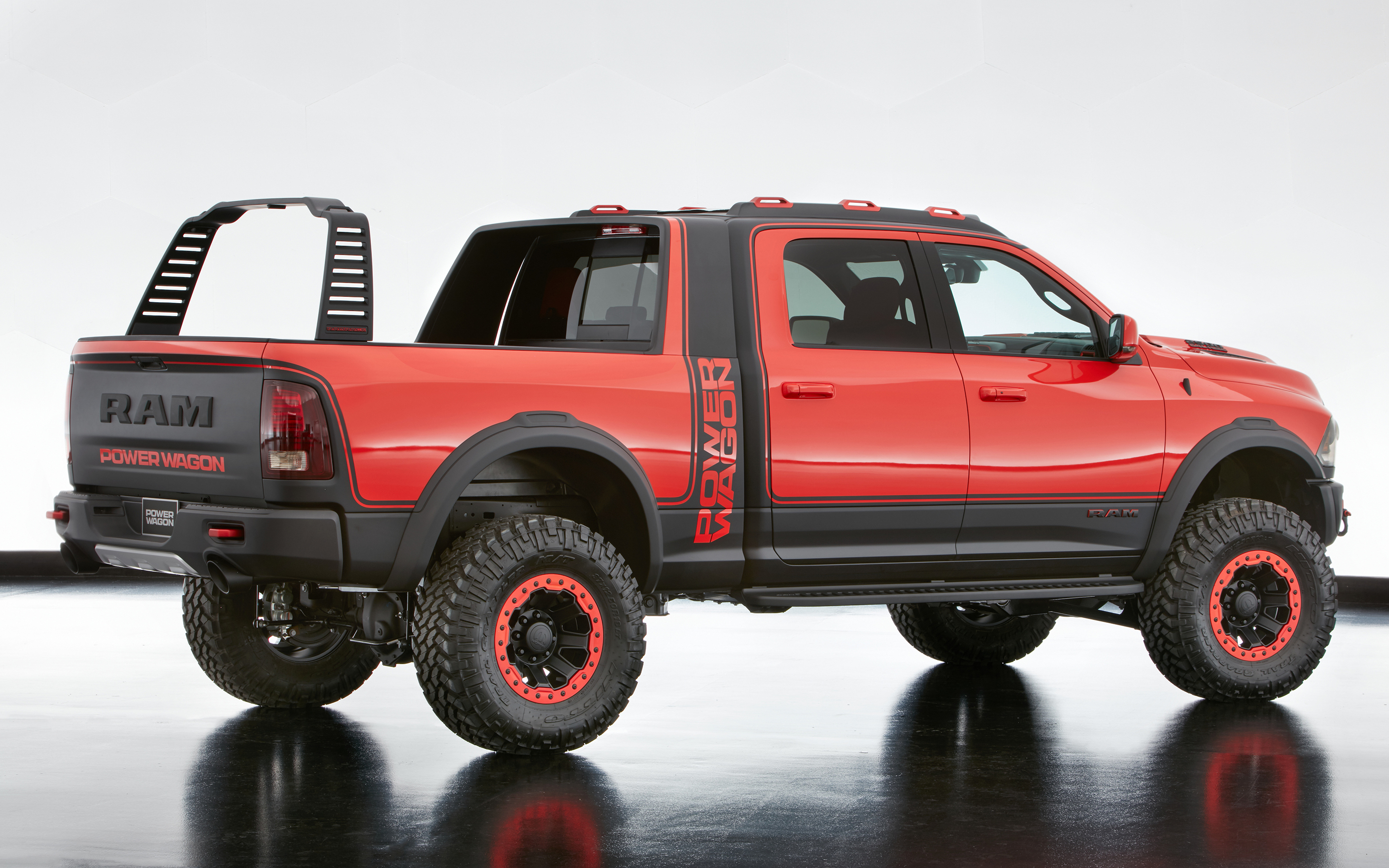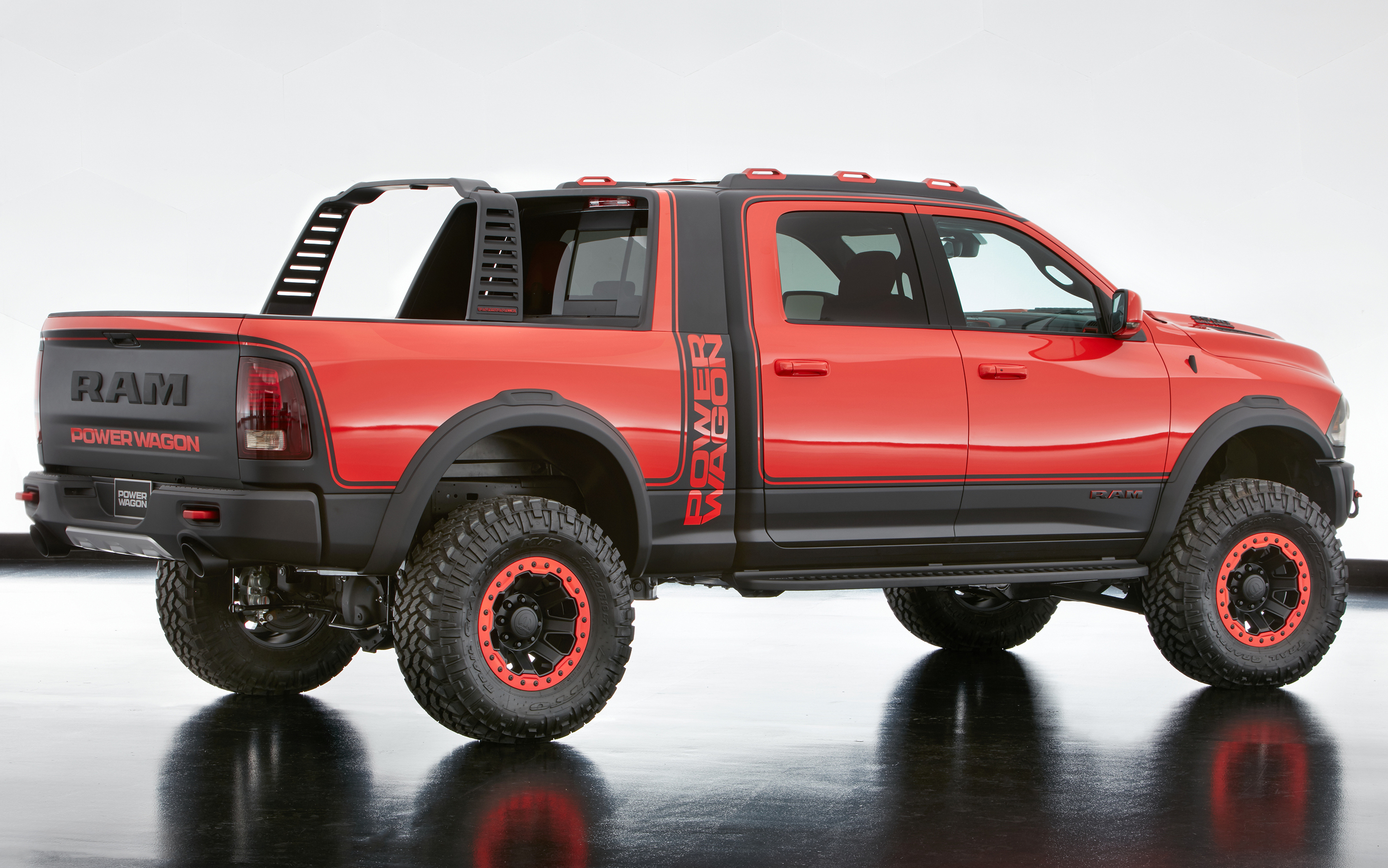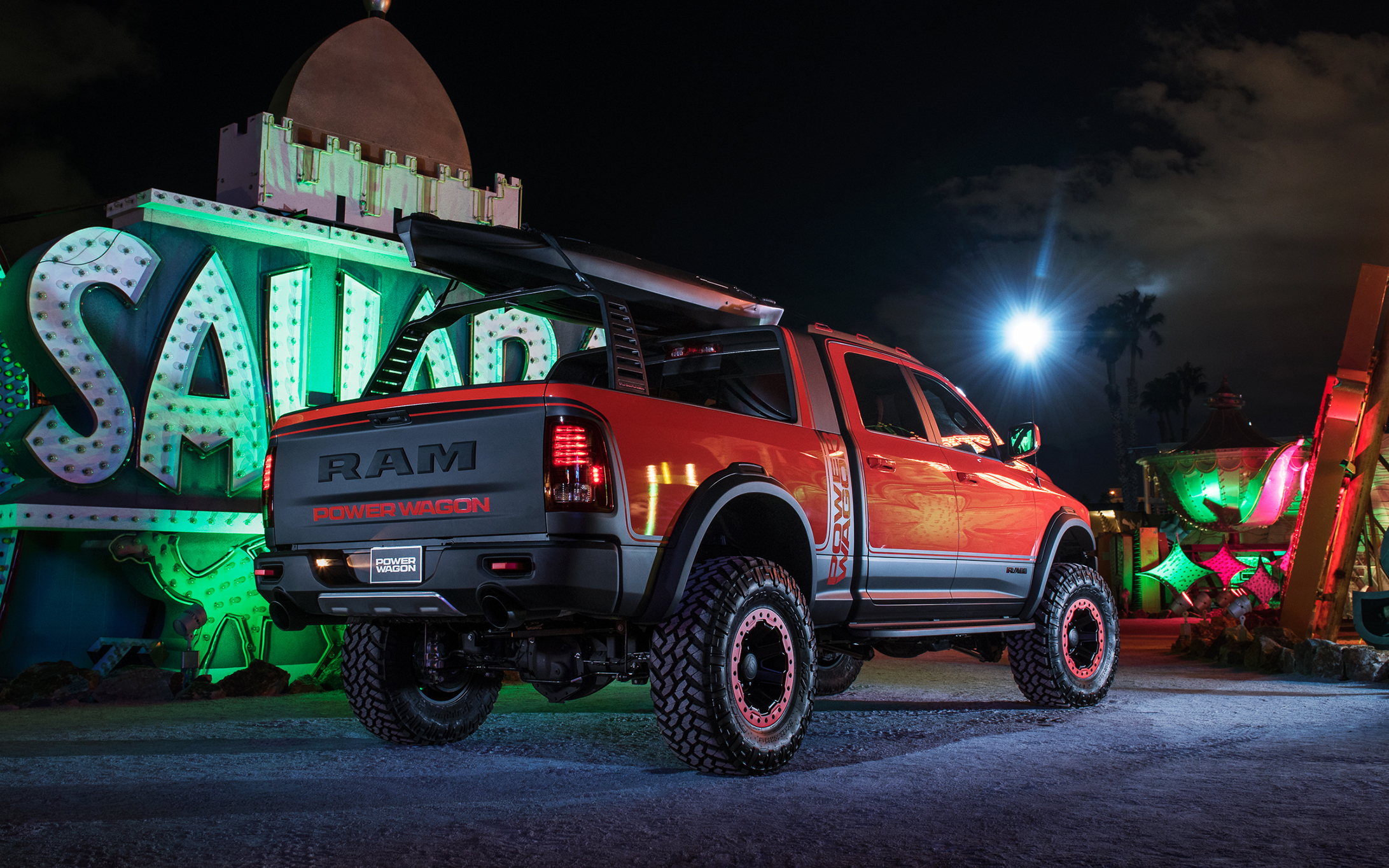 The Ram Macho Power Wagon was elevated by a four-inch custom lift kit and giant 37-inch x 12 1/2-inch Nitto Trail Grappler MT tires, set on concept 18-inch beadlock wheels. The vibrant Macho Mango body color, which also extended to the beadlock wheel rings, was accented with painted black graphics on the side and rear. The concept, aggressive hood was Satin Black, and a new front bumper was equipped for the trail with a winch, winch guard and tow hooks.