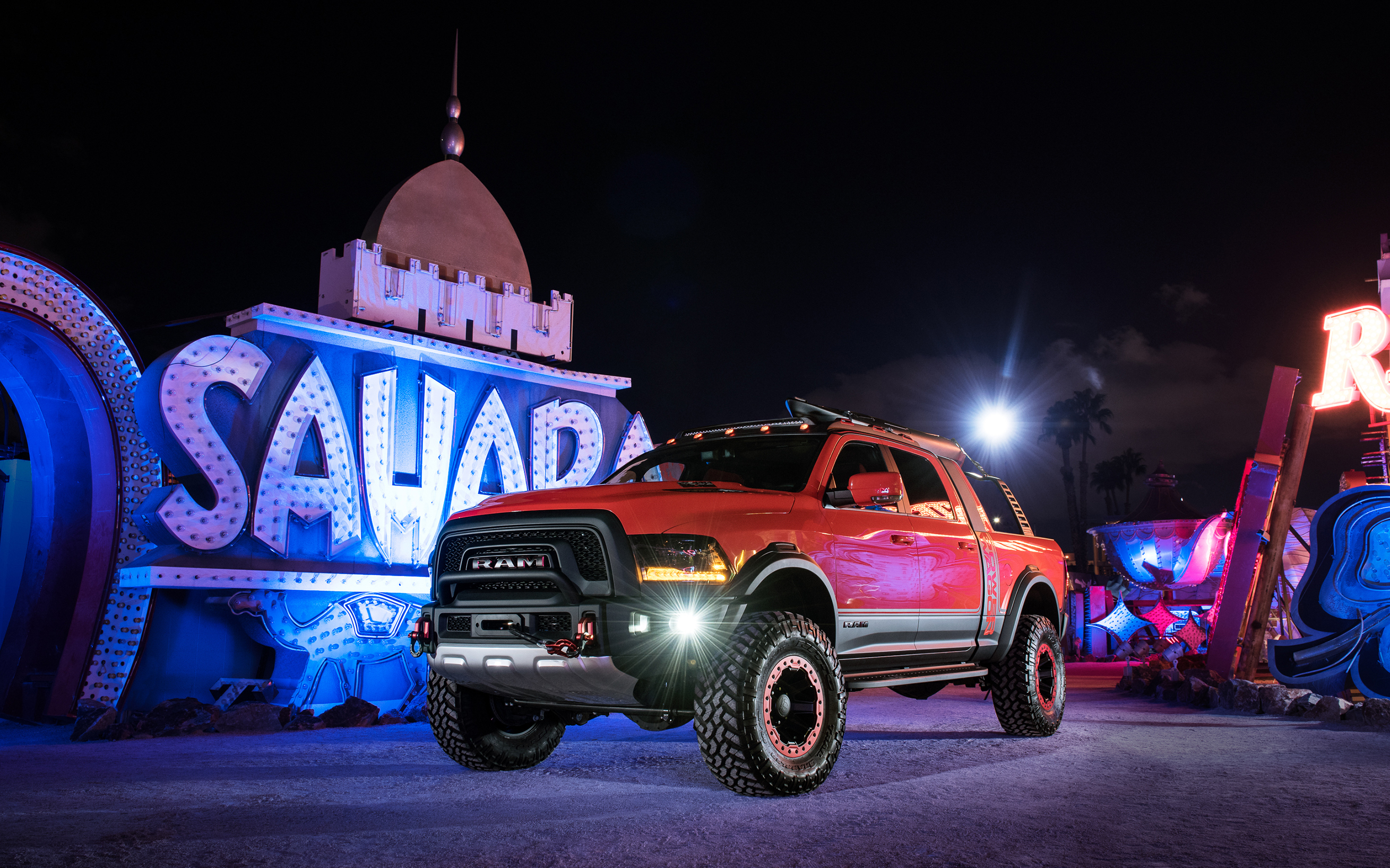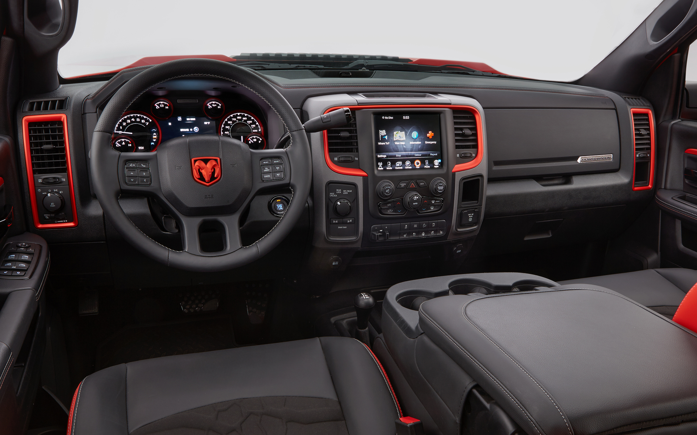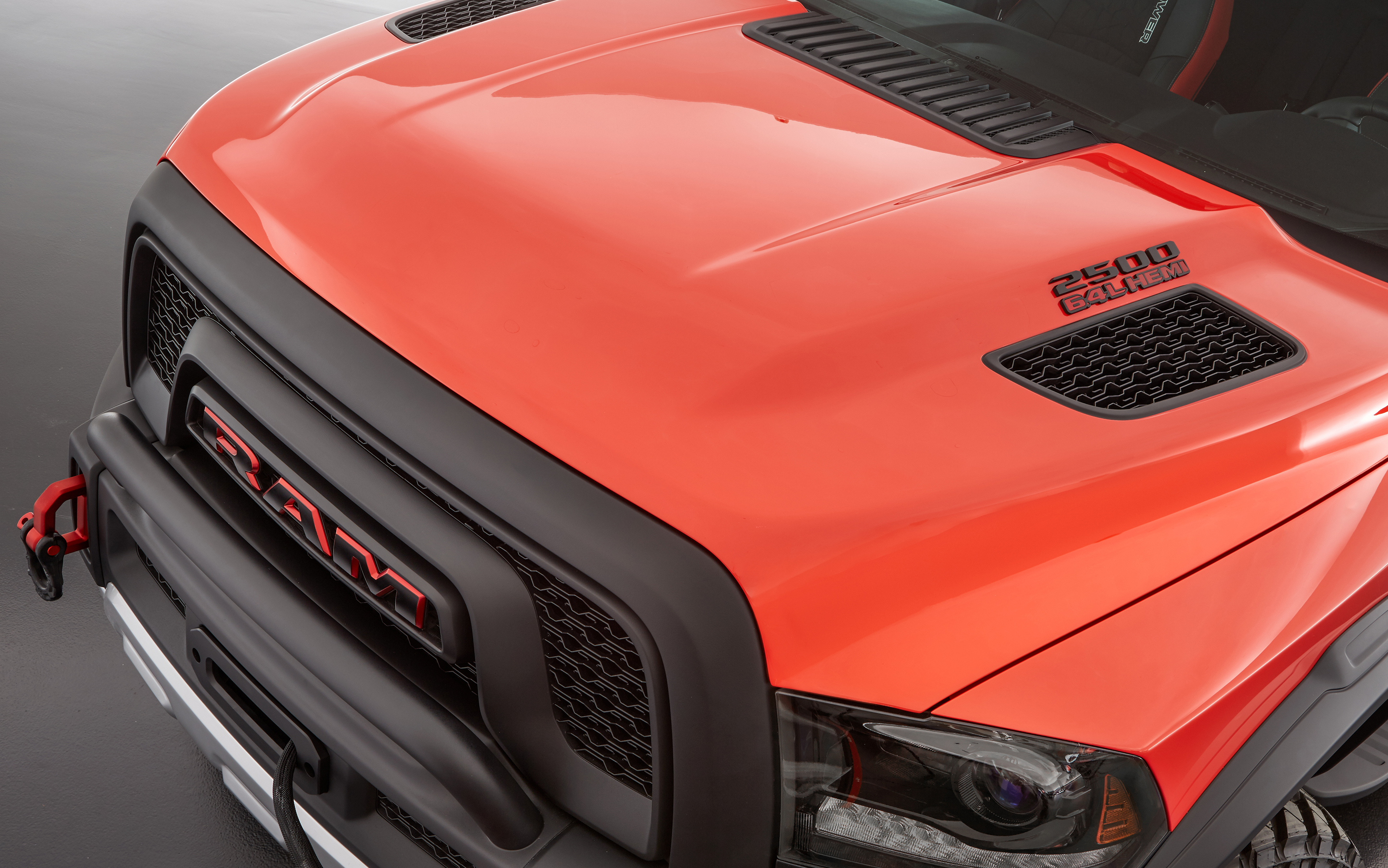 Further exterior customizations included one-piece Mopar concept off-road running boards, larger concept fender flares, low-gloss black door handles and a 21-inch heavy-duty light bar and LED clearance lights on the roof. Both front and rear bumpers integrated painted, bright silver skid plates and tow hooks. Black “RAM” lettering on the grille and body sides was outlined in Macho Mango.