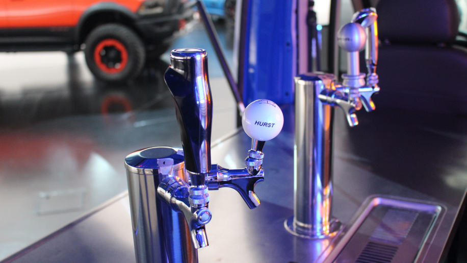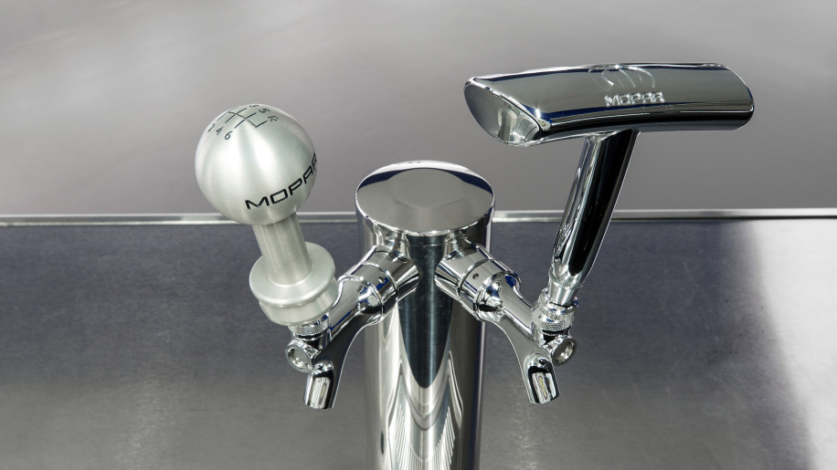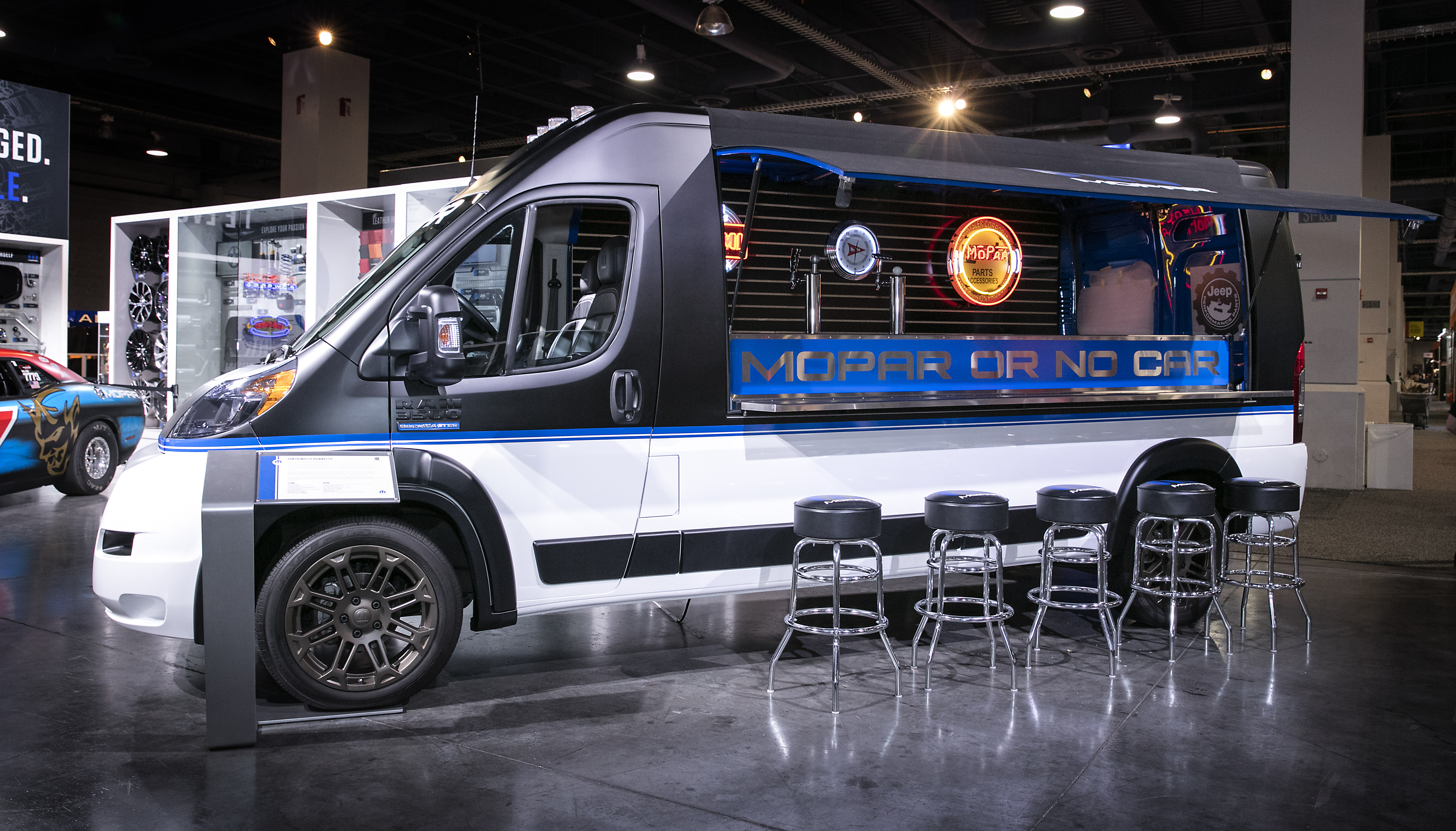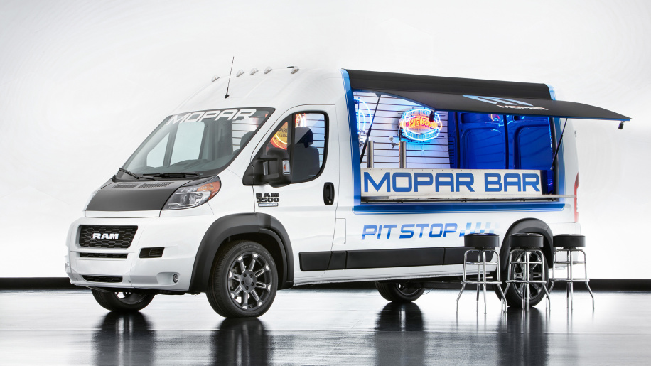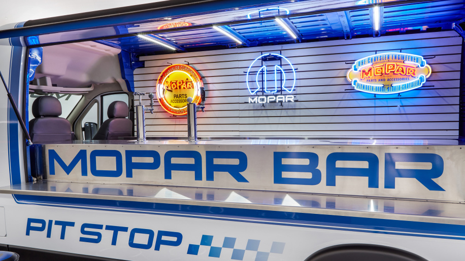 The Ram ProMaster Pit Stop Concept is Mopar-customized with a hinged door on the driver’s side, outfitted in Mopar graphics, that swings open towards the roof. A drop-down bar counter hinges and opens out from the side as well, and the best-in-class cargo width between the wheel wells of the ProMaster has been modified with keg refrigeration capacity to serve cold, thirst-quenching beverages from four on-board taps. Of course, ordinary taps wouldn’t suffice — Mopar T-handle, billet aluminum, cue ball and pistol grip shifters help dish out drinks. An added “Brewmaster” badge is appropriate, as Mopar stools stored in the cargo area can be placed out front to quickly create a soda shop (or pub) on wheels.