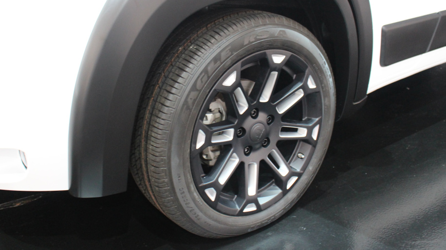 The front-wheel-drive Pit Stop rides on Mopar concept 20-inch Satin Black lightweight wheels highlighted by machined accents, with aggressive, blistered-out wheel flares on guard. The fascia is simplified and the grille, featuring a unique open texture, is modified with concept “RAM” lettering (which would later make it into production on the 2019 Ram ProMaster models). The passenger-side sliding door carries the Mopar colors, with Mopar logos on the windshield as well as the bodyside, along with checkered-flag “Pit Stop” graphics. The front and rear fascia have been modified from standard black to match the white body color.