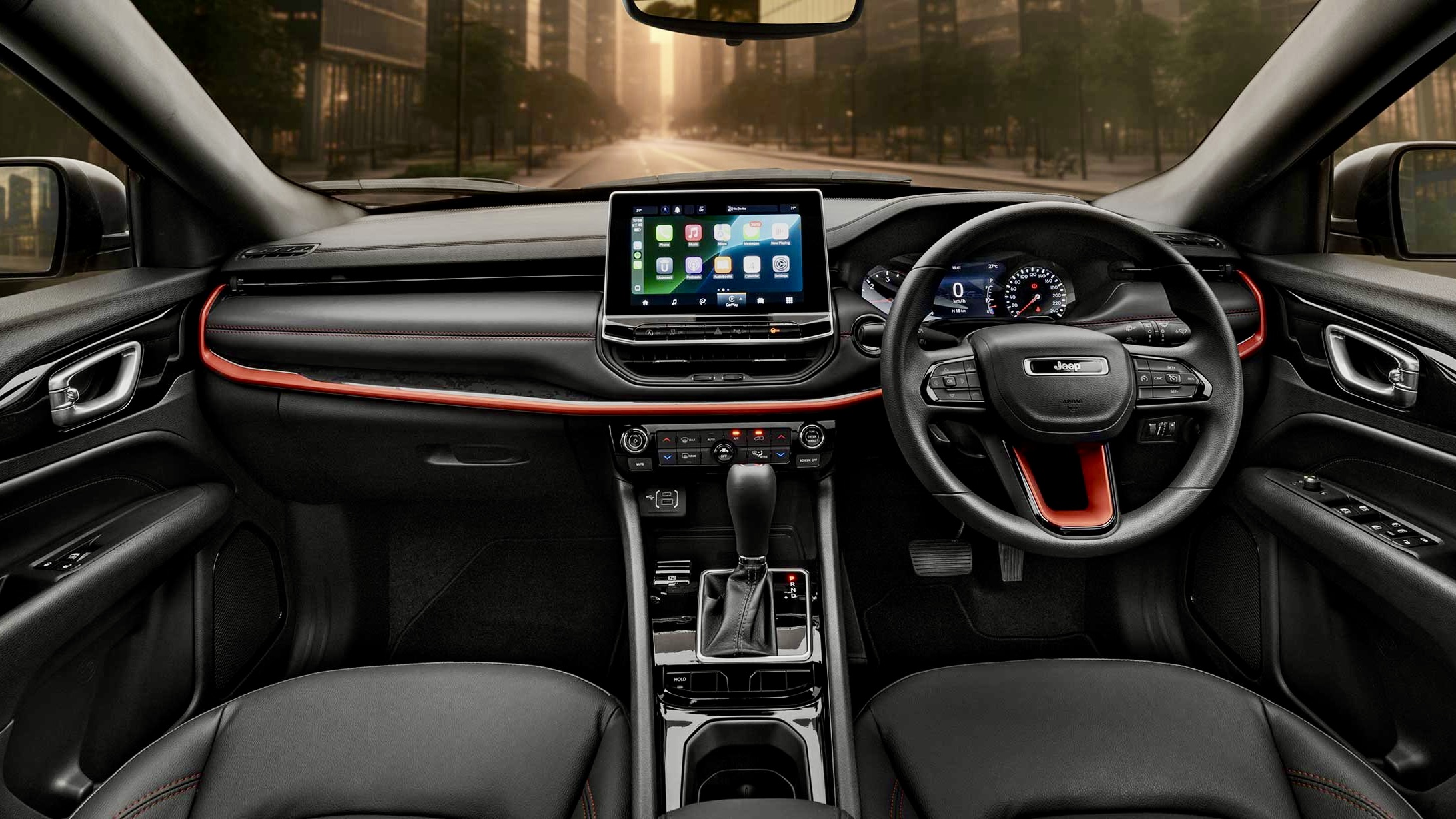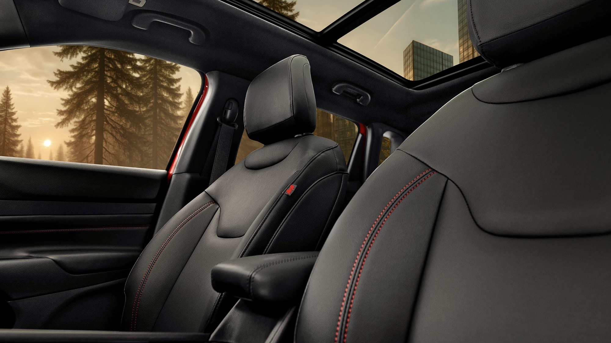 Inside, Jeep carried the red-and-black theme into the cabin. The seats feature synthetic leather upholstery with red and black stitching, while the leather-wrapped steering wheel also gets red contrast stitching. The instrument panel incorporates matching accents, tying the whole design together in a way that feels sporty but still refined.
