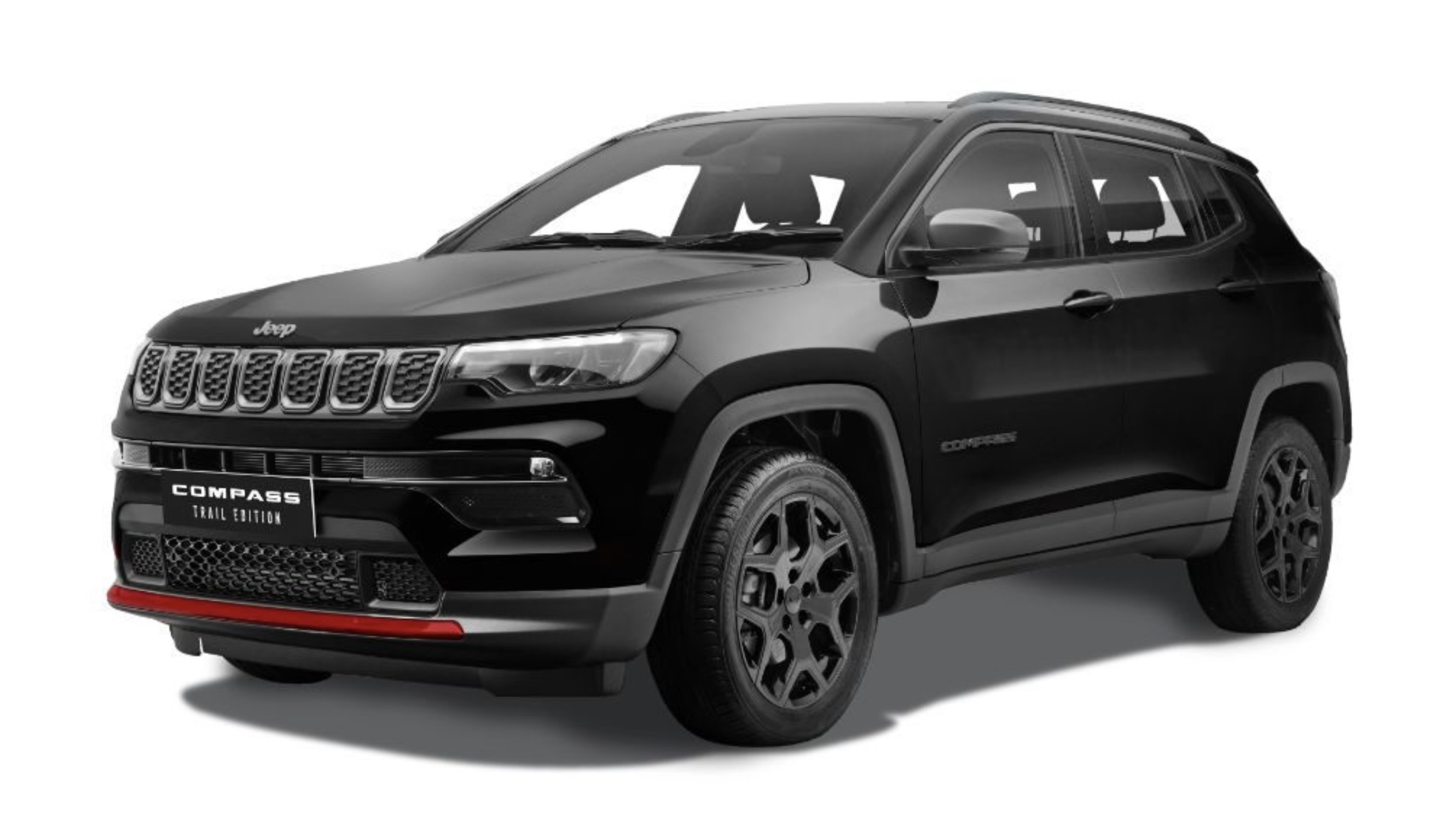 What sets the Compass Trail Edition apart is its Black and Gray exterior theme accented with Bright Red details. The most noticeable touch is the red accent on the lower front fascia, which immediately draws the eye and gives the front end a more aggressive stance. Jeep swaps out traditional chrome trim for neutral gray and gloss black finishes, creating a more modern, stealthy look.