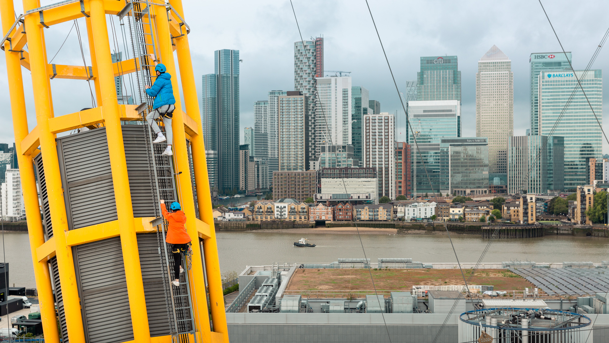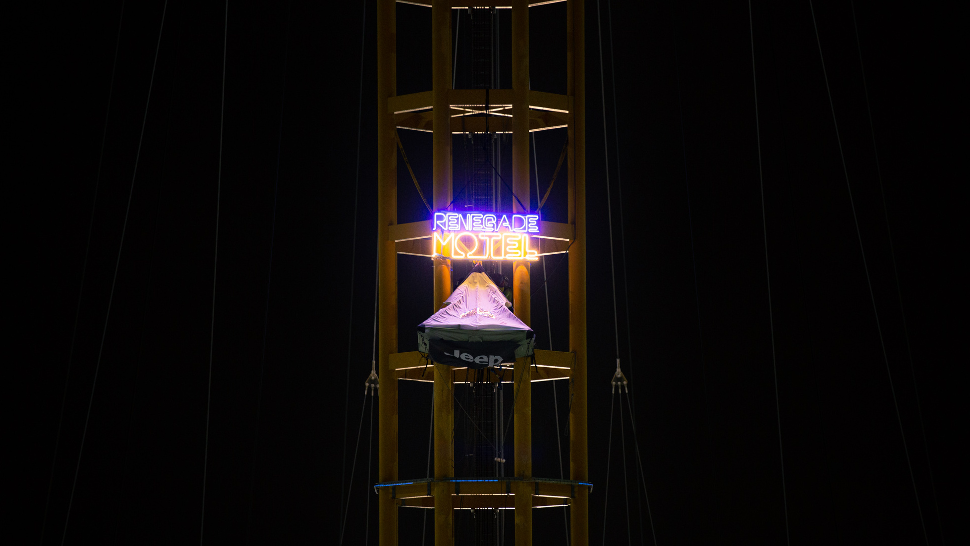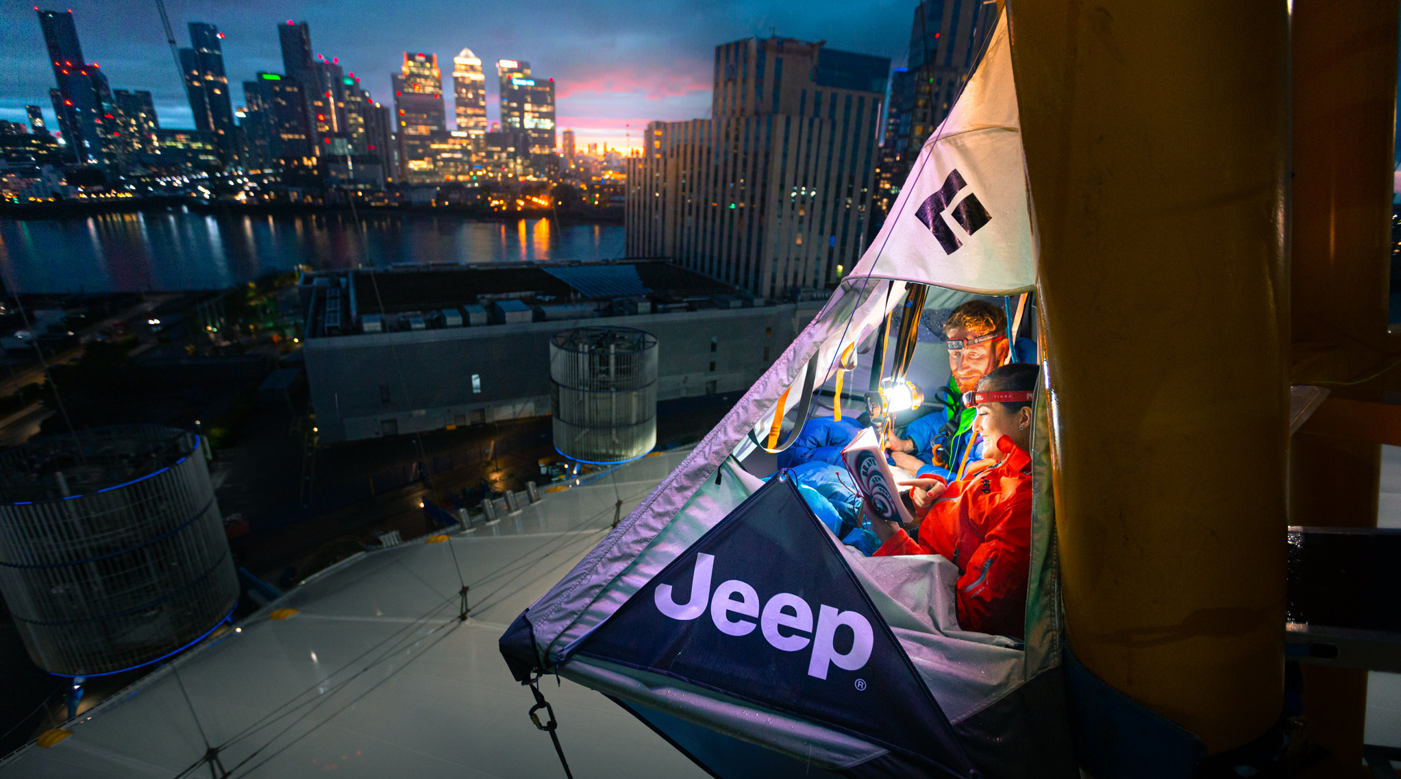 The Renegade Hotel balanced adventure and urban living, with the world’s first urban cliff camping motel to help kick-off the new 2020 Jeep Renegade 4xe plug-in hybrid in England. The end of summer once-in-a-lifetime experience was not for the faint-hearted or those who were afraid of heights. The motel used an innovative hanging tent system known as a “portaledge” and was fixed 70 meters (or about 230 feet) above the ground to one of one the yellow pylons on The O2.