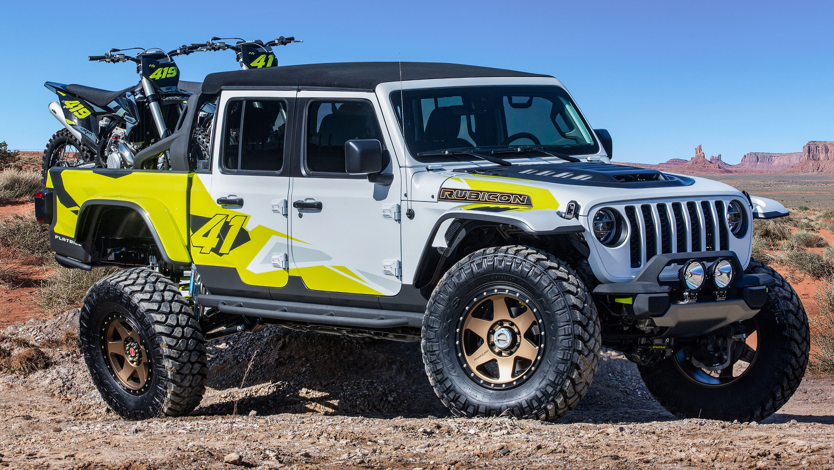 Powered by the 3.6-liter Pentastar V6 and 8-speed automatic, this Gladiator-based concept also gets a JPP cold-air intake system. A set of Dynatrac Pro-Rock 60 are equipped with an Off-Road Evolution 4-inch lift kit and pair of larger rear bypass shocks are fitted underneath. A set of 20-inch bronze 6-spoke bead-lock wheels wearing a set of 40-inch tires give the Flatbill an aggressive stance. A custom sports bar, custom front fenders, shortened front bumpers, rock rails, and carbon fiber hood vents along with the bright yellow graphics carrying the “41” paying homage to the originally Willy MB Jeep’s birth date.