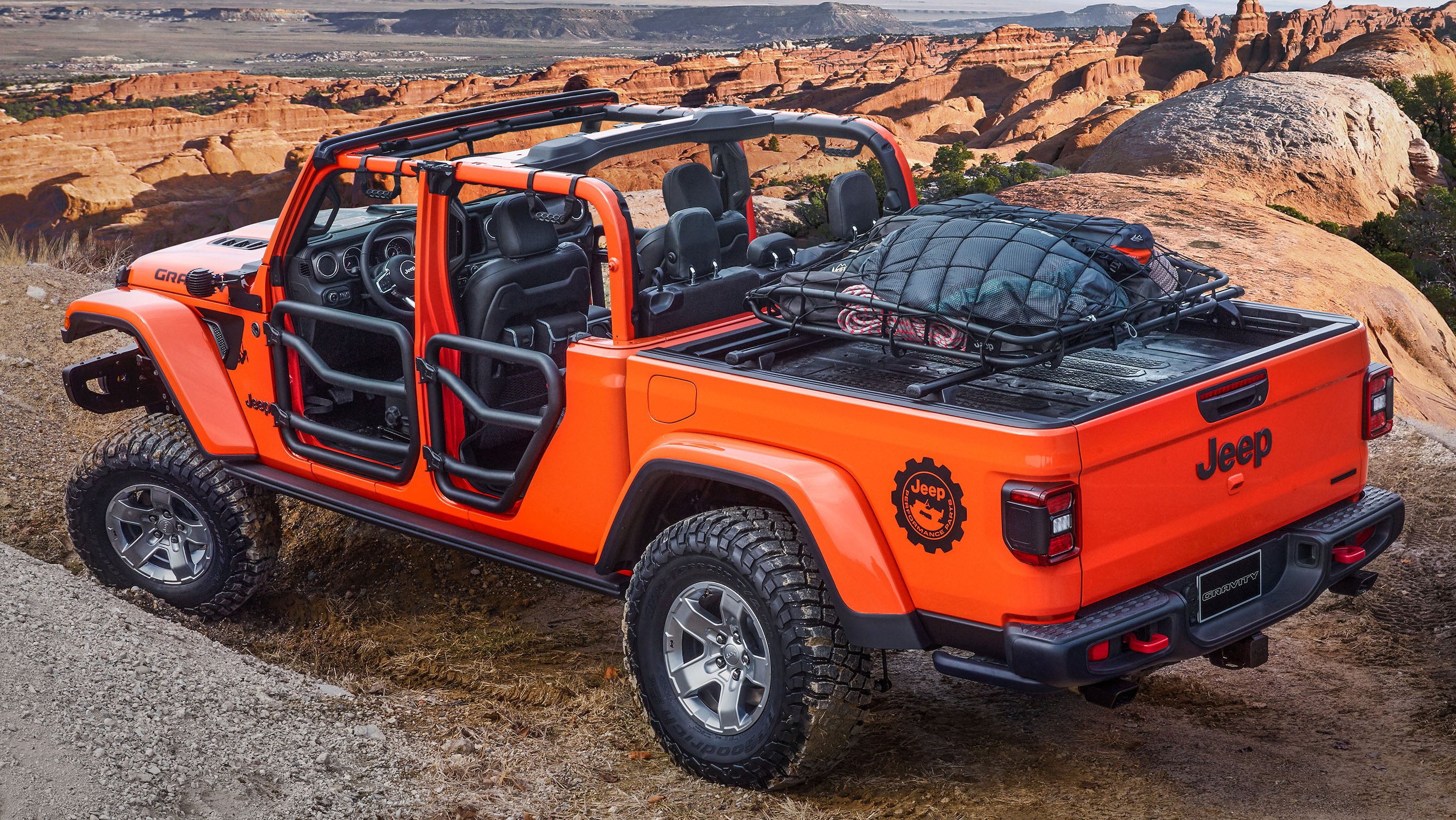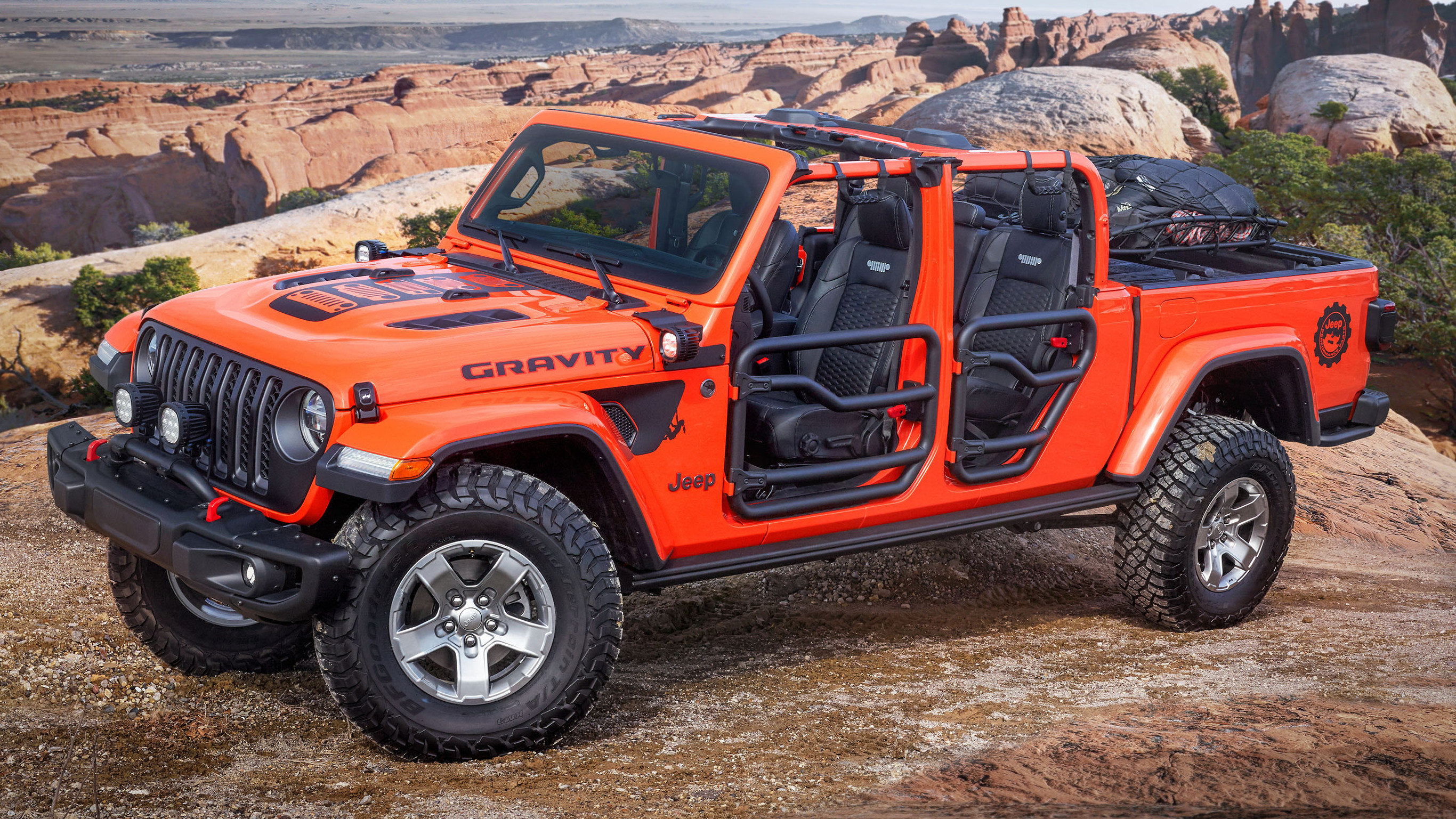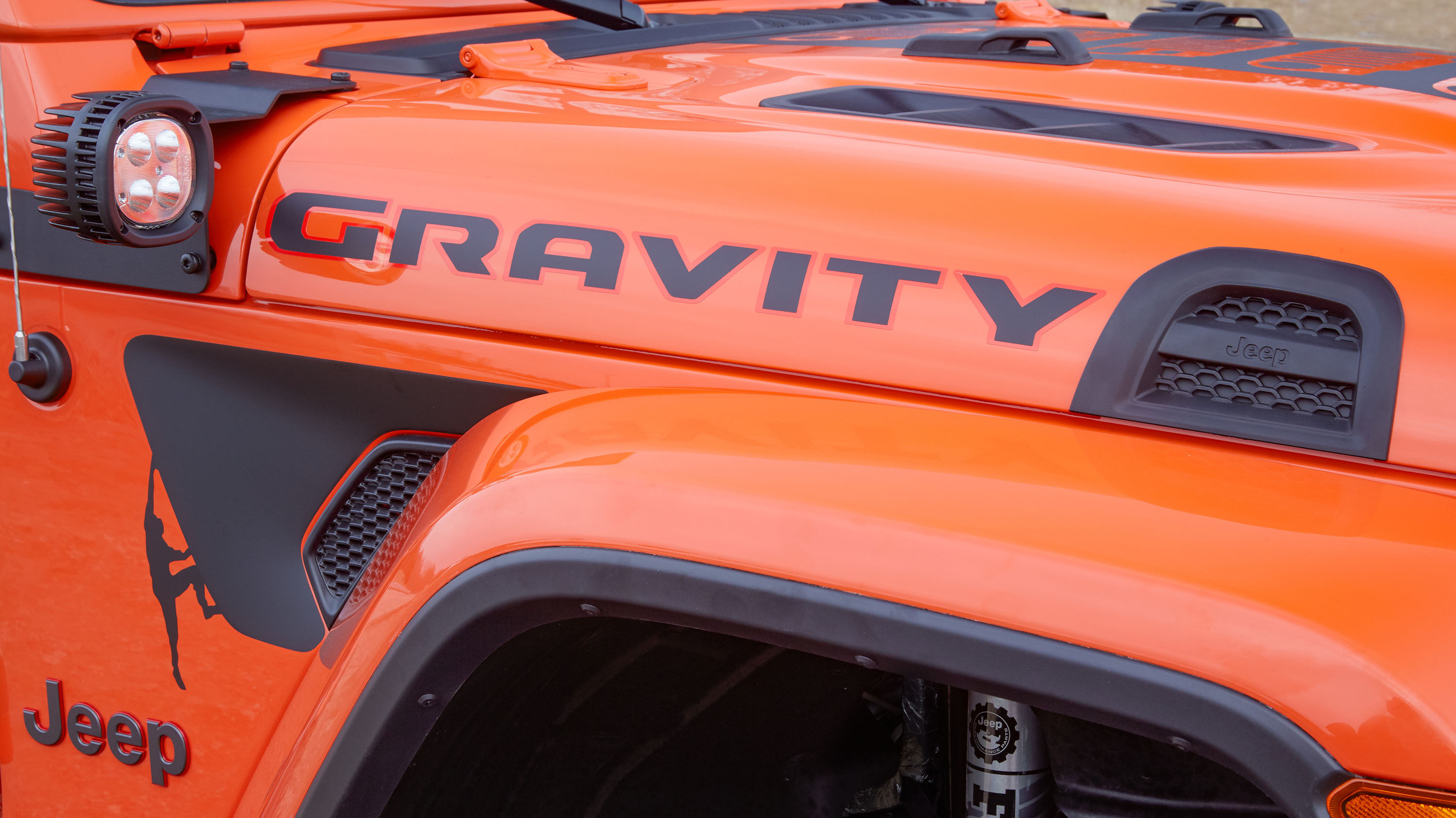 The Jeep Gladiator Gravity, even though being called a concept, is basically a vehicle that a Gladiator owner can build themselves using the JPP catalog. Some of the parts showcased on the Gravity are heavy-duty rock rails that are coated in a bed liner material, two-inch round steel tube doors that were featured on the Moparized Jeep Gladiator, tie down straps that help secure the windshield and a new mesh sunbonnet that provides cover while off-roading in the Moab sun.