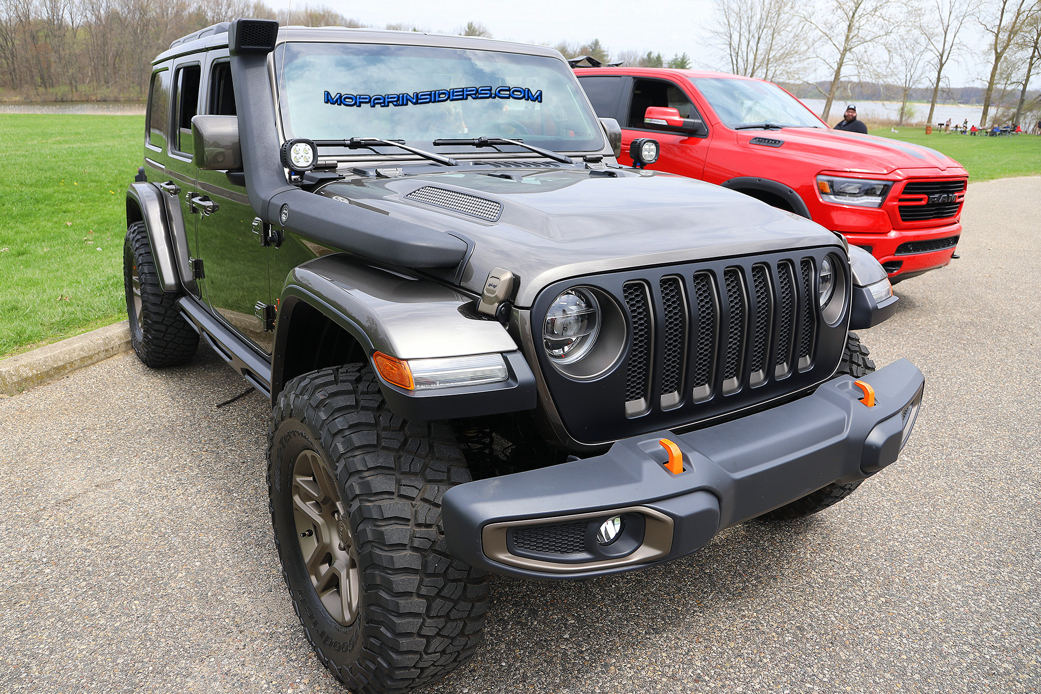 The Jeep Performance Parts team started with a 2018 Jeep Wrangler Unlimited Sahara which is painted in a conceptual “Warm Neutral Grey”. The J-Wagon is complemented with subtle Brass Monkey touches throughout the exterior of the vehicle. The J-Wagon features a Jeep Performance Parts hood designed with a cutout kit to work with the available snorkel. The aftermarket hood latches have the Willys Logo and are highlighted in Brass Monkey color.