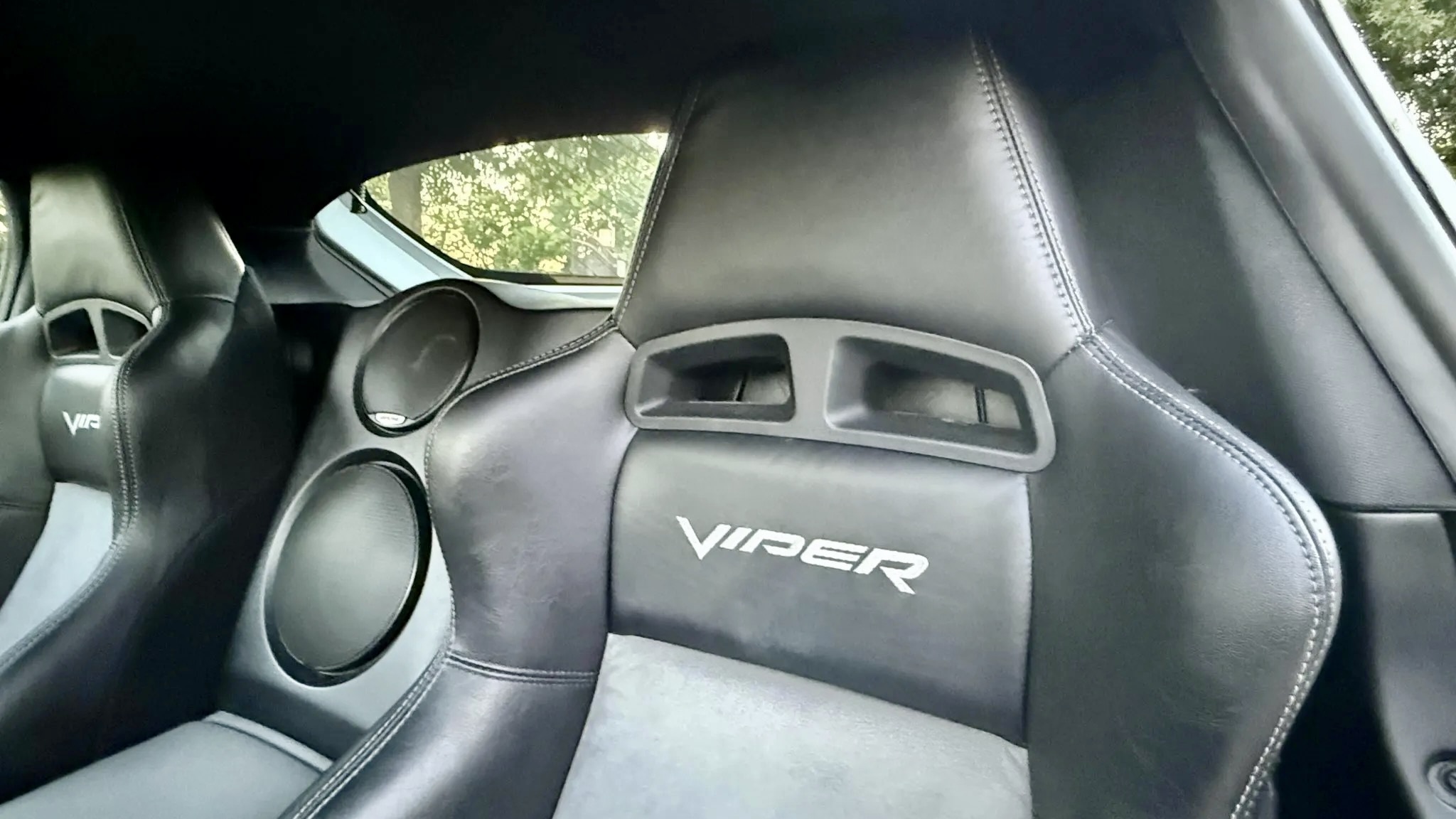 The car’s signature long hood, bold stripes, and side-exit exhausts make it instantly recognizable as a Viper. The HID headlights, fog lamps, and sculpted hood scoop complement the aggressive design. It rides on polished 18-inch front and 19-inch rear five-spoke alloy wheels, now fitted with Continental ExtremeContact Sport 02 tires installed in September 2025. Viper-branded calipers over ventilated rotors handle braking duties, and the brake fluid was flushed simultaneously. The original Michelin Pilot Sport tires are included in the sale.