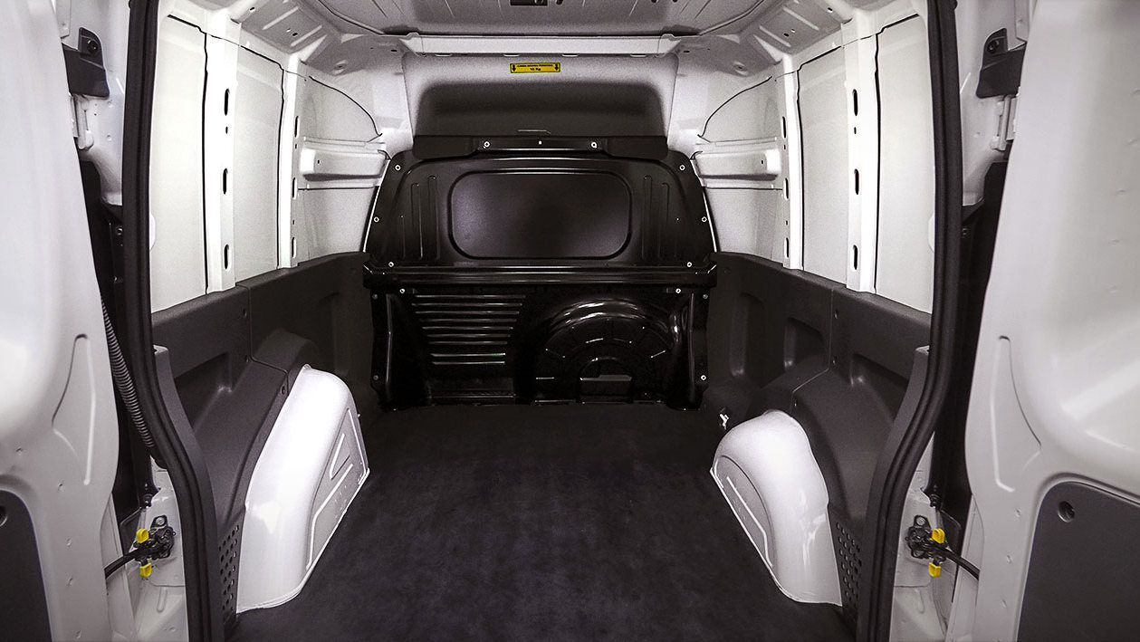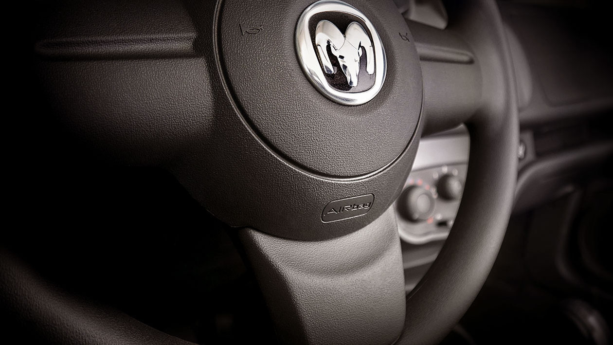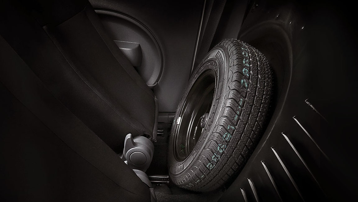 A spare tire is included with the ProMaster Rapid. The awkward placement of the spare tire behind the passenger seat confuses us.