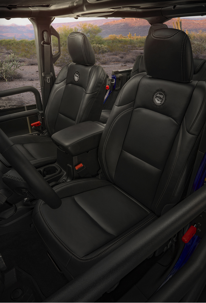 Inside, the limited-edition JPP 20 allows customers to choose from a set of Katzkin Tuscany leather seats with embroidered JPP logos, Mopar all-weather floor mats, and a Mopar Cargo Tray Kit for the second row to protect the cargo compartment and seat backs.