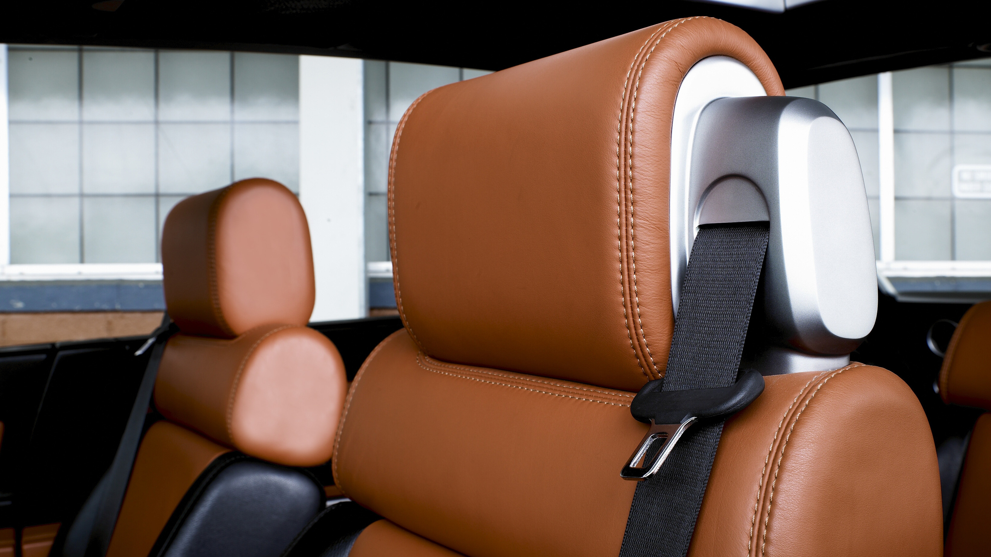 Additional storage appeared ahead of the drop-open center stack control module and within the lower door trim panels. Seating was finished in Bark Black and Firewood Orange premium leather, while the floor featured a durable spray-on coating with integrated non-slip heel pads.