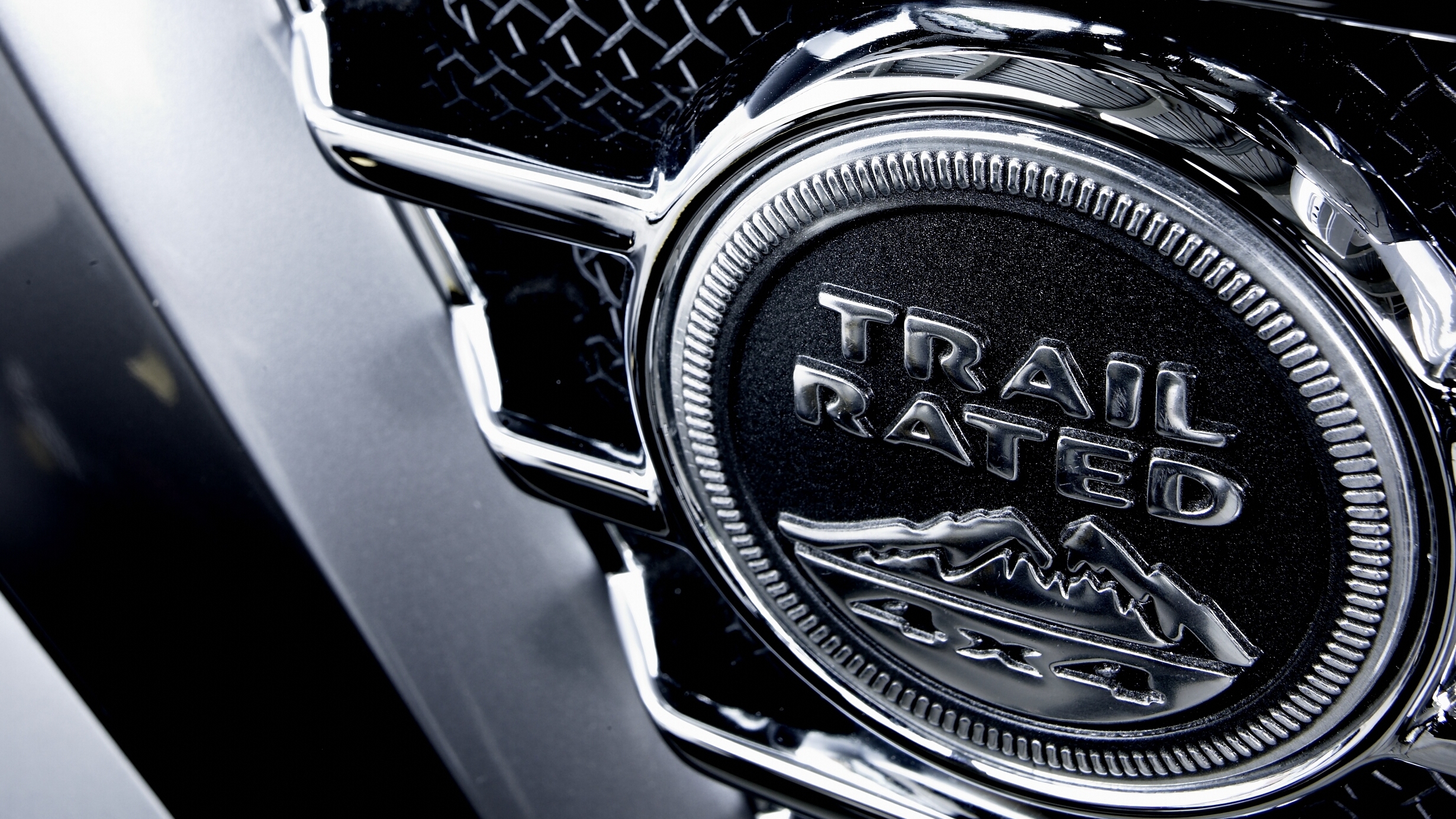 Rolling stock consisted of massive 22-inch five-spoke wheels wrapped in 34-inch tires, each accented by a red stripe that echoed the red-painted exposed brake calipers. The lower body flared outward along the door bottoms, intersecting the wheel arches crisply. Beneath this element sat a recessed running board with silver accent trim. A tall trapezoidal vent at the front fender-to-door cutline housed the iconic Trail Rated badge.