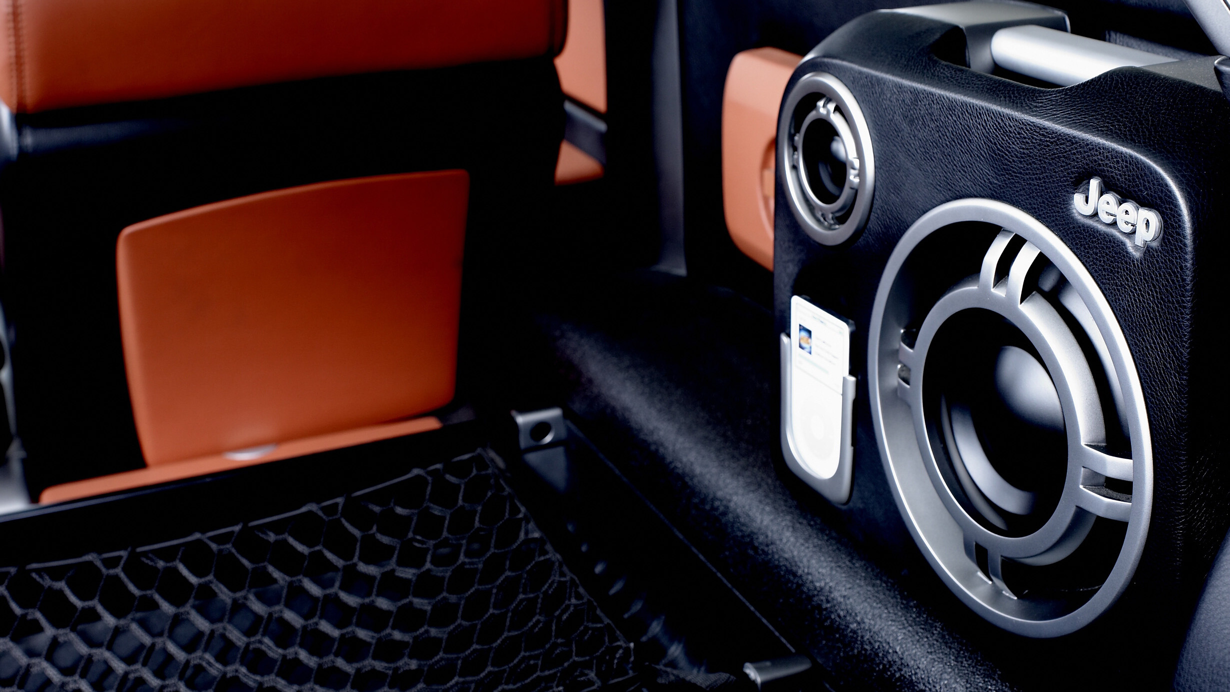 In the cargo area, removable portable audio pods were housed in each rear quarter panel—an idea that would later reappear on the production Jeep Gladiator. Each pod included a dock for an MP3 player, a very on-trend feature for the mid-2000s.