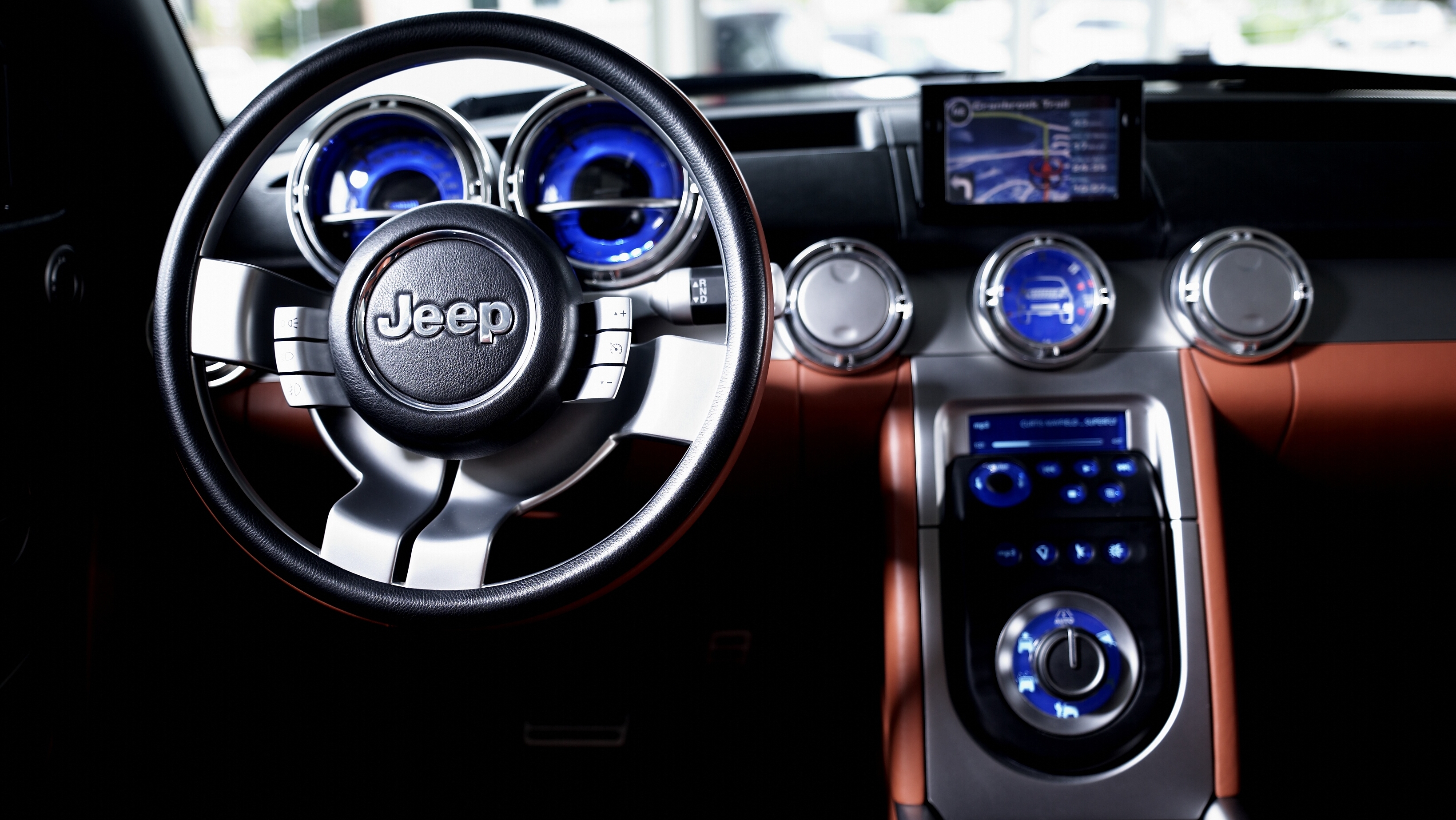 With all glass lowered or removed, the Trailhawk offered an open-air experience comparable to a soft-top Wrangler. A fixed central spine housed overhead lighting and multiple integrated storage bins.