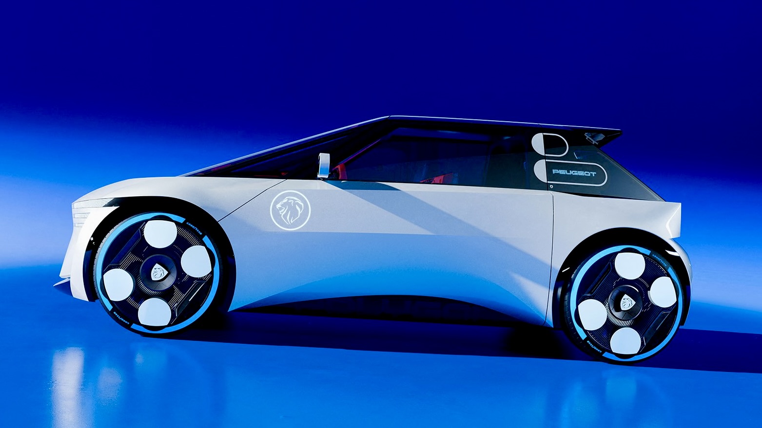 Peugeot’s designers describe the look as “feline,” and it’s easy to see why — the body features muscular haunches and geometric surfacing that make it appear poised, like a crouching cat ready to pounce. Color plays a major role, too: vibrant accents on the wheels, body panels, and even the laser-engraved Goodyear tires bring personality and fun to the exterior.