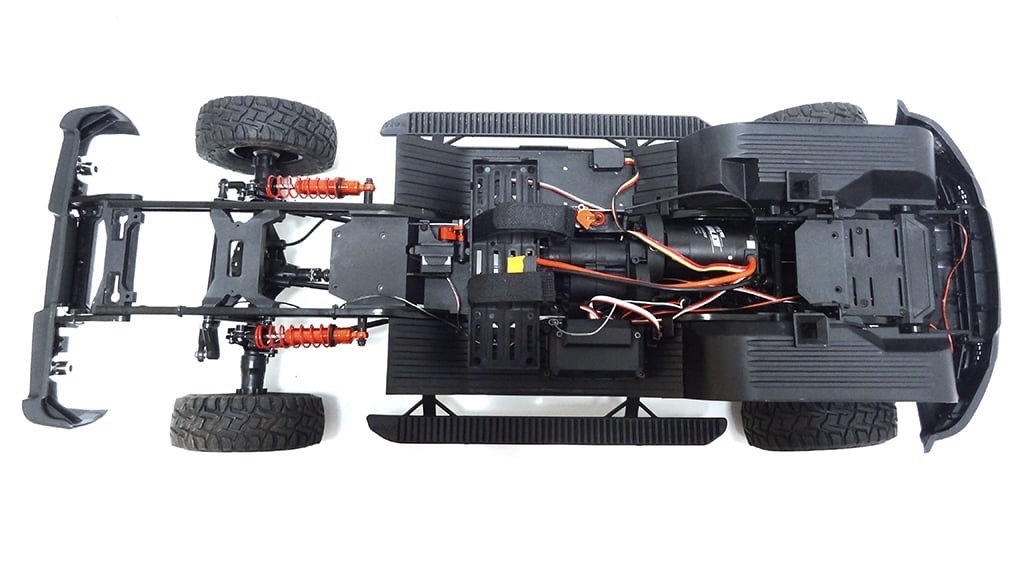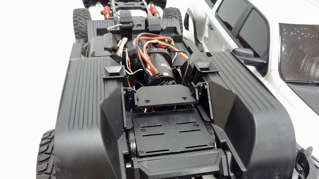 The truck comes with a FlySky G7P computer radio, giving you seven channels of control for not just driving but also operating the lights, diffs, and transmission. Everything is water-resistant, so mud and wet terrain won’t ruin your fun. All you need to add is your own LiPo battery (2S or 4S), a charger, and four AAs for the transmitter.
