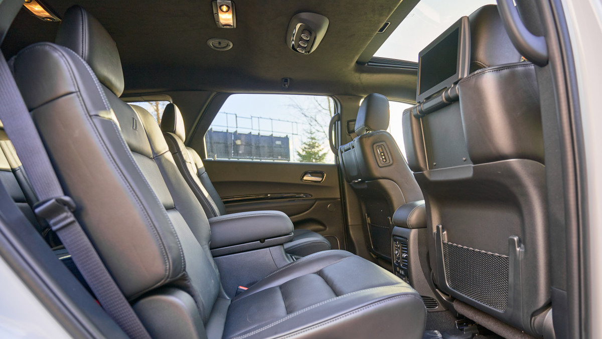 Inside, the Citadel follows the Durango R/T’s content, but adds Nappa leather seats with the Dodge rhombi or ‘//‘ embroidered on the backs, ventilated front seats, a wrapped instrument panel (I/P) with accent stitch, Dinamica suede headliner, Crypto Sweep interior accents with laser etching, liquid titanium painted speaker covers, and a 2nd-row console.