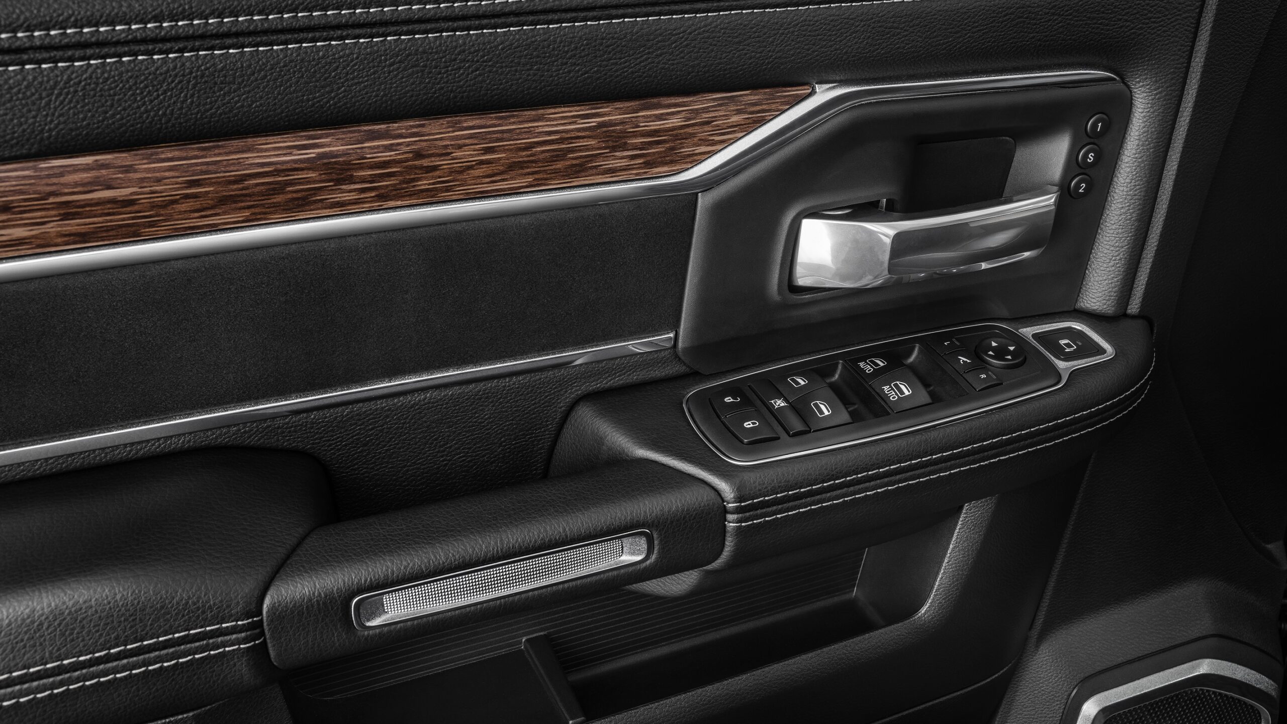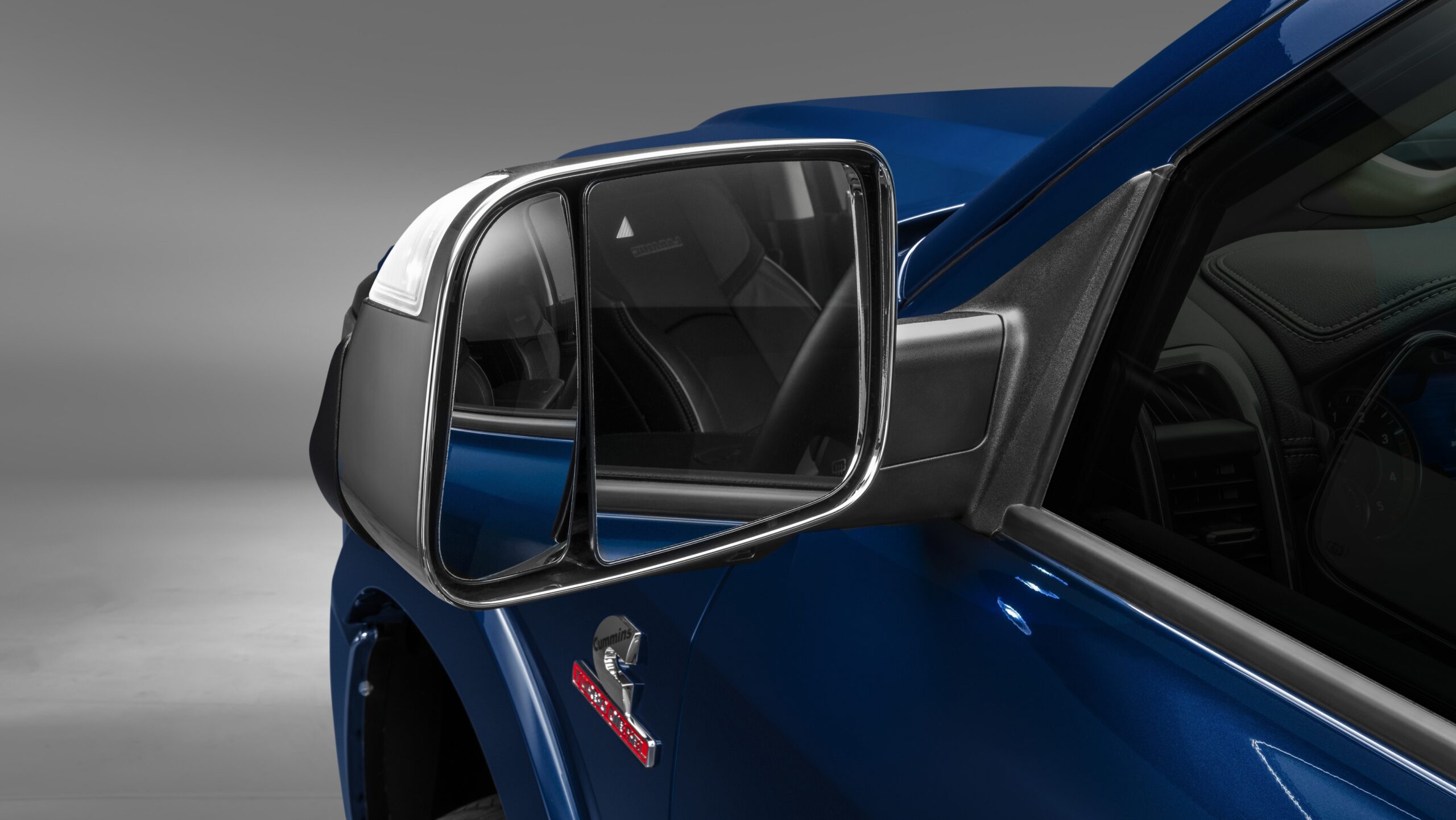 Another novelty feature is the new blind-spot monitoring system, which works with visual alerts in the side rear-view mirrors (and can be equipped with an audible tone). Speaking of the exterior mirrors, Ram engineers redesigned them, making them electrically foldable with longer arms which allows them to be placed vertically in addition to the traditional horizontal position. There are newly added courtesy lights under the arms of the mirrors, that allow the driver to illuminate around the vehicle for those nightly trailer hookups.