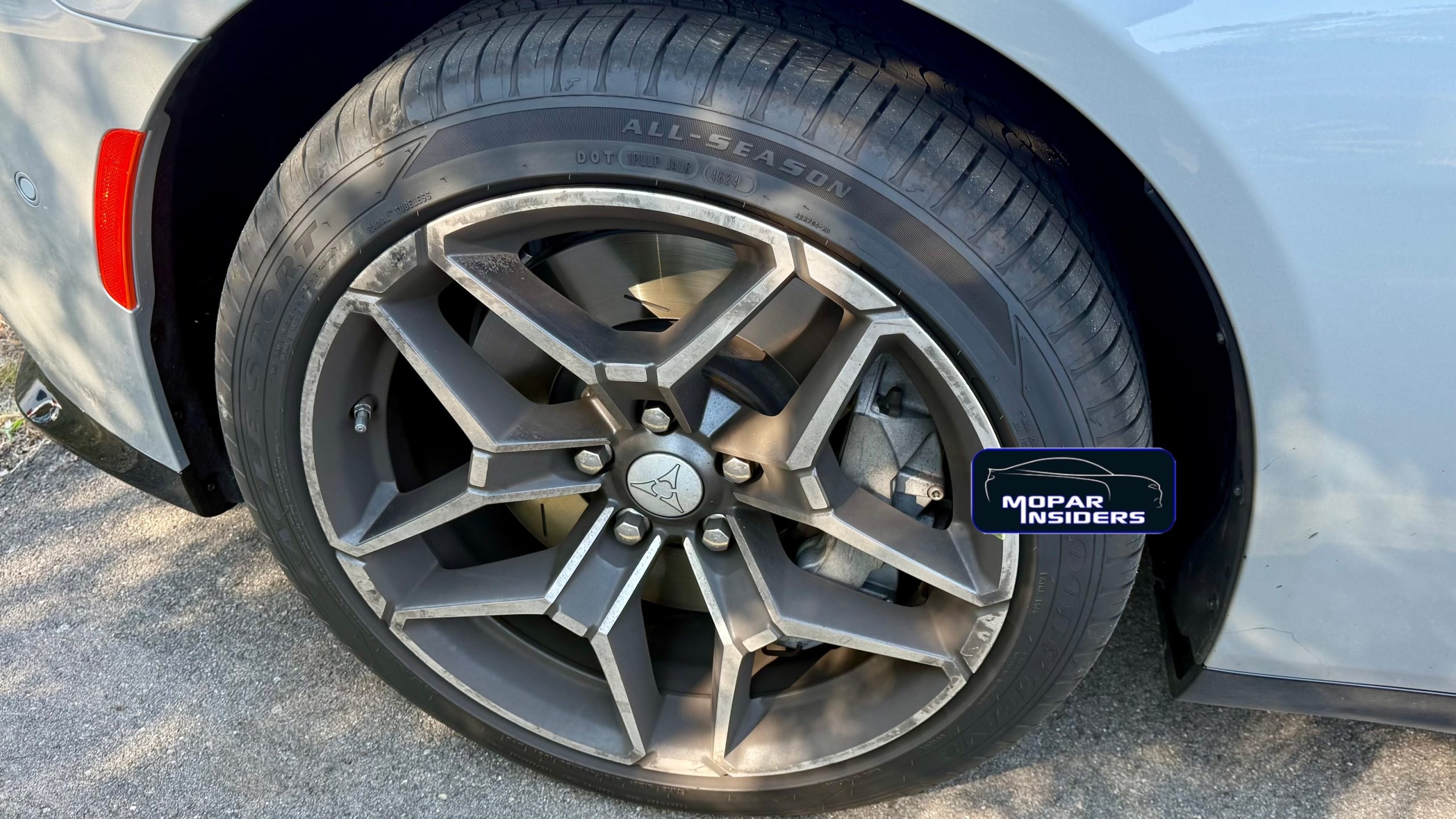 The Scat Pack cues stood out immediately: a rear spoiler, Brembo® brakes with 6-piston calipers up front and 4-piston calipers in the back, and that familiar widebody stance. Painted in Triple Nickel and sitting on 20-inch x 10-inch Diamond Cut/Baltic wheels wrapped in 275/40ZR20 Goodyear Eagle Sport All-Seasons, this test car still carried the attitude of a proper muscle sedan.