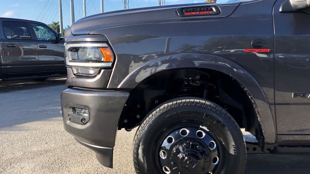 The Ram Heavy Duty Night Editions, includes a monochromatic design enhanced by a black grille with body-colored surround, black badging and black 20-inch aluminum wheels. For the first time, Ram Heavy Duty trucks equipped with dual rear wheels now get 17-inch black wheels with machined pockets. The headlamps and taillights feature dark bezels.
