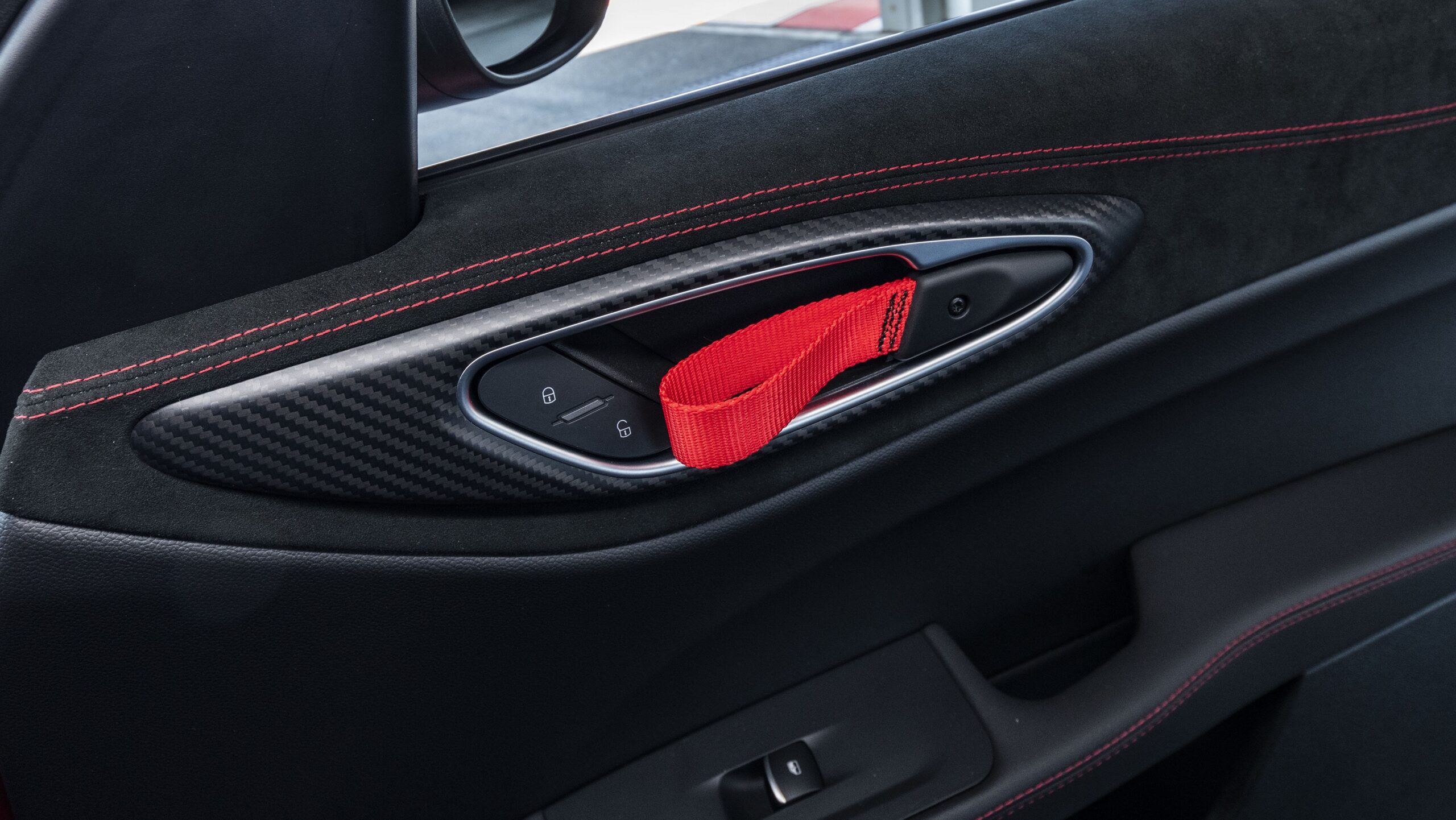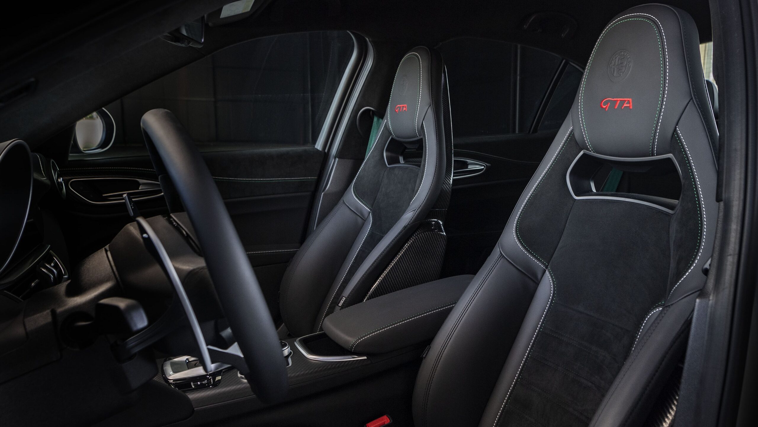 Under the hood, the aluminum 2.9-liter twin-turbocharged V6 returns and gets a 30 horsepower boost to 540 horsepower for GTA duty. Alfa Romeo engineers also worked with Akrapovič (maker of the new titanium exhaust) to give the GTA its own distinctive sound. With a weight reduction of 221 pounds (100 kilograms) compared to the standard Giulia Quadrifoglio and the horsepower boost from its tuned motor, the GTA can hit 62 mph (or 100 kph) in just 3.6-seconds.