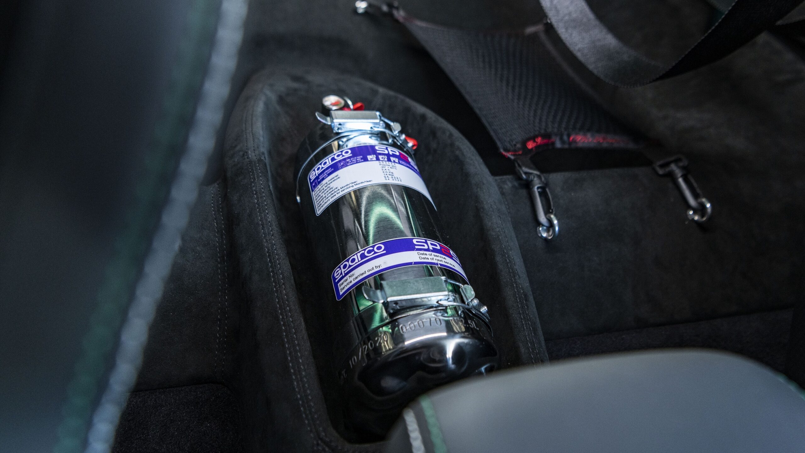 Inside the car, several new details stand out at you. The first is the trim of the dashboard, door panels, glove compartment, side pillars, and the central trim on the seats are done in 100% Alcantara®. If you jump into a more track-oriented GTAm, Alcantara is used more extensively. Taken a note from the 2018 Dodge Challenger SRT Demon, the GTAm rear moves the rear bench seat, leaving room for a fully Alcantara upholstered “basin” which is made to hold your racing helmet and a fire extinguisher. The new matte carbon inserts endow the interior with a distinctive technical and aesthetic elegance. In the new GTAm, the interior is unique in that it features a roll bar, no door panels or rear seats, and the door is opened with a belt in place of the handle, another touch that comes from the racing world.